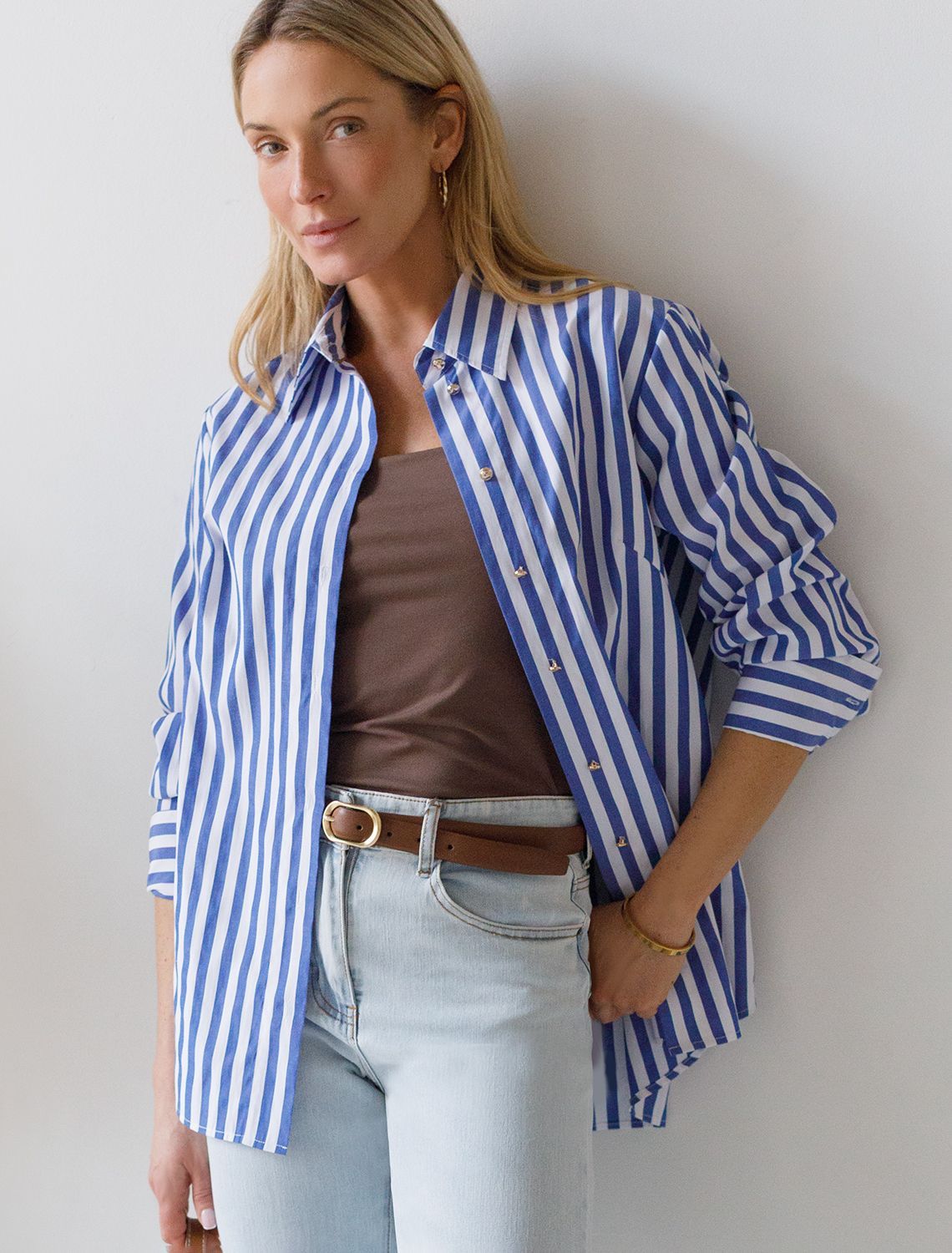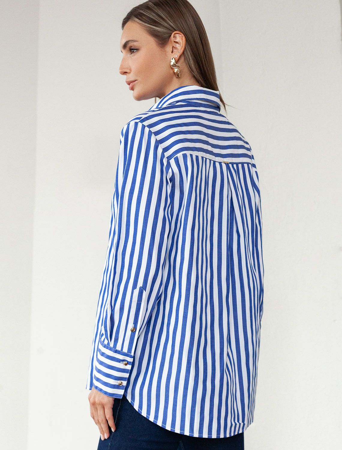 Блузка свободного силуэта с золотистыми пуговицами D29.274 белый-синий