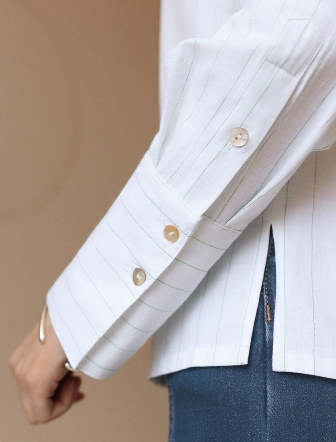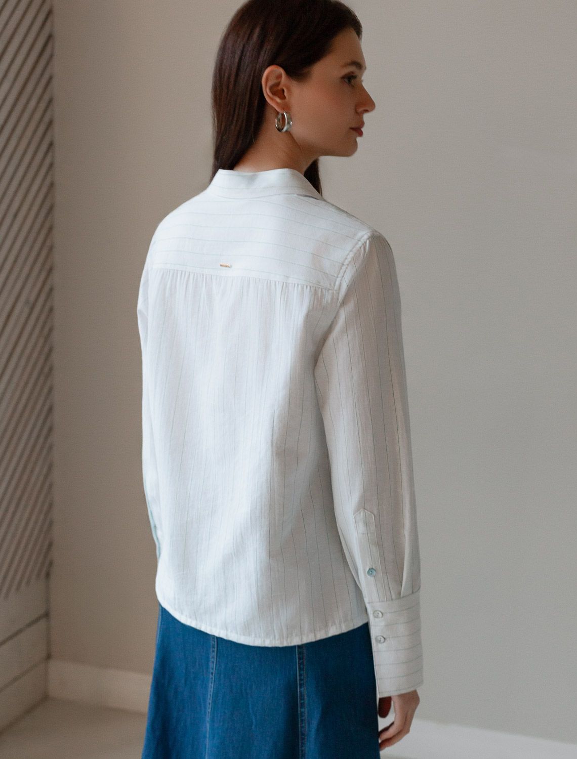 Блузка свободного силуэта белого цвета в светло-оливковую полоску из хлопка с добавлением льна идеально подходит для теплого сезона и порадует всех, кто ценит комфорт и стиль. Натуральный материал плотностью 104 Г/м2 обеспечивает приятное ощущение на теле и хорошо пропускает воздух, что особенно важно летом и весной. Блузка с длинным рукавом обладает высокой износостойкостью, что позволяет сохранять привлекательный внешний вид даже при регулярном использовании. Ткань хорошо держит форму после стирки и надолго остается аккуратной. Эластан в составе обеспечивает отличную посадку на любую фигуру. Классическая рубашка с отложным воротником и широкими манжетами формирует актуальный образ, подходящий как для работы, так и для повседневных прогулок. Пуговицы на планке добавляют практичности и позволяют регулировать степень открытости, что также способствует созданию различных вариантов ношения, например, в качестве второго слоя. Прямой свободный крой рубашки не сковывает движения и создает ощущение легкости, а принт в полоску делает образ выраженным, современным и подчеркивает индивидуальность. Повседневная блузка гармонично сочетается с любыми низами, что делает ее универсальной частью гардероба.