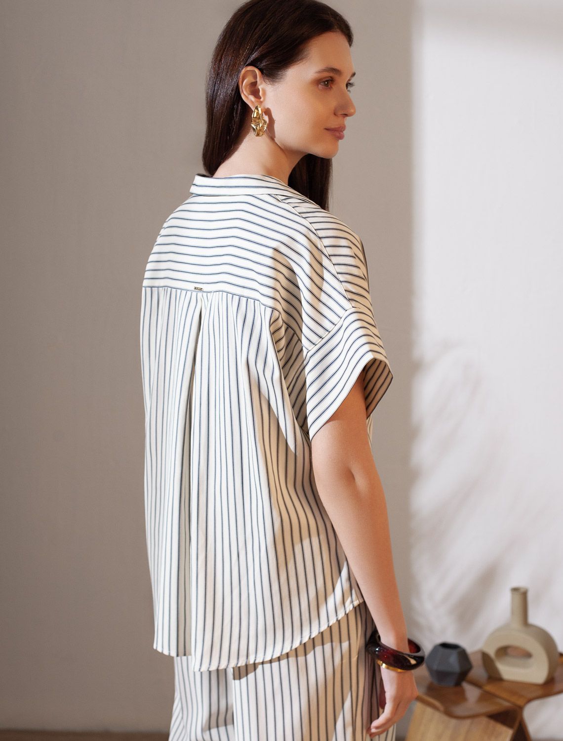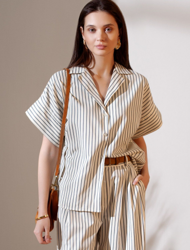 Стильная блузка молочно-синего цвета в полоску с коротким рукавом выполнена из легкого хлопкового поплина плотностью 112 Г/м2. Летняя модель идеально подходит на теплое время года и жаркую погоду. Натуральный состав ткани обладает высокой воздухопроницаемостью, а также способностью поглощать и отдавать влагу. В повседневной свободной блузке будет очень комфортно, благодаря правильной регуляции температуры тела. Удачнный крой, отложной воротничок и принт в полоску визуально вытяговают силуэт и помогают скрывать возможные недостатки фигуры. Цельнокроеные короткие рукава добавляют удобства и легкости, оставляя комфорт на высшем уровне. Такая рубашка отлично впишется в деловой гардероб и подчеркнет вашу уверенность на любом мероприятии. Этот фасон выделяется своей универсальностью, позволяя легко создавать образы для разных ситуаций. Если хотите выглядеть стильно и при этом чувствовать себя комфортно, этот выбор будет идеальным решением.