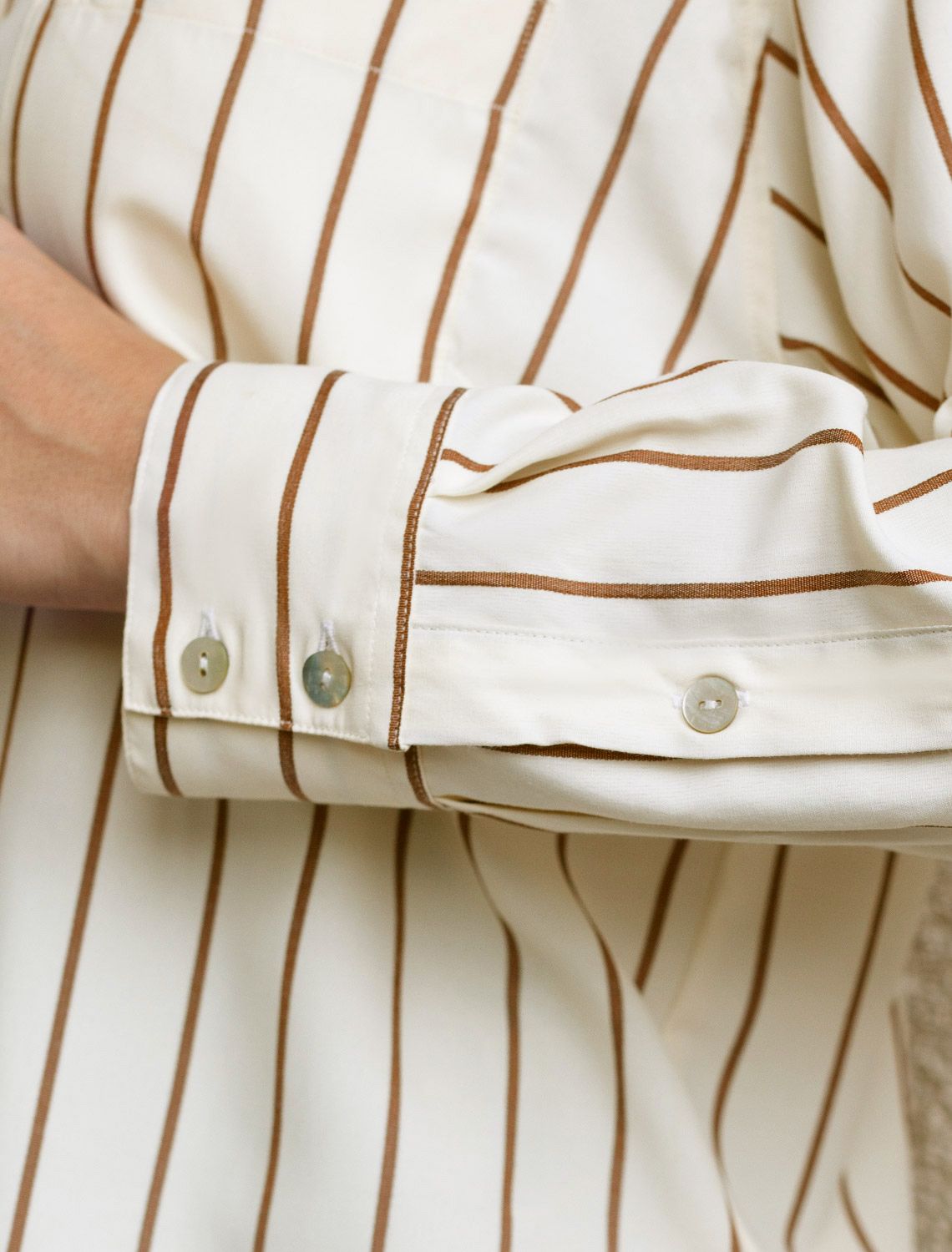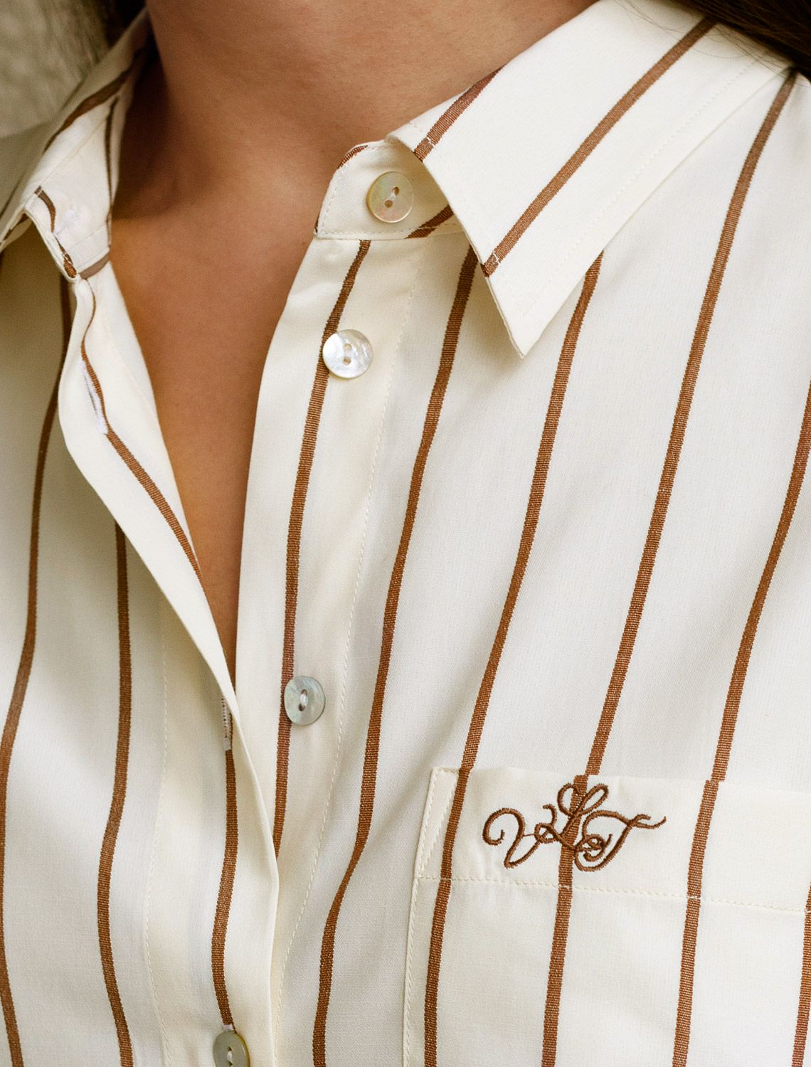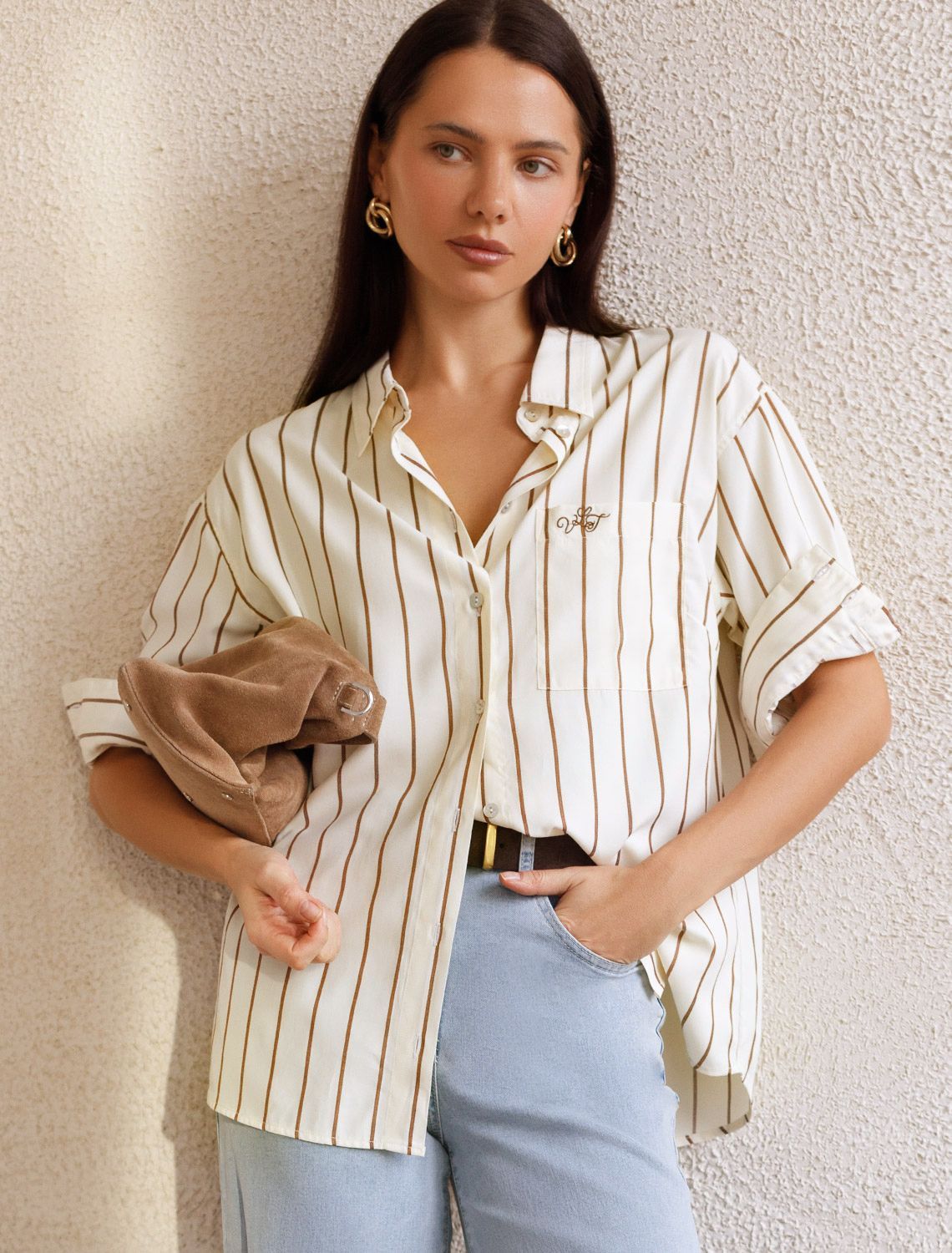 Блузка светло-бежевого цвета в кофейную полоску свободного силуэта отлично подходит для повседневной носки и создания стильных образов. Благодаря хлопку с добавлением эластана ткань хорошо дышит, освежает и подходит для работы даже в жаркое время года. Натуральный материал плотностью 108 Г/м2 не просвечивает и выглядит аккуратно даже после многочисленных стирок. Рубашка отличается удлиненной спинкой, что удобно для разных вариантов сочетания одежды. Карман на груди добавляет функциональности и практичности. Деликатная вышивка на кармане в виде логотипа бренда выглядит изысканно. Принт в полоску визуально вытягивает силуэт, подчеркивая индивидуальность и добавляя стильный акцент. Классический крой блузки и базовая цветовая гамма позволяют вписать эту вещь в любой гардероб, независимо от выбранного стиля — будь то офисная атмосфера или расслабленный выход на прогулку. Отложной воротник аккуратно подчеркивает фигуру и придает образу завершенность. Застежка на пуговицы обеспечивает комфортную регулировку и удобство в использовании. Универсальный фасон рубашки хорошо смотрится на любые размеры, в том числе и большие, скрывает недостатки и выгодно подчеркивает достоинства фигуры.