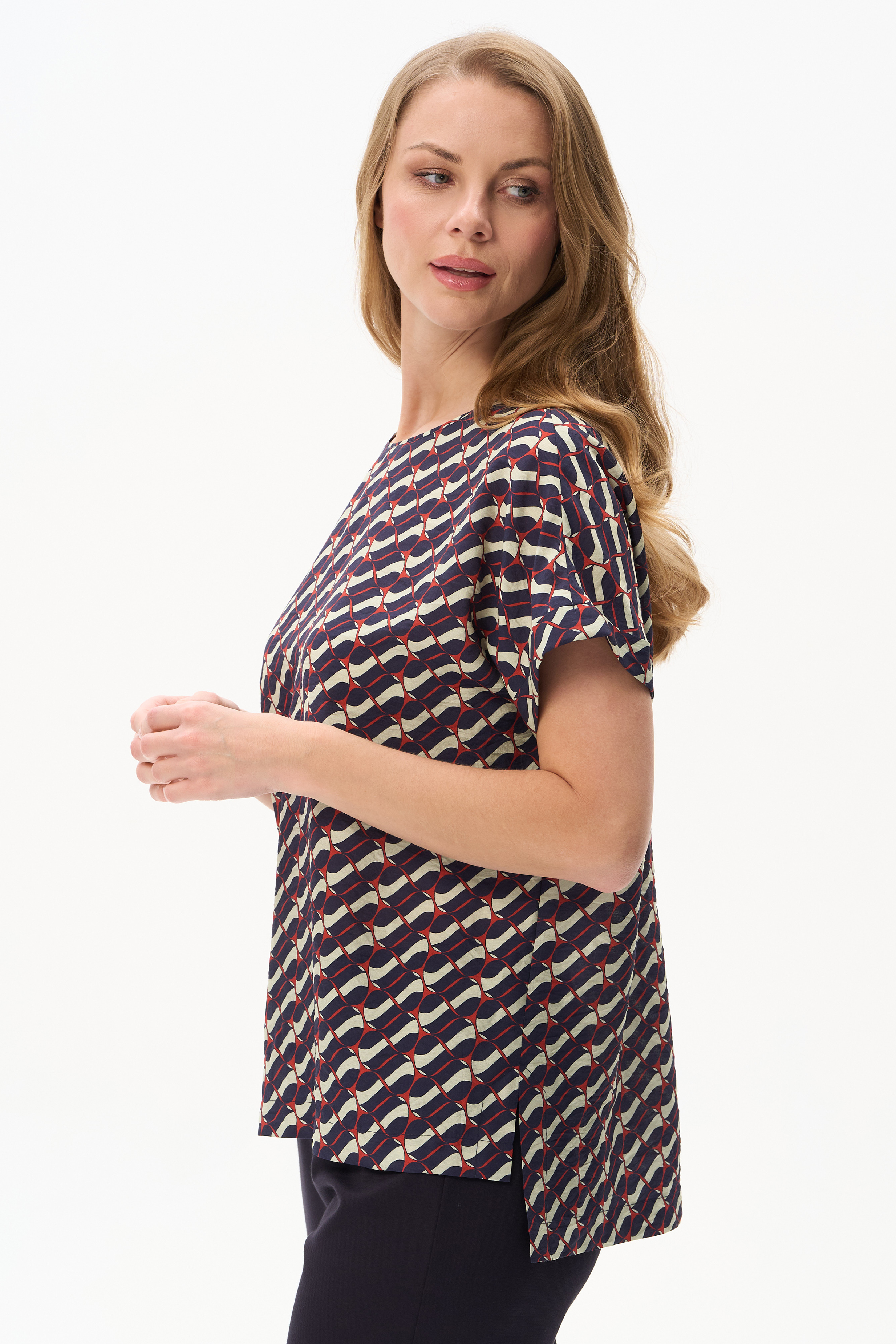 Блузка из легкой плательной ткани с Графическим рисунком в стиле Gucci. Модель с круглым вырезом горловины, цельнокроенные короткие рукава с зафиксированным подворотом, модный неровный низ. Лёгкая, свободная, комфортная блузка для повседневных и нарядных образов. Рост модели 175 см.