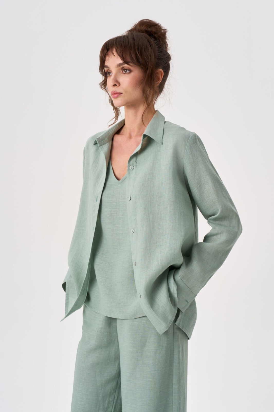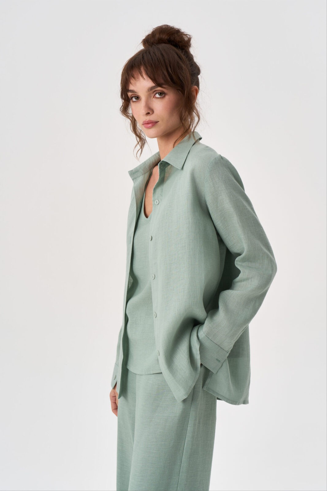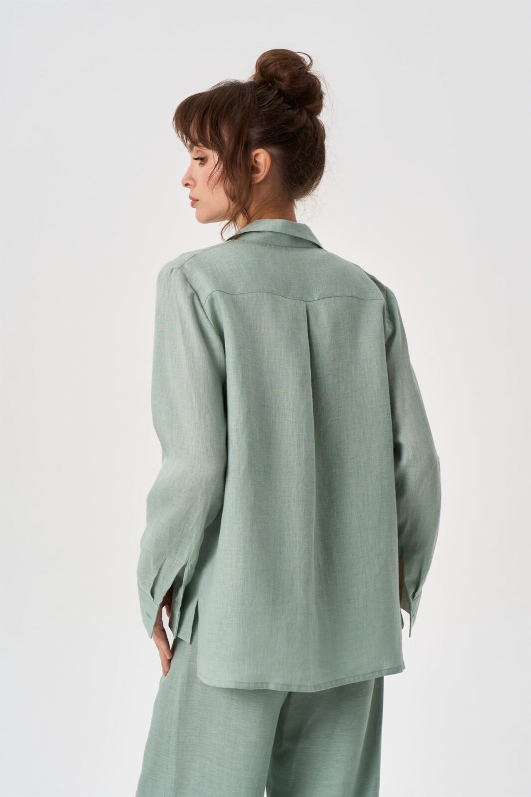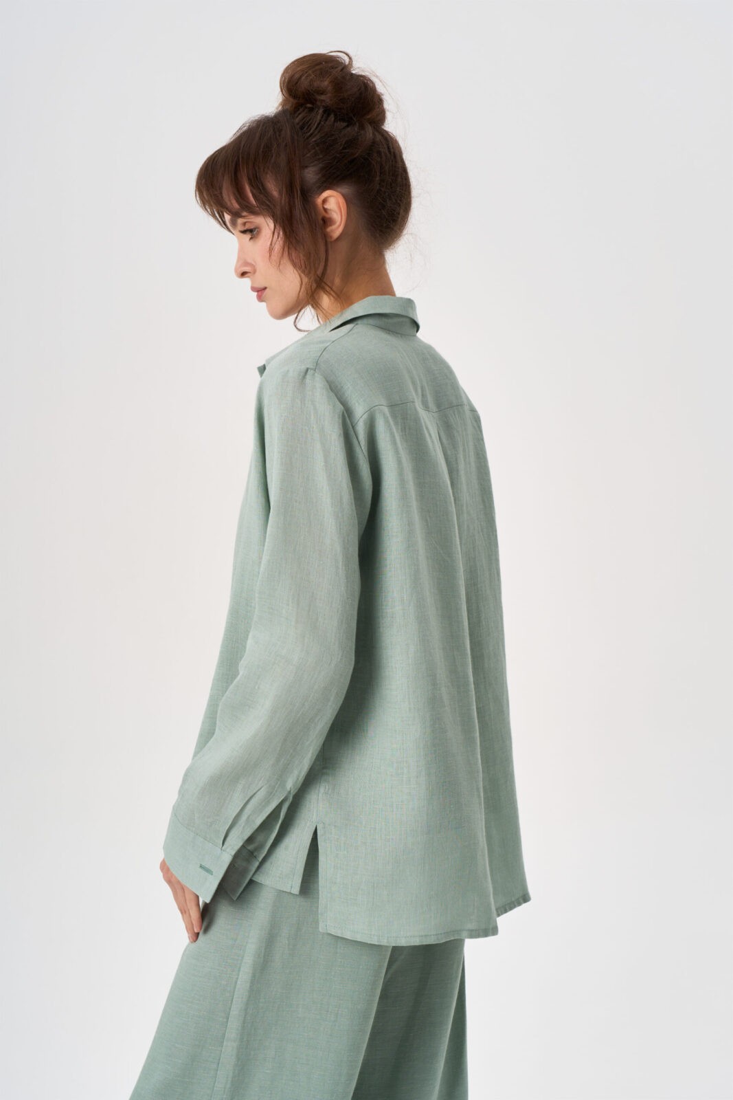 Рубашка женская прямая с удлиненной спинкой. Рукав втачной длинный на манжете. Застежка центральная на пуговицы. Воротник рубашечный на стойке. В боковых швах разрезы.