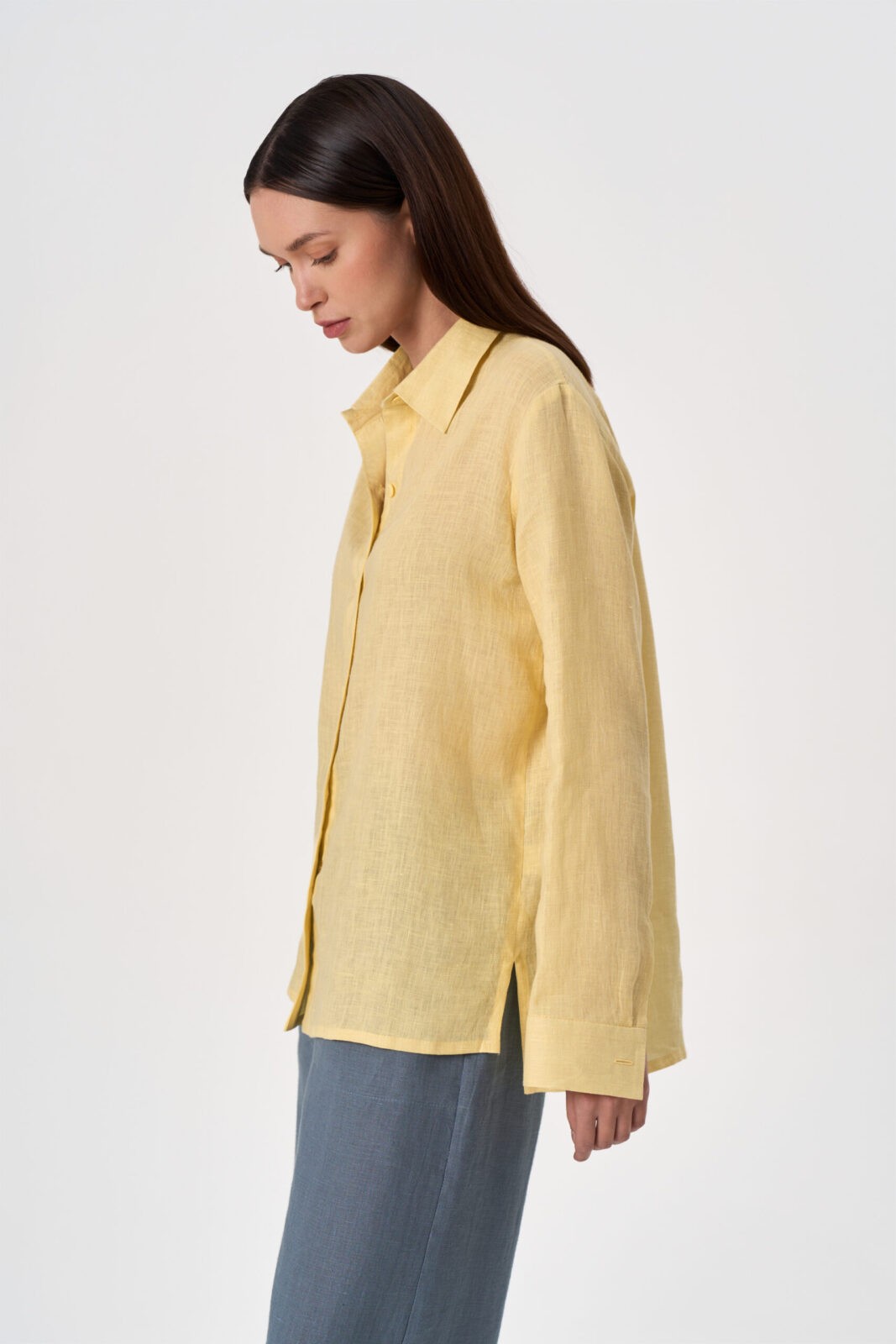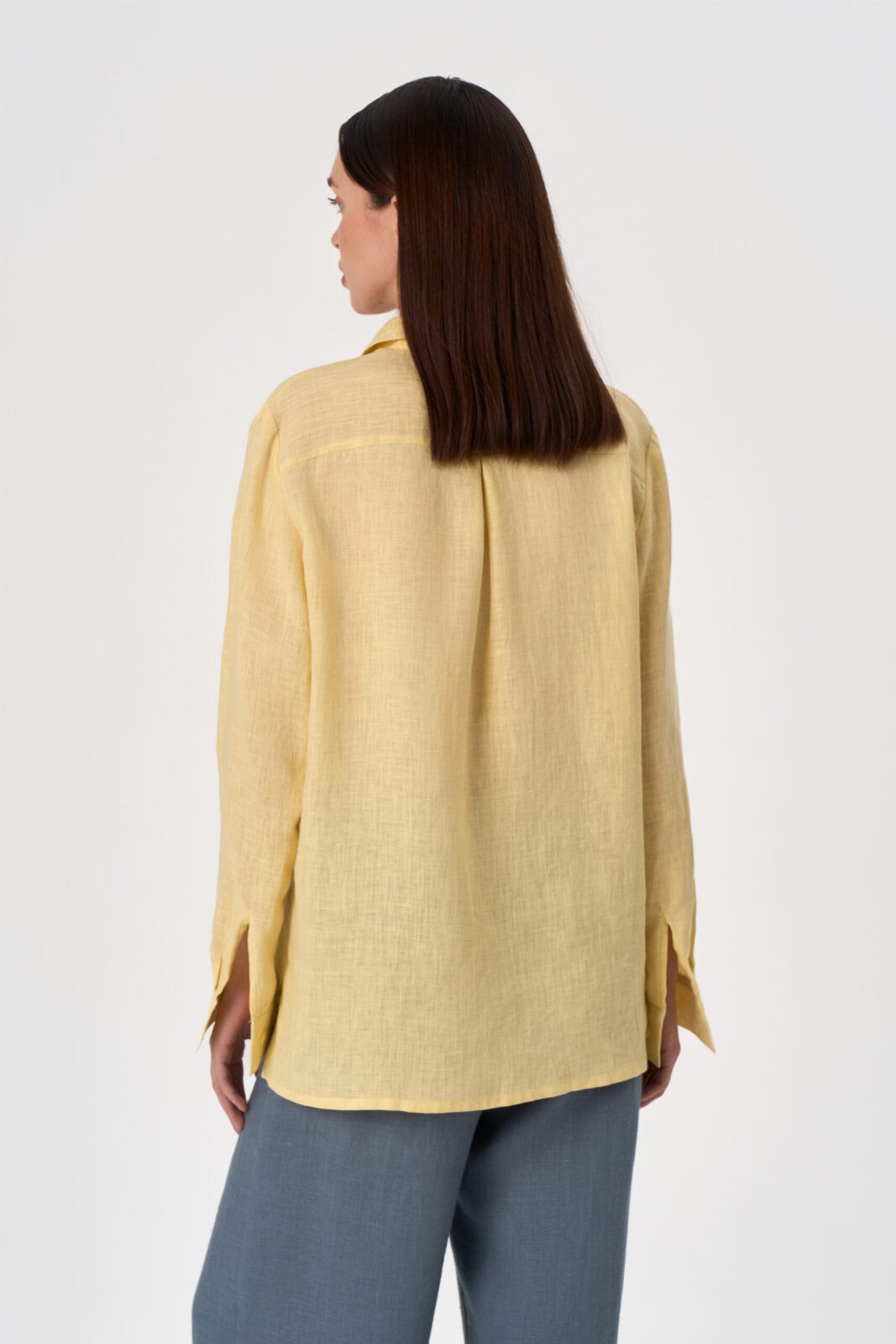 Рубашка женская прямая с удлиненной спинкой. Рукав втачной длинный на манжете. Застежка центральная на пуговицы. Воротник рубашечный на стойке. В боковых швах разрезы.