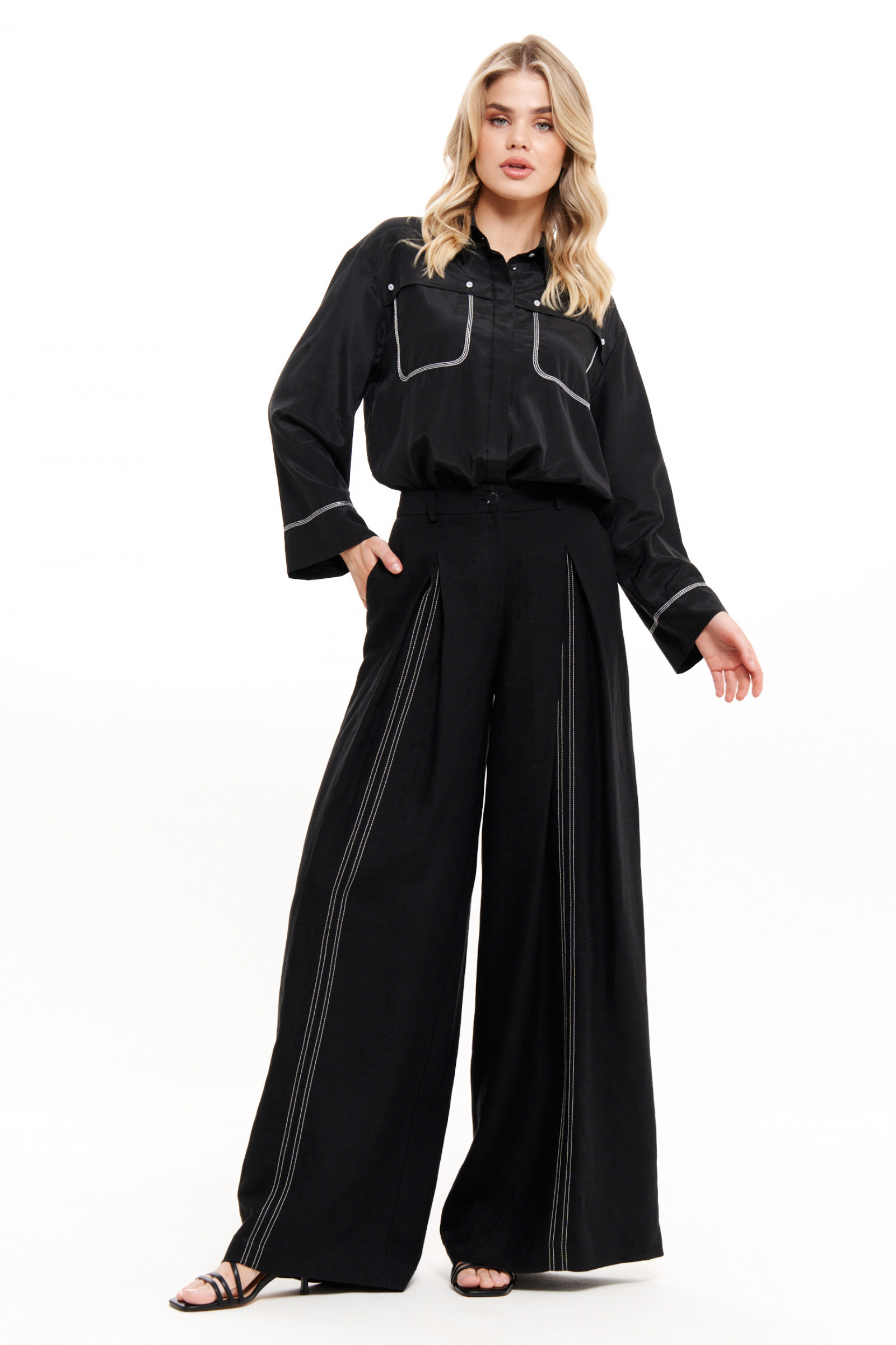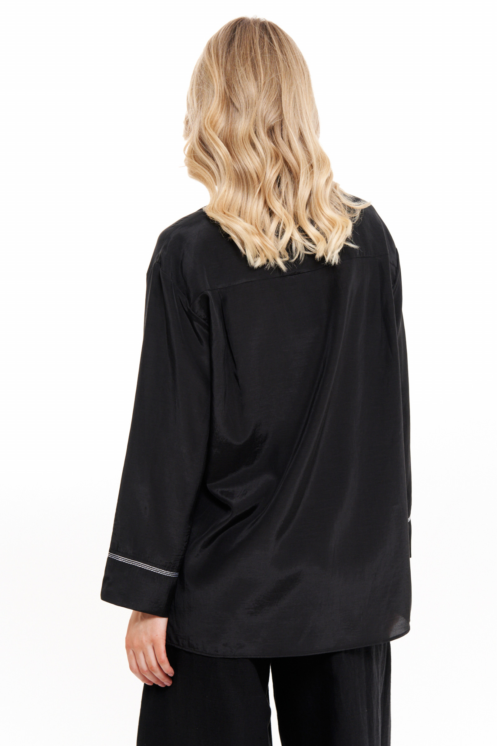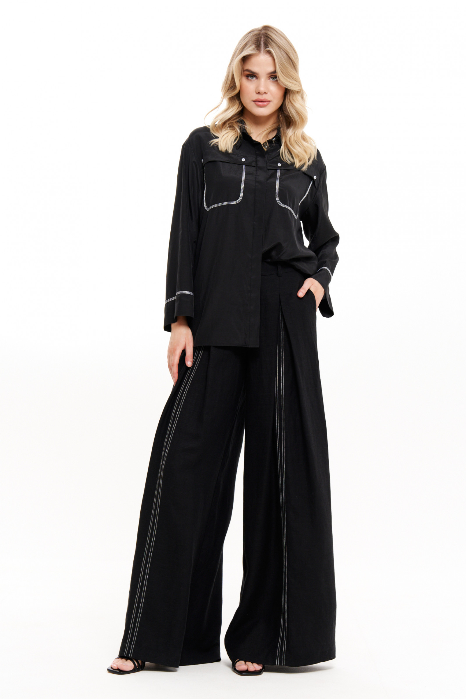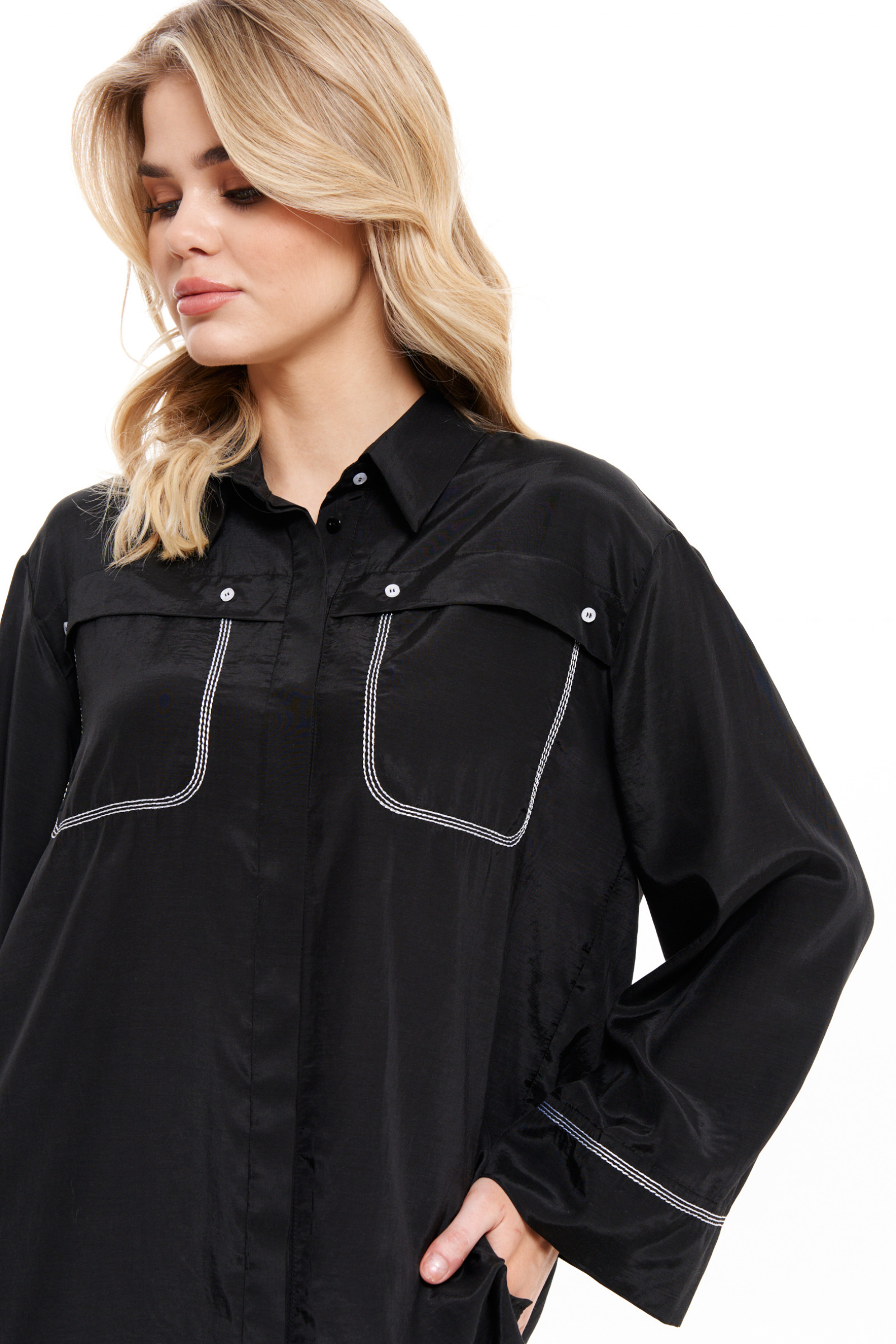 Блузка женская — стильный и модный элемент гардероба, который идеально подойдет как для повседневного ношения, так и для создания нарядного образа. Элегантная рубашка с длинным рукавом выполнена из качественной поливискозной ткани с добавлением хлопка, что делает ее комфортной и приятной к телу. Черный цвет придает модели особый шик, а аккуратная отстрочка и декоративные детали добавляют винтажный и ретро-акцент, подчеркивая женственность и элегантность.
