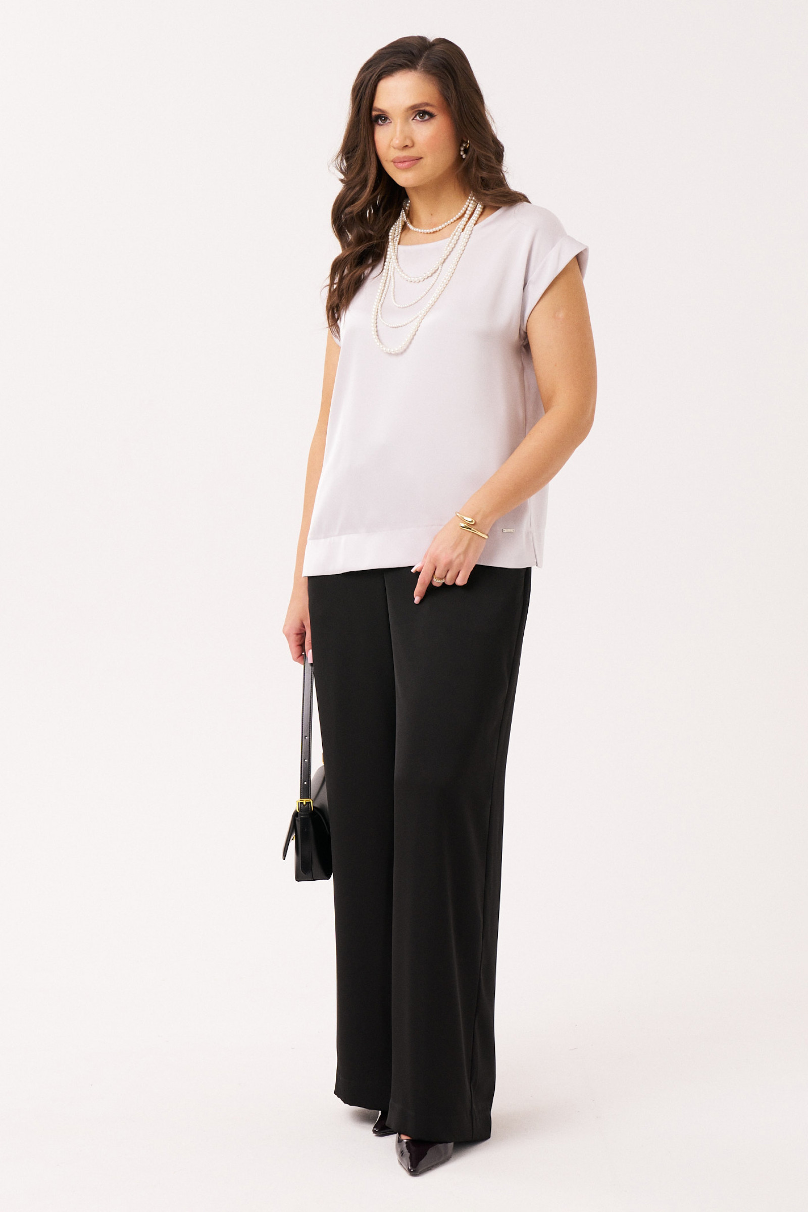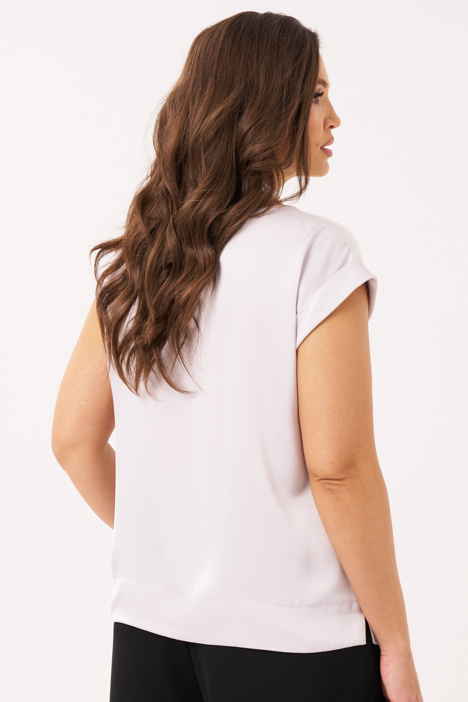 Блузка женская с коротким рукавом выглядит изящно благодаря мягкой ткани с характерным блеском. Она изготовлена из полиэстера и эластана - износоустойчивой и приятной на ощупь ткани, которая легко тянется и хорошо пропускает воздух. Блузка с коротким рукавом, вырезом горловины «лодочка» и аккуратно обработанным низом выполнена в прямом фасоне.