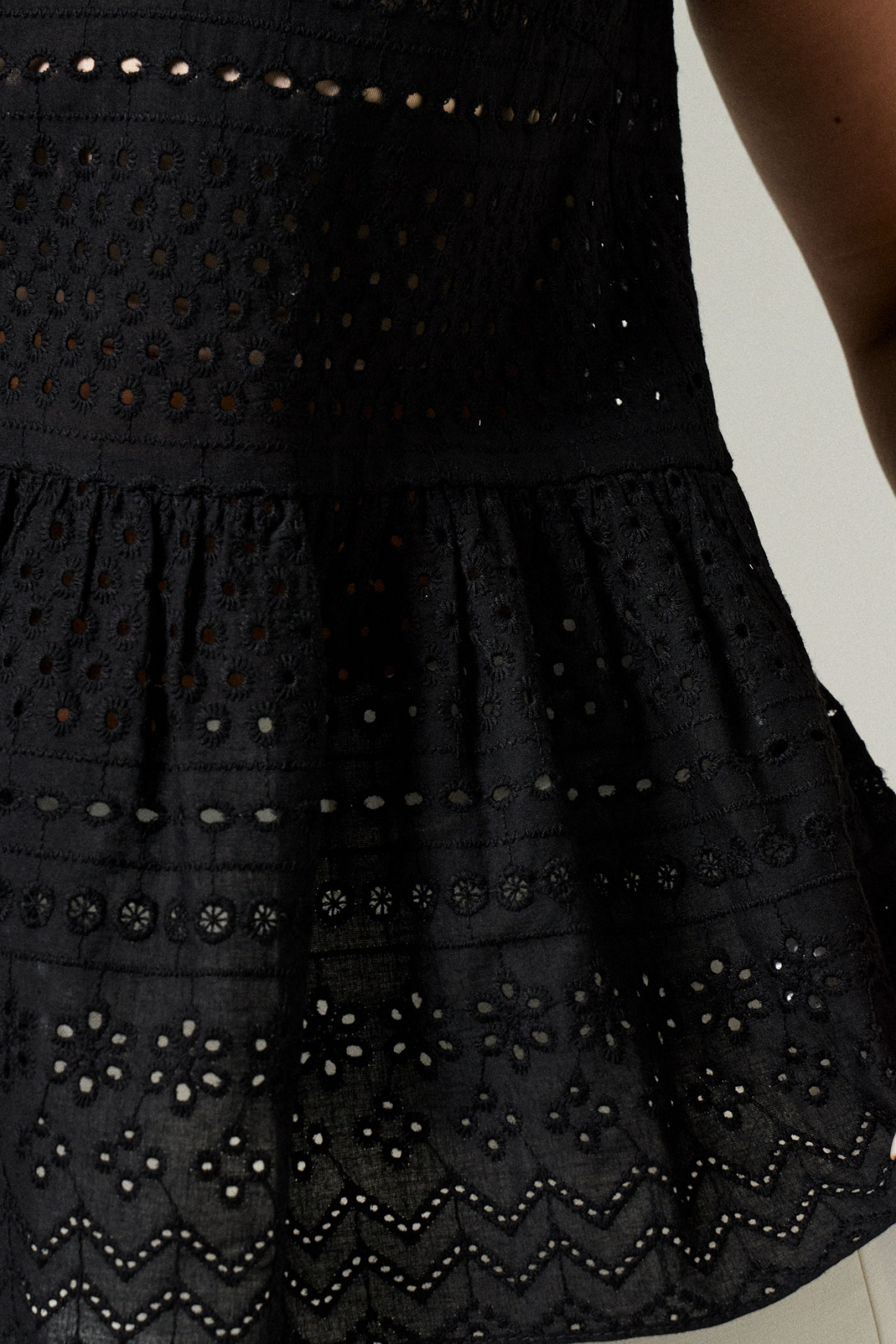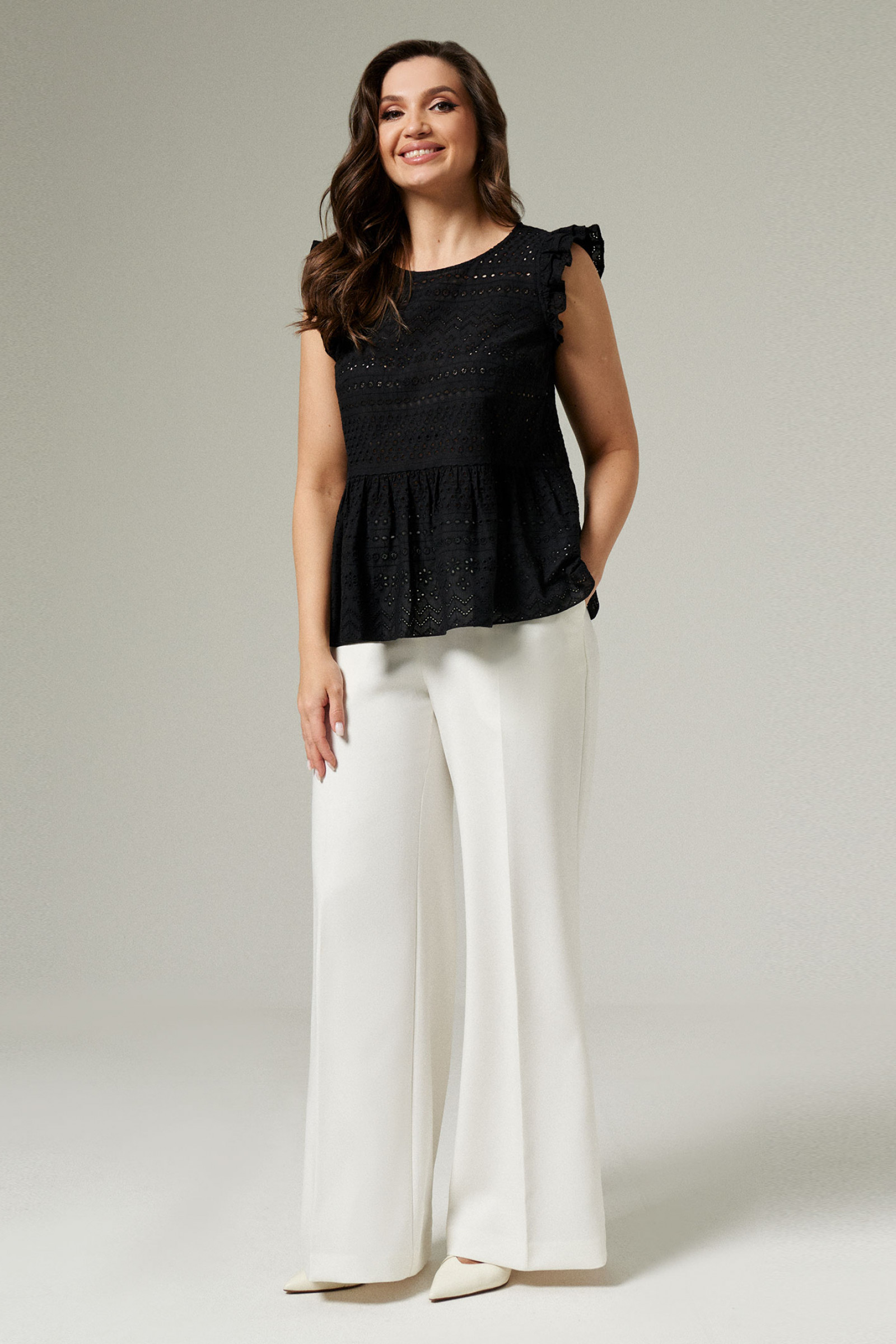 Блуза женская из хлопковой ткани для повседневной носки. Блуза свободного кроя с коротким рукавом, Низ блузы оформлен рюшей. Рукав оформлен рюшей. Горловина круглая.