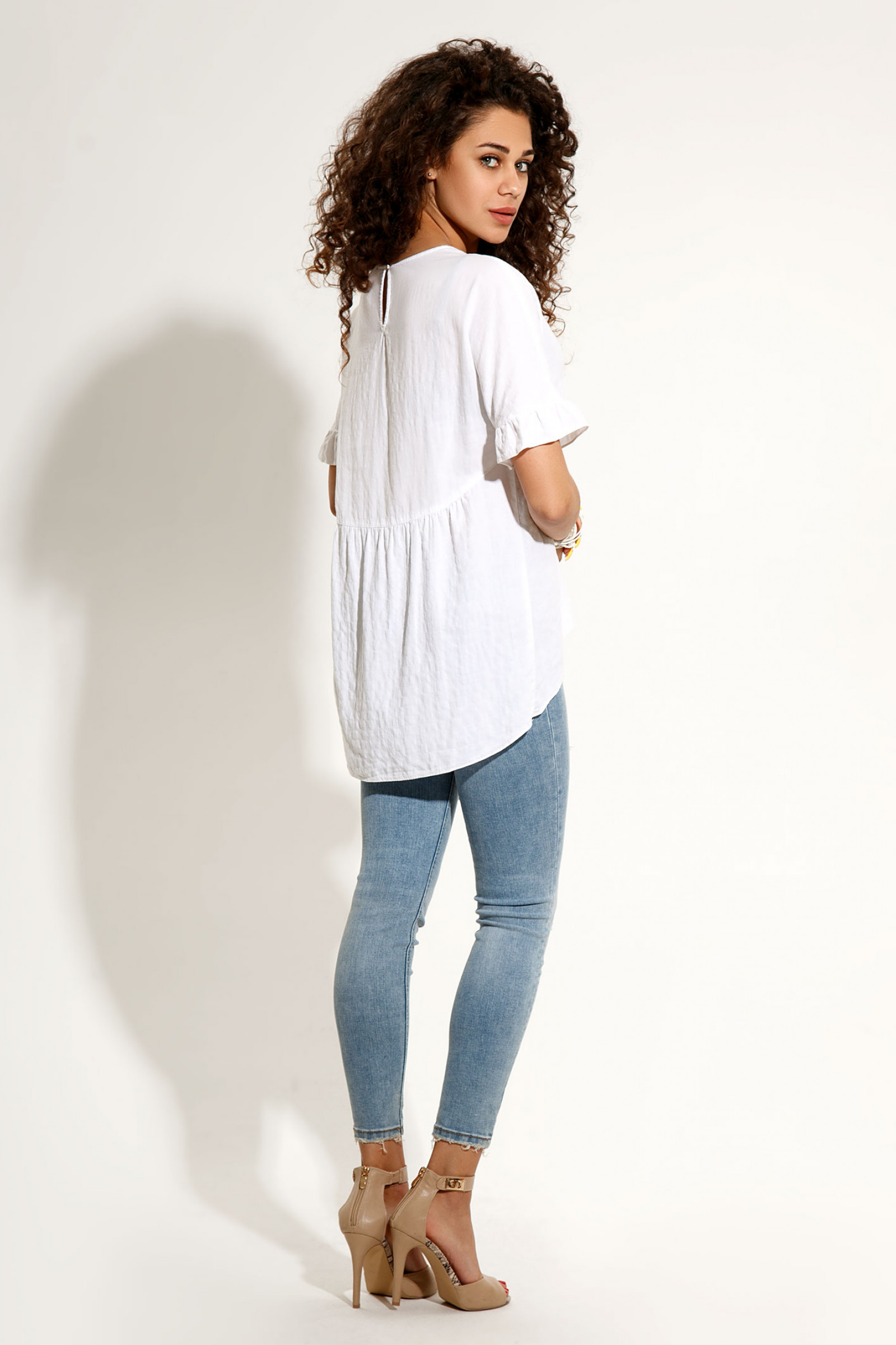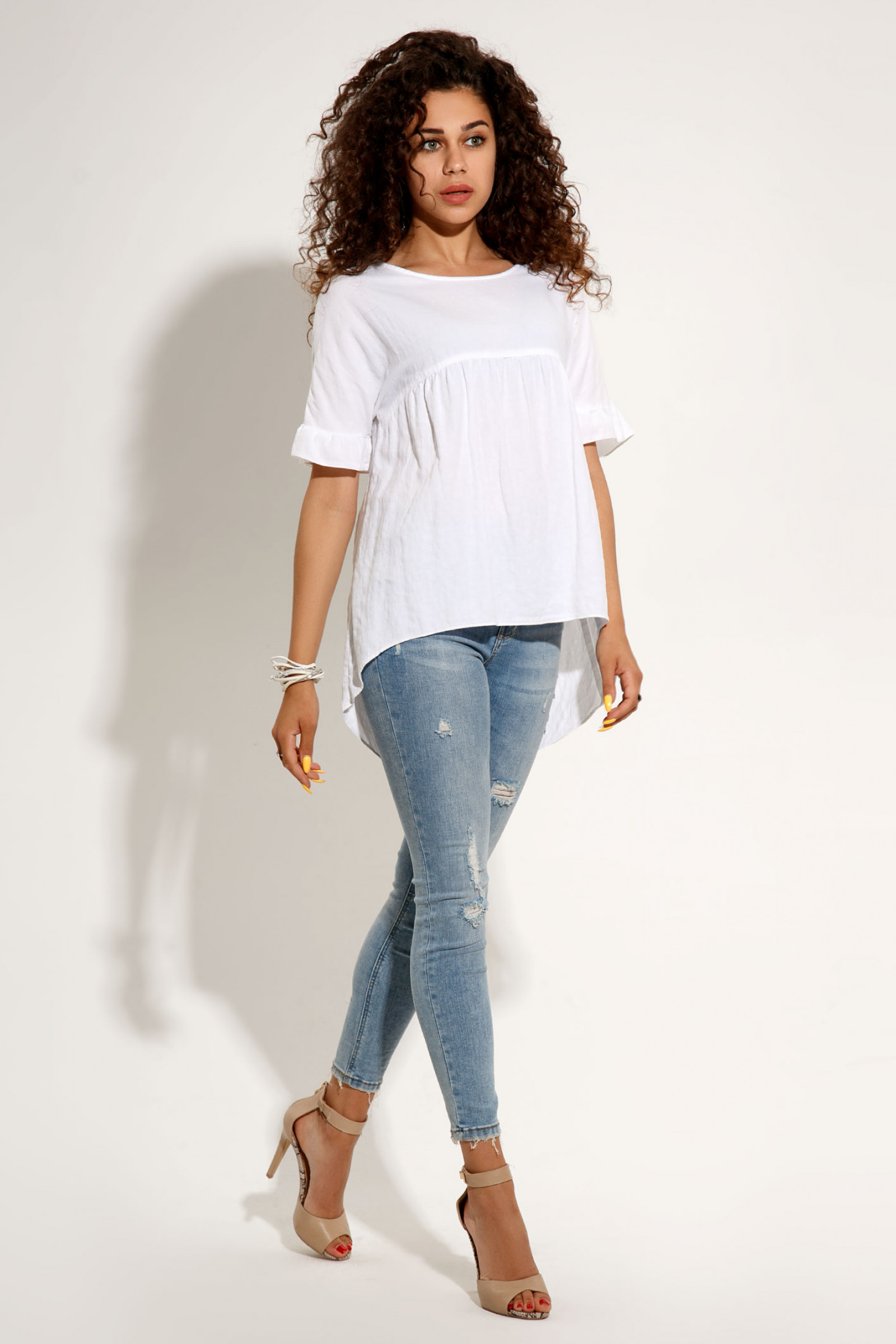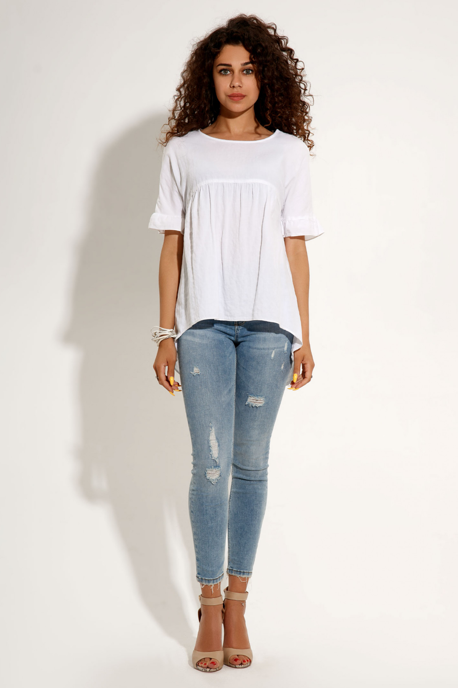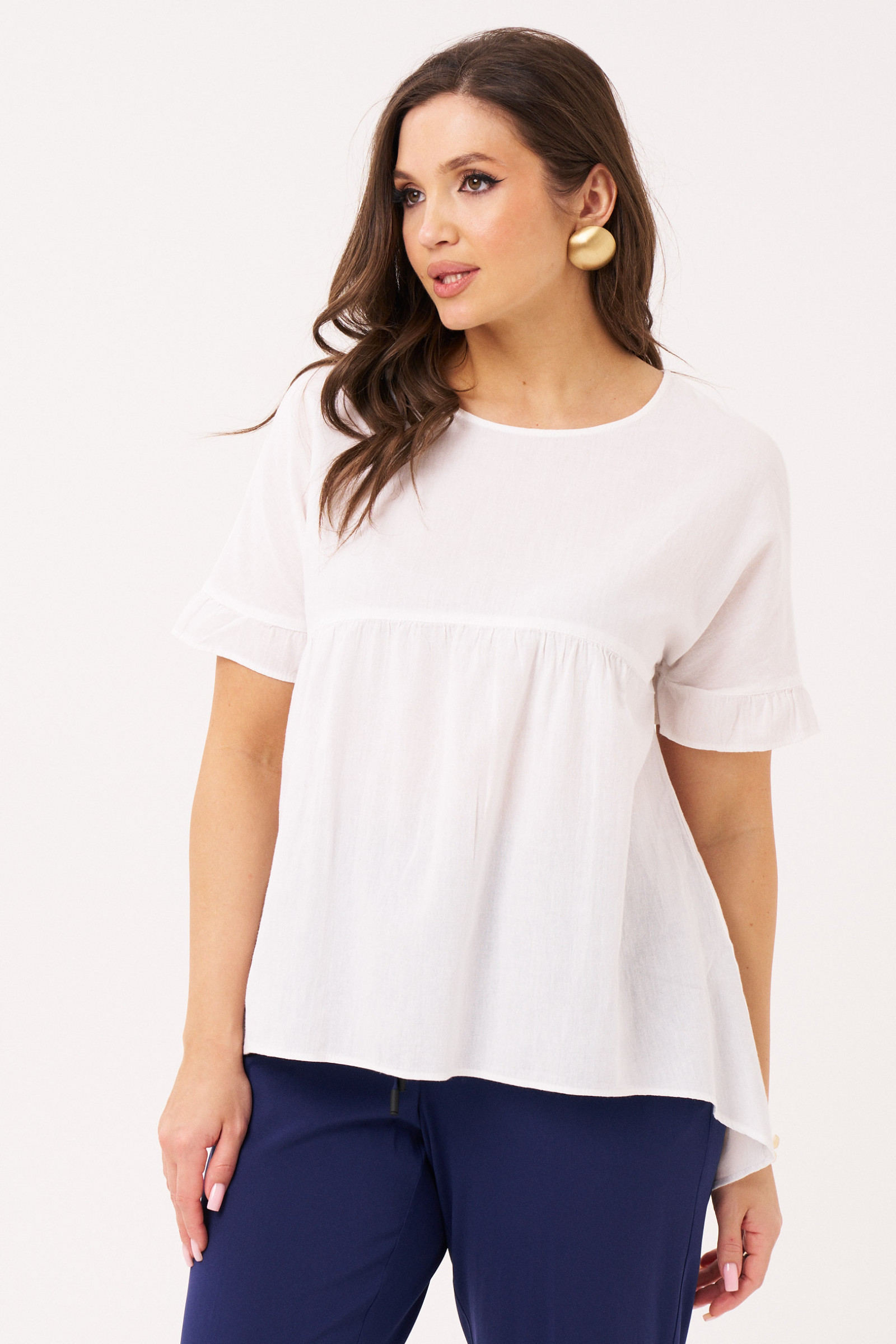 Женская блузка содержит в составе 100% хлопок, поэтому в ней комфортно и весной, и летом. Натуральная ткань приятно прикасается к телу, хорошо пропускает воздух и быстро впитывает влагу. Блузка с баской создает свободный силуэт, который скроет небольшой животик или непропорциональные формы.