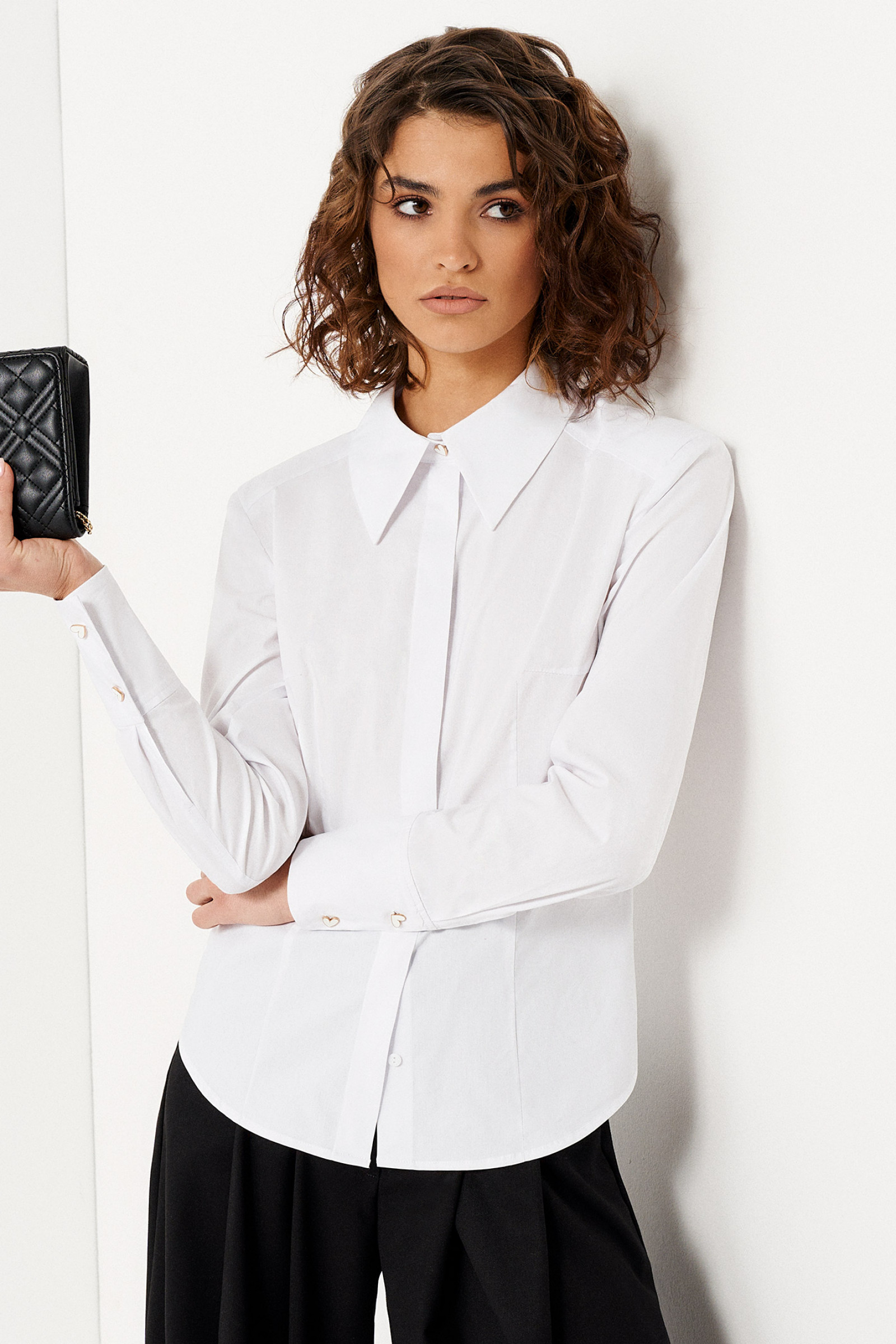 Удлиненная блузка с открытой спиной – оригинальная вещь, которая послужит вам для создания стильных образов на любой случай. Ее уместно надеть в офис, на деловую, дружескую и романтическую встречу, праздничное мероприятие. Изысканная модель гармонично смотрится в паре с брюками и юбкой любого кроя, обувью на каблуке, танкетке. Универсальный блузка подходит для сочетания с предметами гардероба любой оттеночной гаммы. Деловая блузка на пуговицах скроена с длинным рукавом на манжетах, рубашечным воротником, округлым низом. Акцент изделия – вырез в виде перевернутого треугольника на спинке. Покупайте блузку женскую нарядную, чтобы всегда выглядеть элегантно.