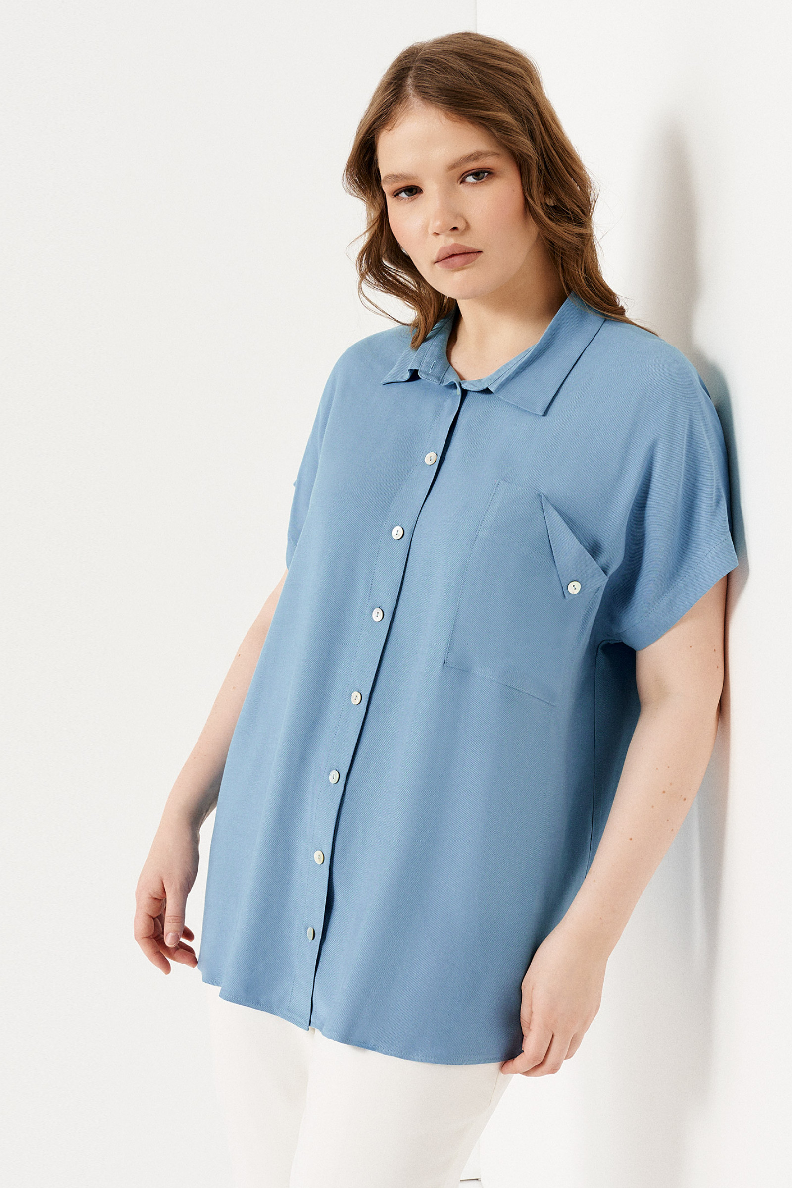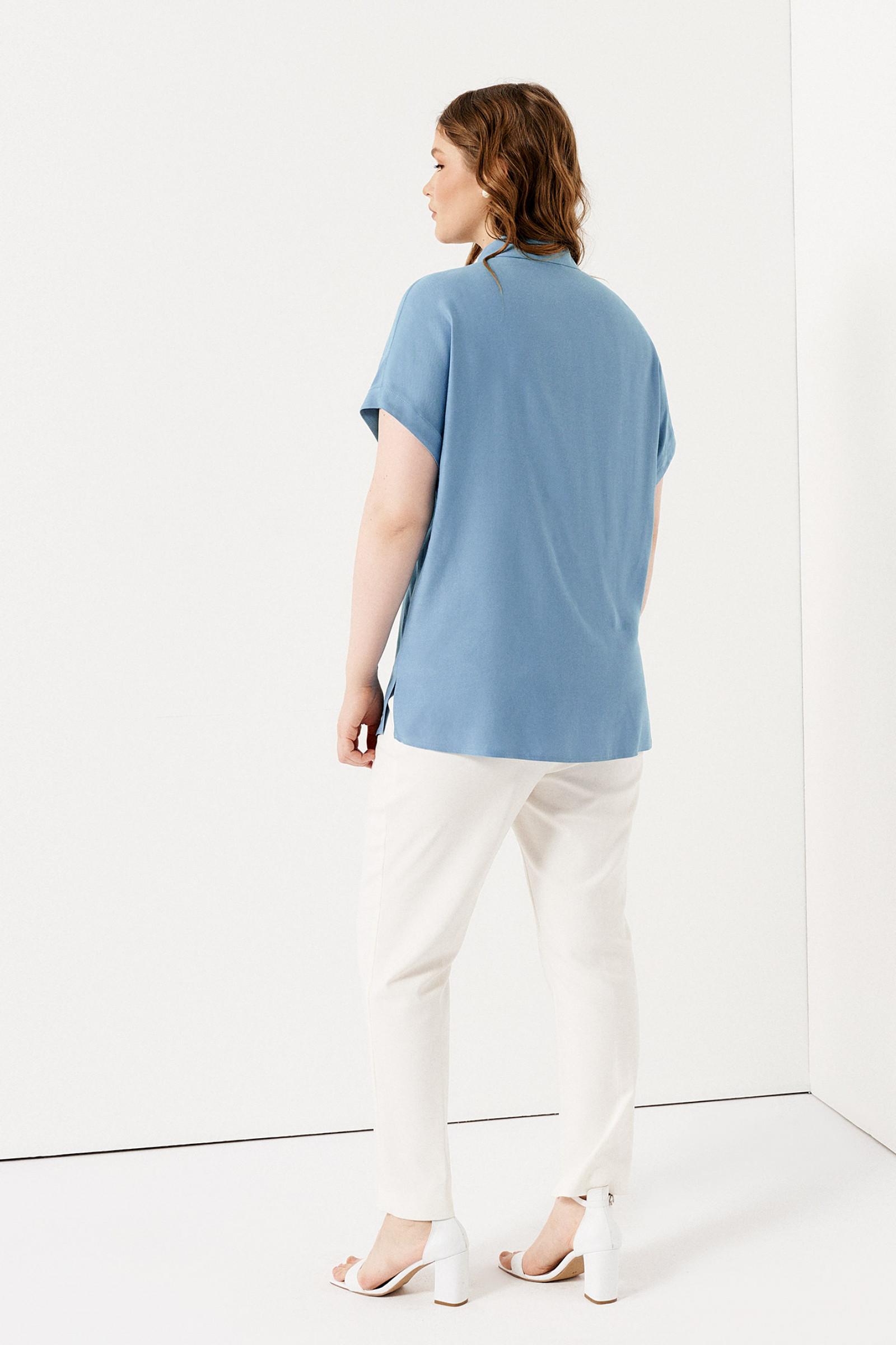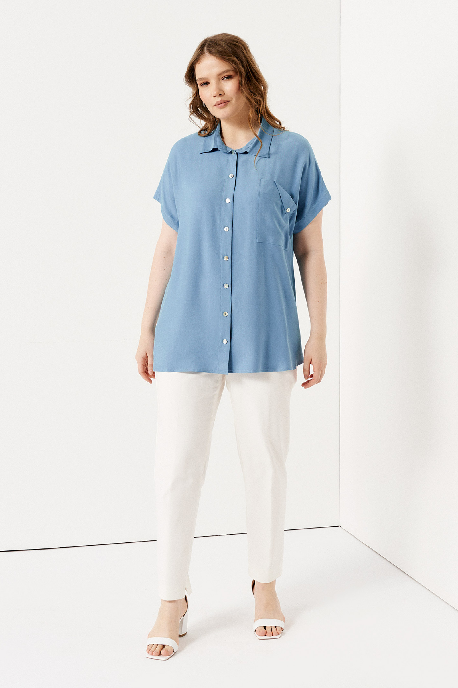 Летняя блузка с коротким рукавом – идеальный выбор одежды для работы и проведения досуга за пределами офиса. Данная модель составит элегантные сеты с брюками, джинсами, юбкой, отлично впишется в требования дресс-кода. Голубая блузка на пуговицах имеет свободный крой, дополненный отложным воротником рубашечного типа, нагрудным карманом с фигурным клапаном. Изделие пошито из мягкой вискозной ткани, приятной к телу. Оно незаменимо в теплые дни, хорошо пропускает воздух к коже. Выбирайте и заказывайте женскую блузу больших размеров из представленной сетки – 50-58, чтобы даже в обычный рабочий день выглядеть стильно и нарядно.