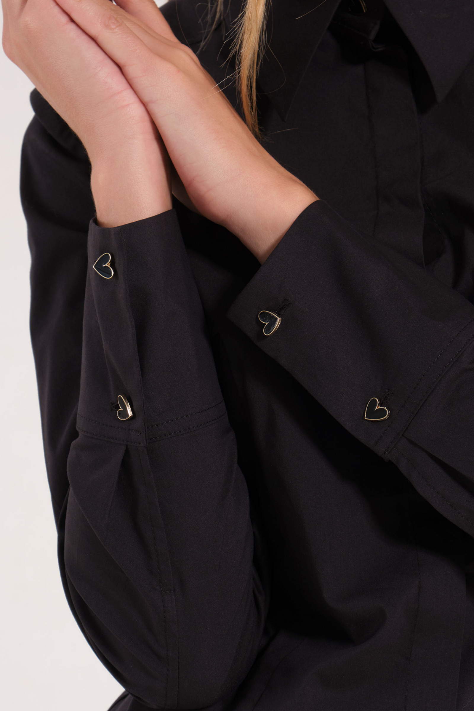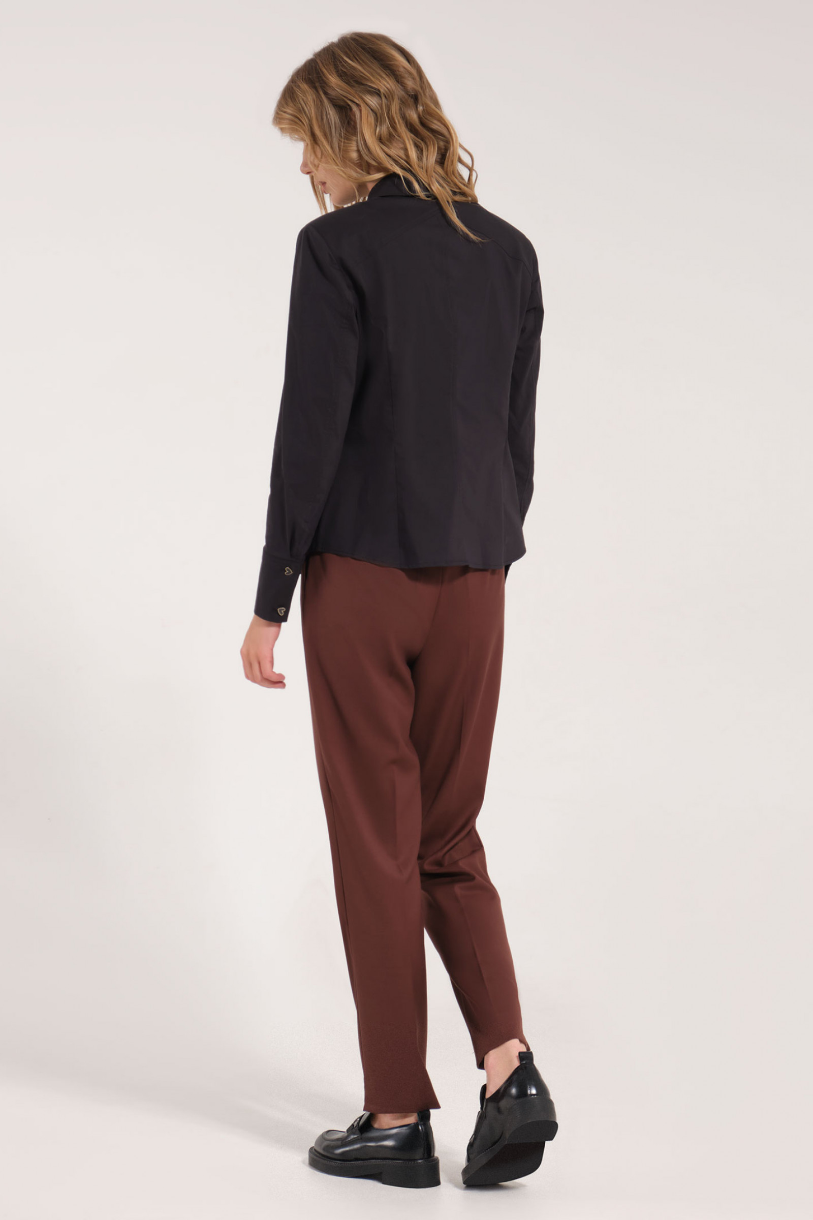 Блузка женская из смесовой ткани для повседневной носки. Блузка прямого силуэта, супатная застежка. Перед имеет нагрудные и талиевые вытачки. Спинка со средним швом и талиевыми вытачками до низа изделия, а также по спинке имеется кокетка. Плечевой шов смещен чуть на перед. Горловина обработана рубашечным воротником с отрезной стойкой. Низ рукава обработаны притачной манжетой, застежка на две обметанные петли и две пуговицы. Стильная и очень удобная блузка станет вашим фаворитом на любой выход.