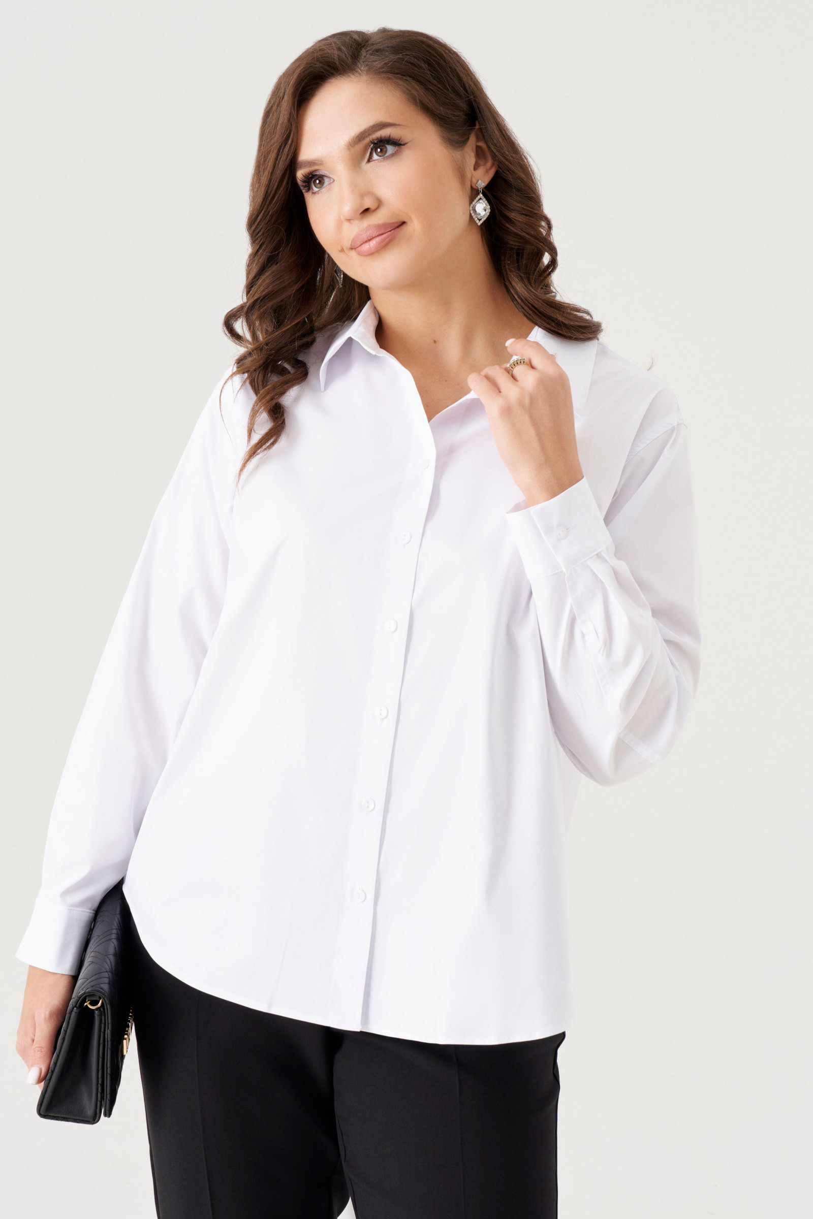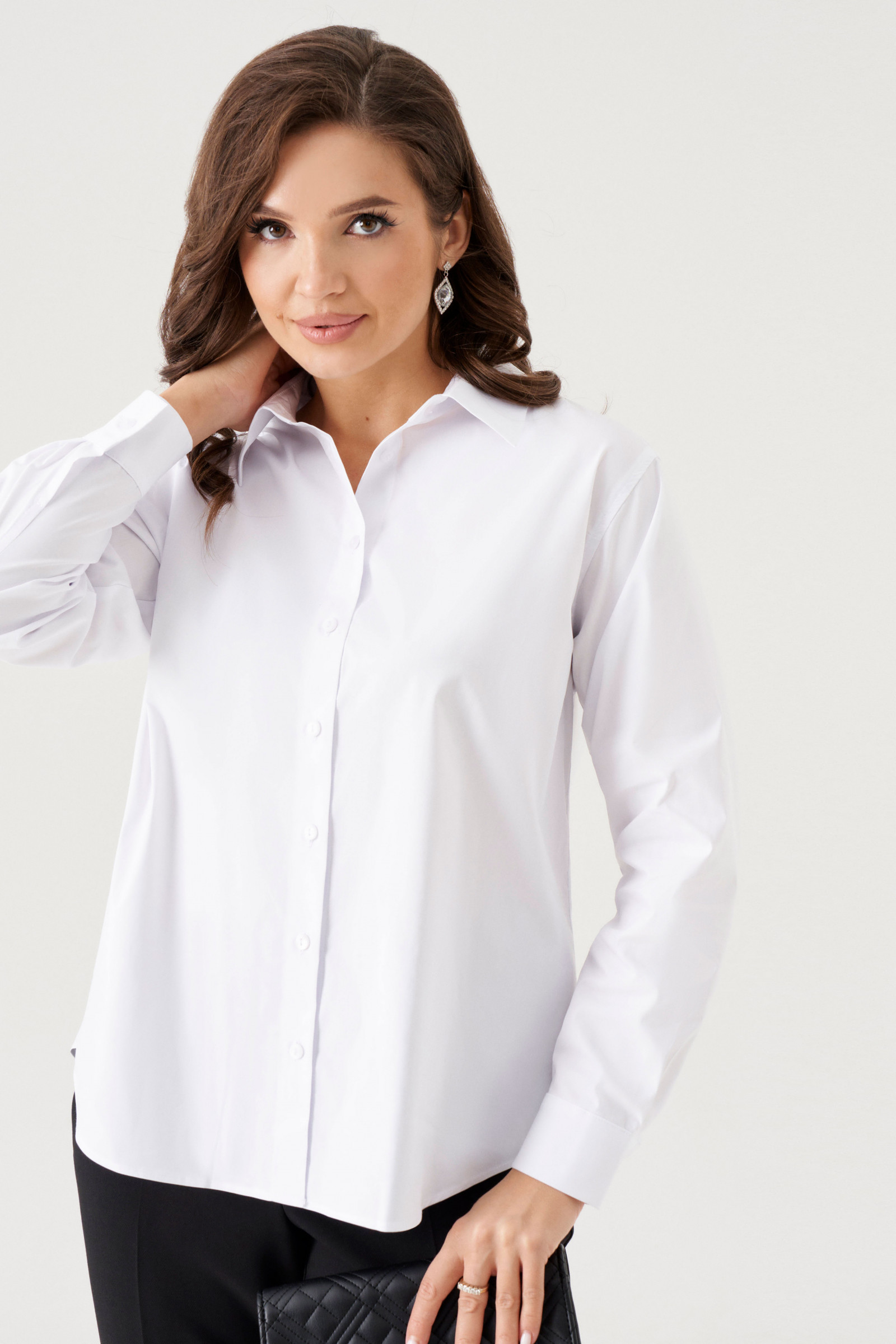 Блуза женская из смесовой ткани с большим содержанием хлопка. Блуза полуприлегающего силуэта. Застежка центральная бортовая на обметанные петли и пуговицы. Горловина обротана отложным воротником с отрезной стойкой. Рукав длинный, втачной, низ рукава оформлен притачной манжетой с застёжкой на обметанную петлю и пуговицу. Длина изделия классическая. Отличный вариант для базового гардероба. В данной блузке вы будете чувствовать себя комфортно и очень стильно.