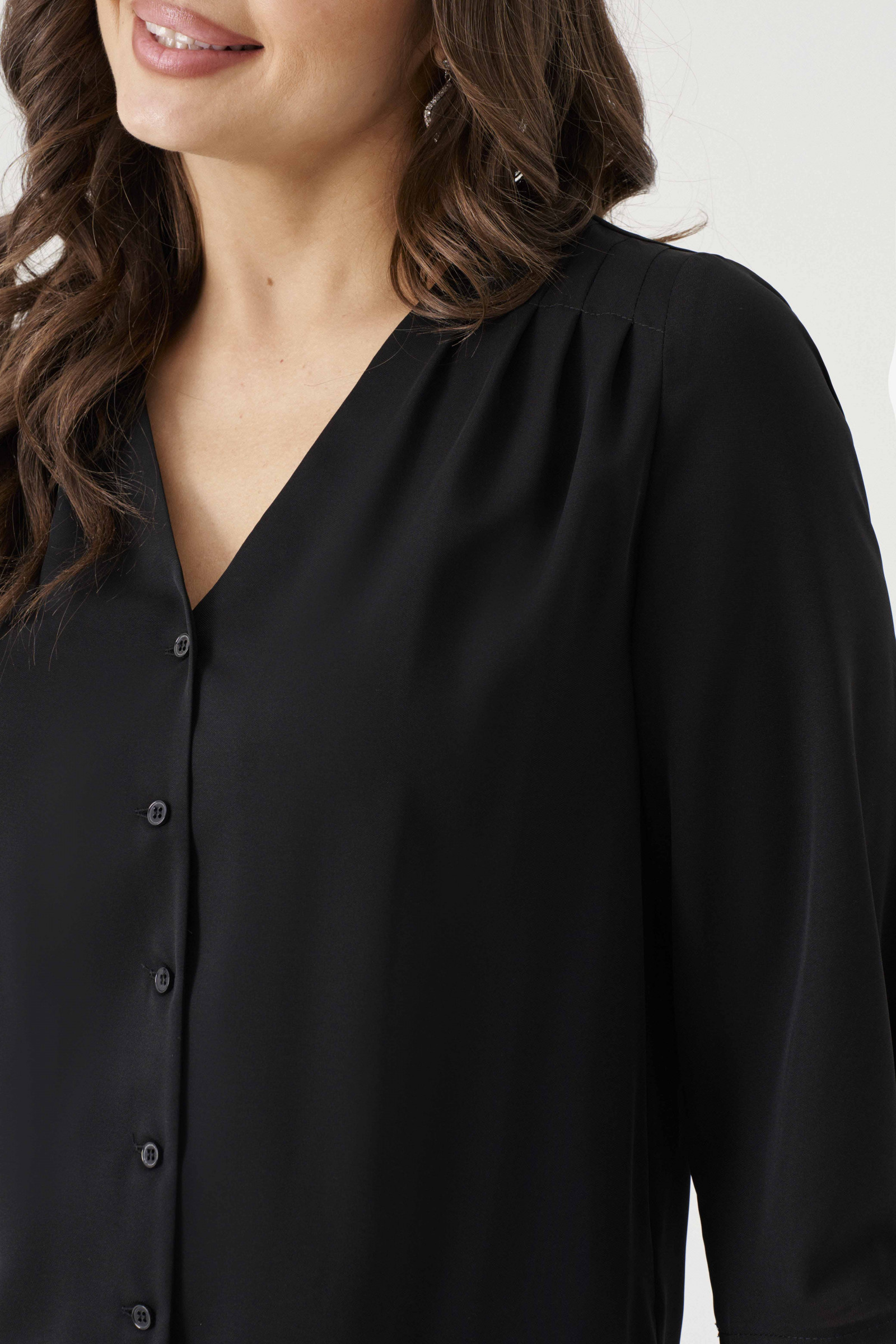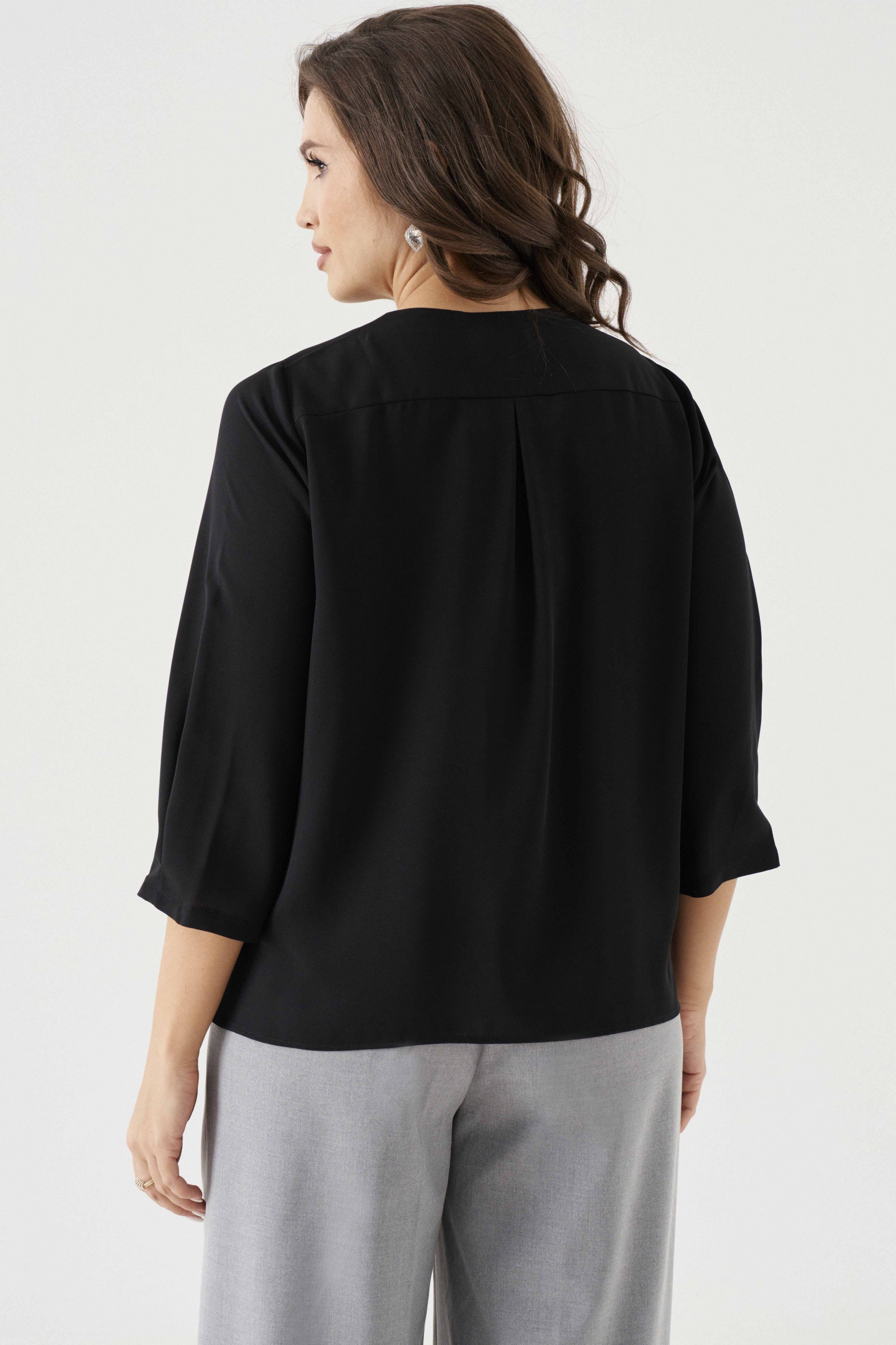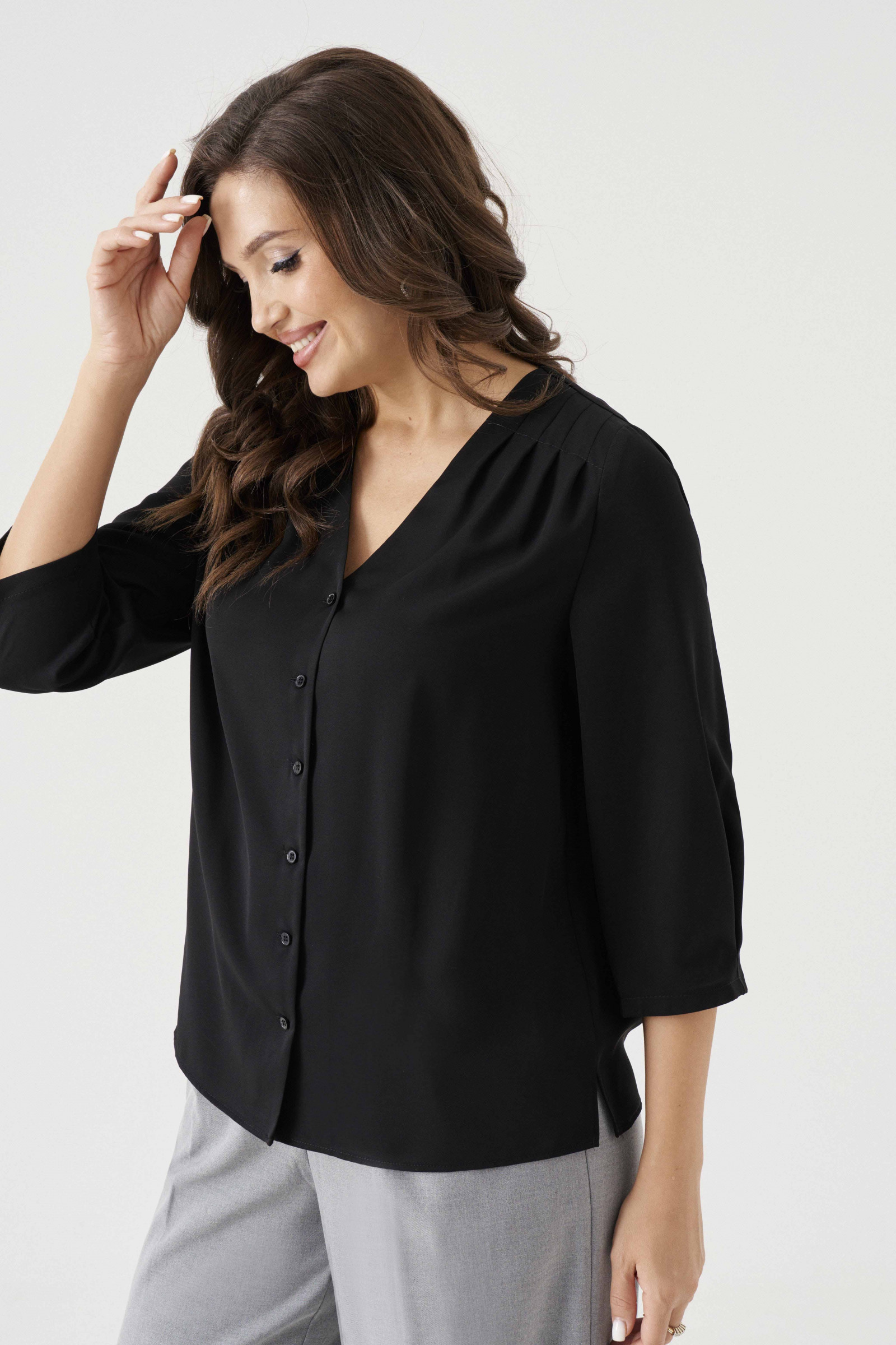Блуза женская для повседневной носки. Изделие прямого силуэта с втачным рукавом с длиной 3/4. Горловина изделия V-образная. В блузке имеется центральная бортовая застежка на обметанные петли и пуговицы. По переду декоративные складки в плечевых швах. Длина блузы классическая. Красивая и нежная блузка, которая будет радовать вас своим изумительным видом.