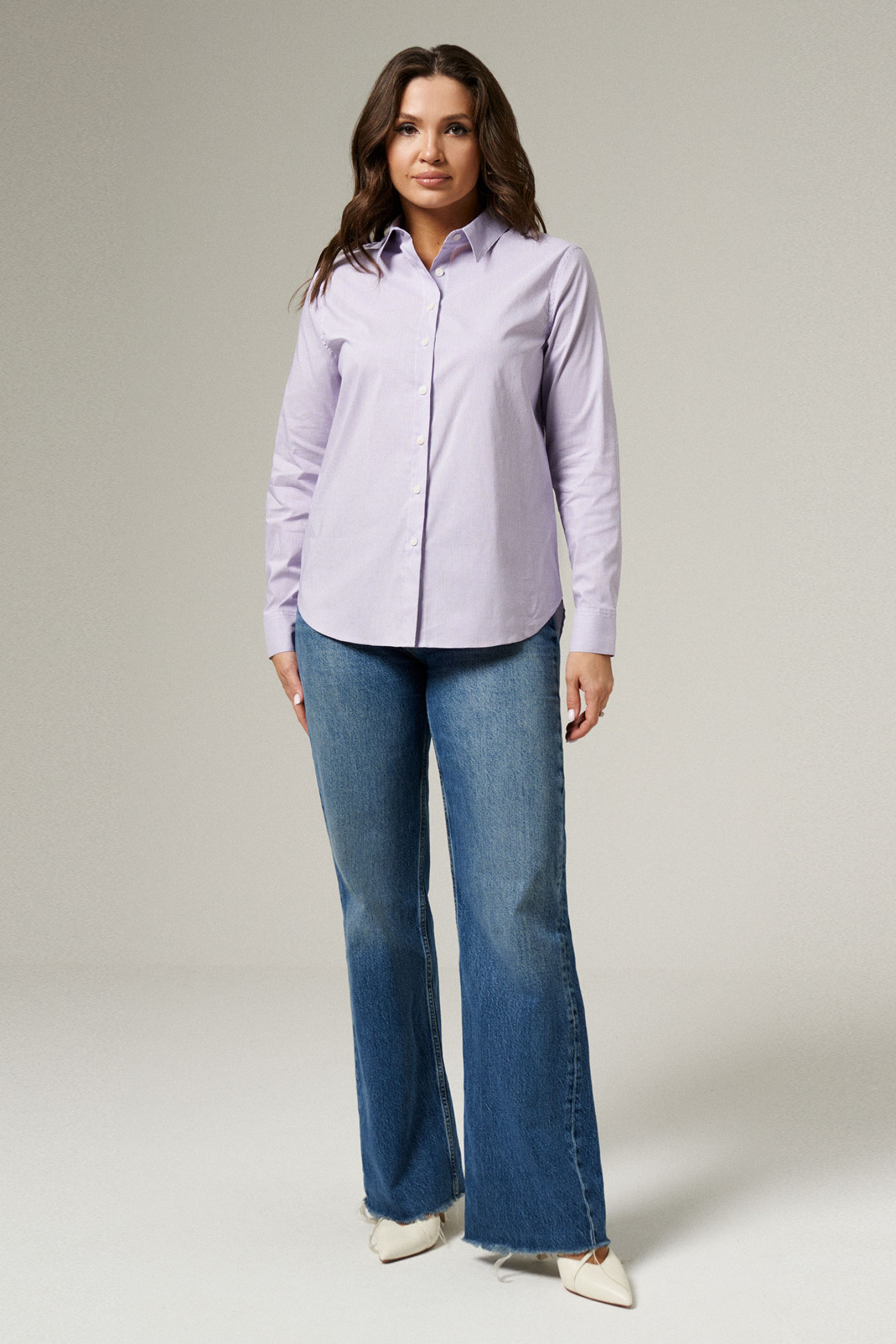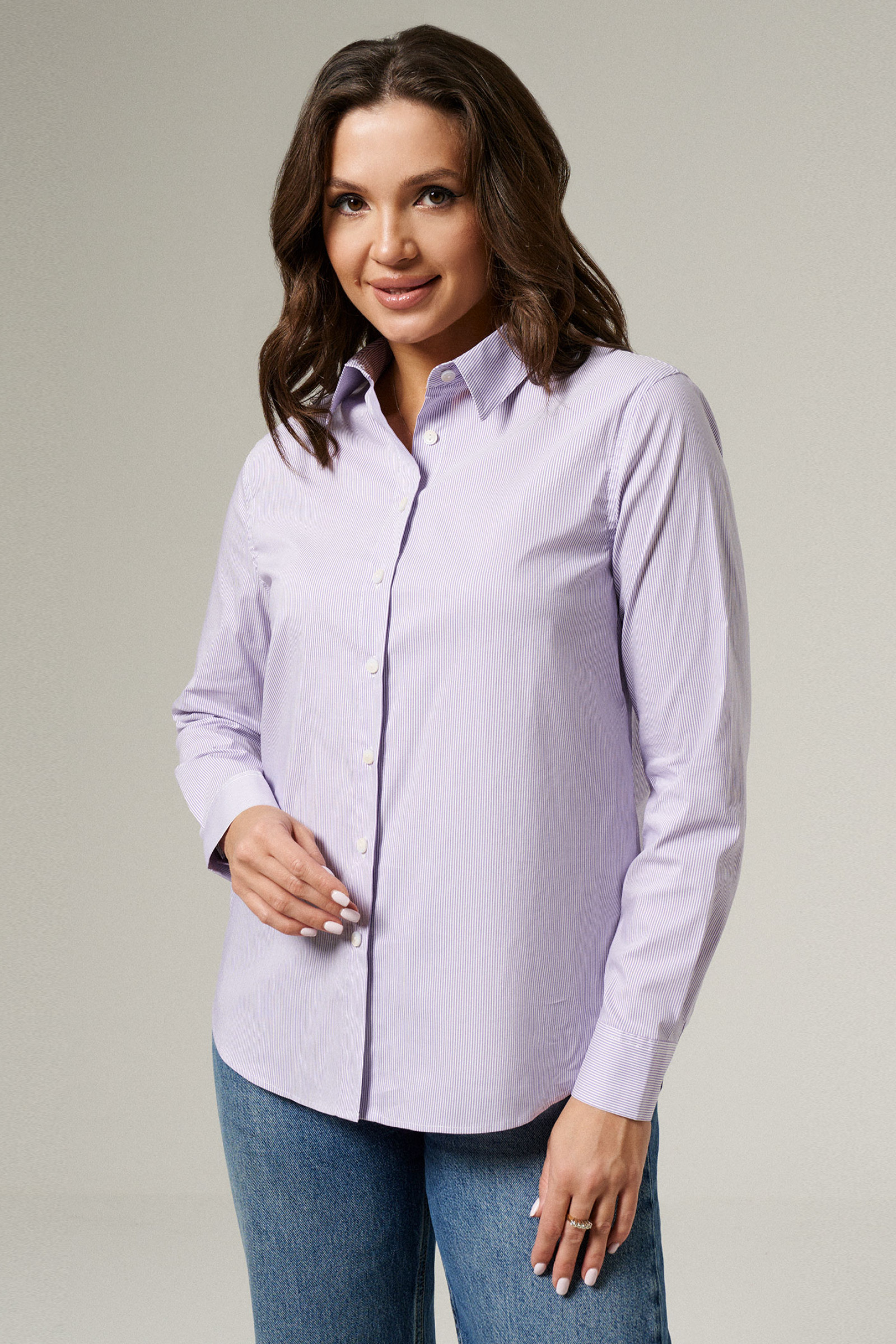 Блуза женская из хлопковой ткани для повседневной носки. Блуза прямого кроя с длинным втачным рукавом оформленным притачной манжетой. Изделие с фронтальной застежкой на пуговицы и воротником- стойкой. Спинка с отрезной кокеткой и встречной складкой. Отделочные строчки проложены по низу, манжетам, стойке, воротнику, кокетке изделия.