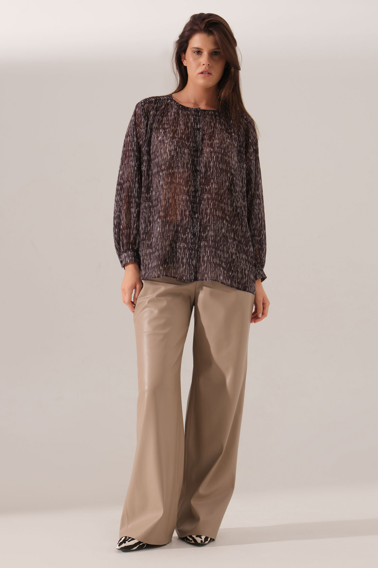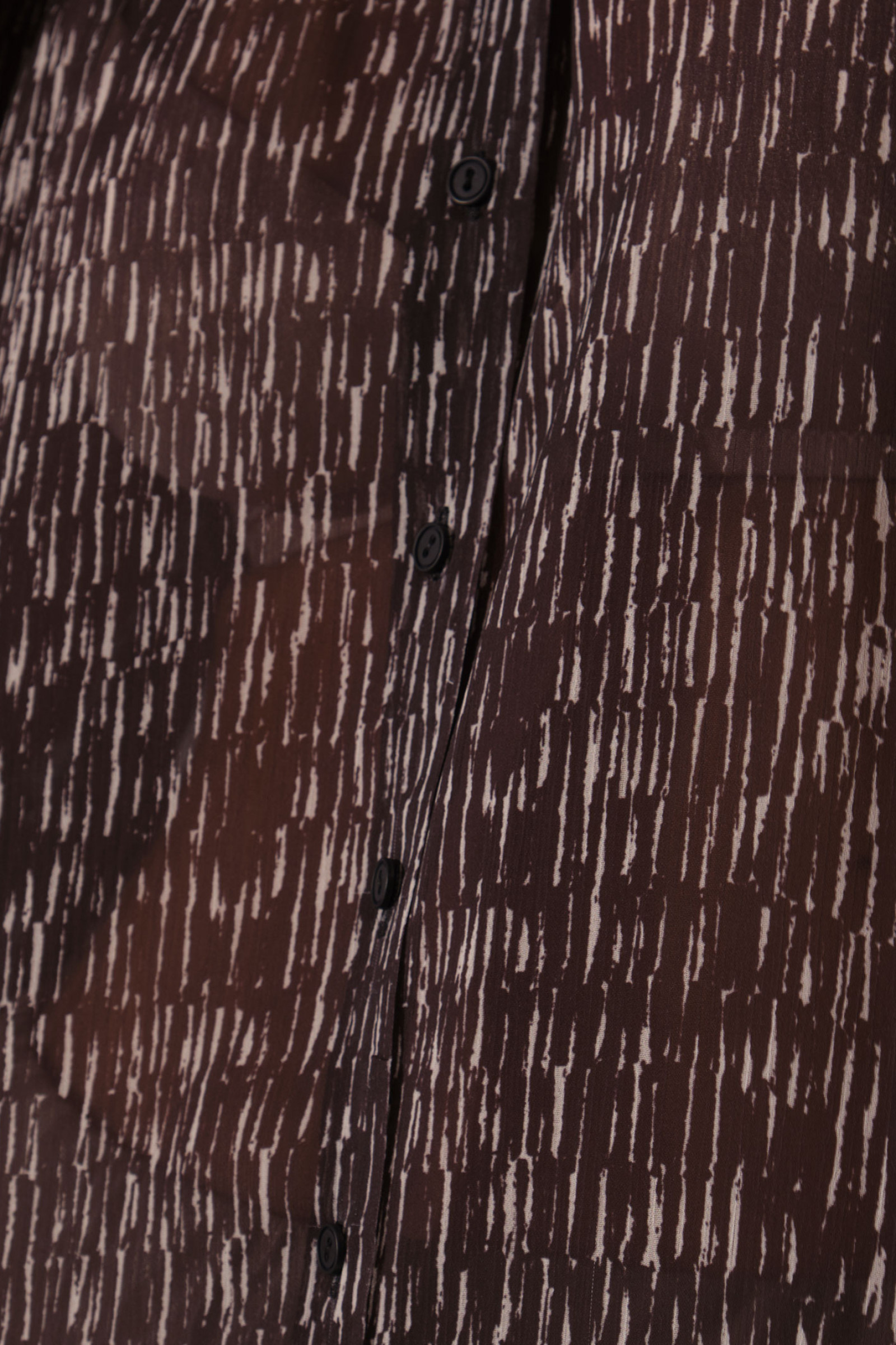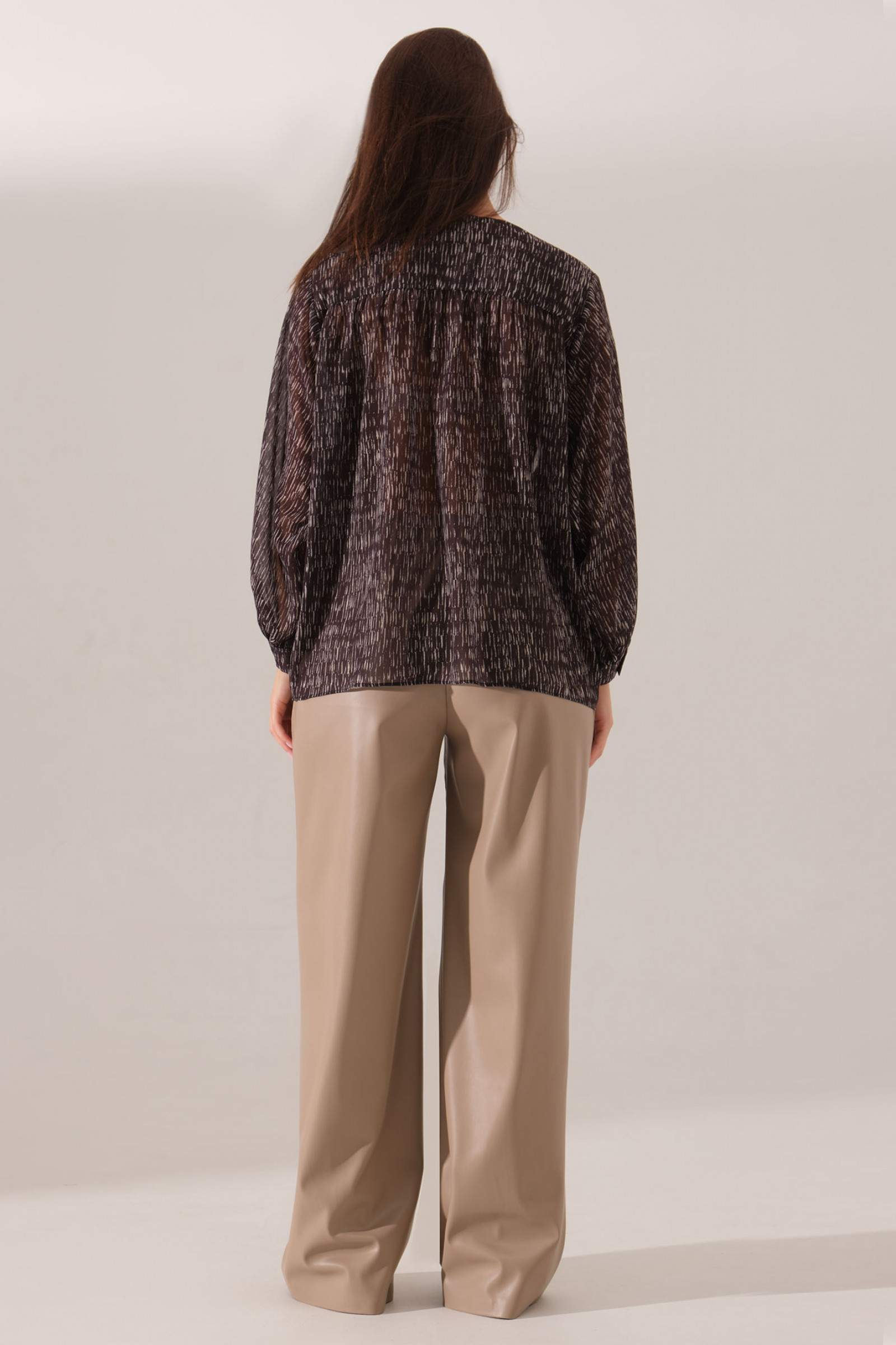 Блуза из струящейся ткани для повседневной носки. Блуза свобожного силуэта с фронтальной застежкой на пуговицы, длинным втачным рукавом. Рукав оформлен притачной манжетой. Спинка с отрезной кокеткой. Длина изделия классическая.