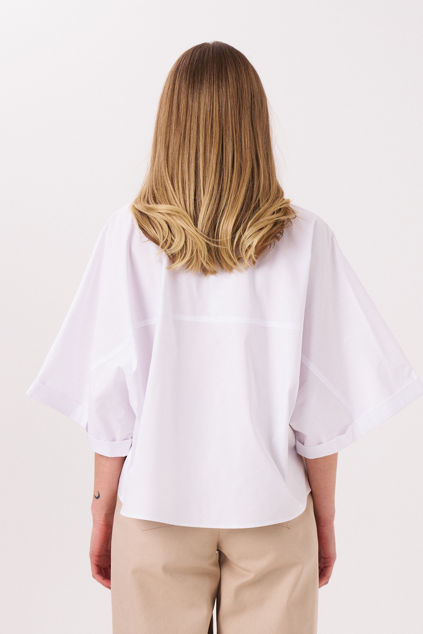 Блуза женская из хлопковой ткани для повседневной носки. Блуза свободная укороченная с фронтальной застежкой на пуговицы. Рукав цельнокроеный укороченный. По низу рукава отложная манжета. По спинке отрезная кокетка. Низ прямой.