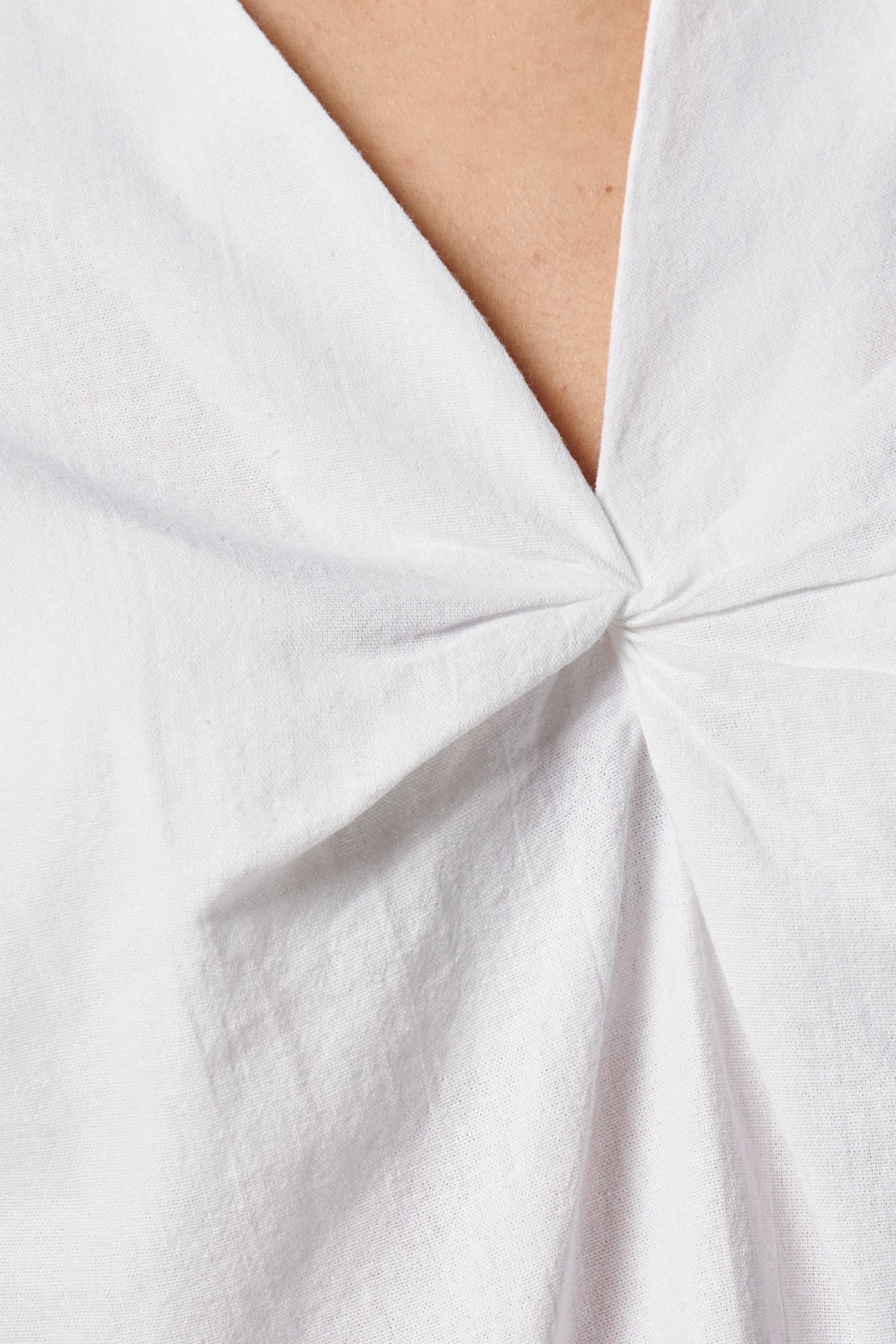 Блуза женская из хлопковой ткани для повседневной носки. Блуза свободная прямого кроя с коротким рукавом. Рукав оформлен притачной манжетой. На передней части изделия дизайнерский элемент. В боковых швах изделия разрезы.