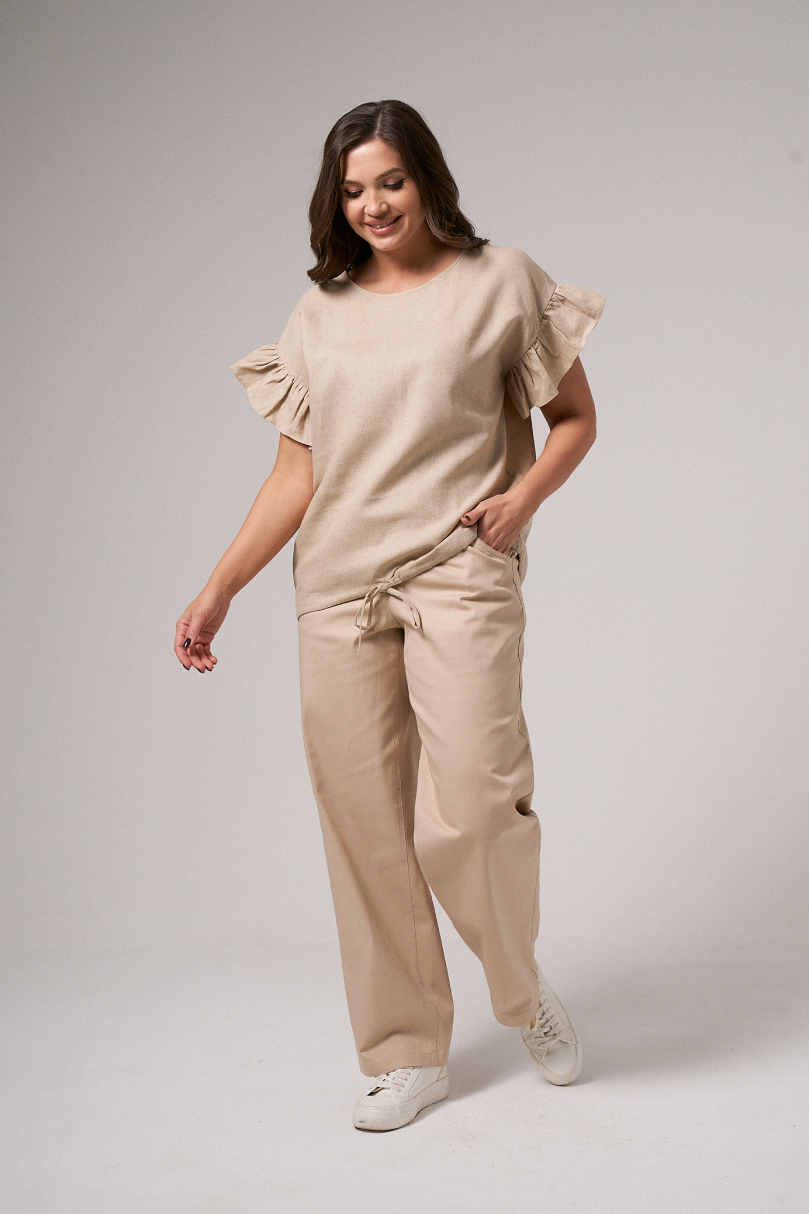 Блуза женская из льняной ткани для повседневной носки. Горловина круглая, пройма оформлена сборкой. По низу изделия кулиса.
