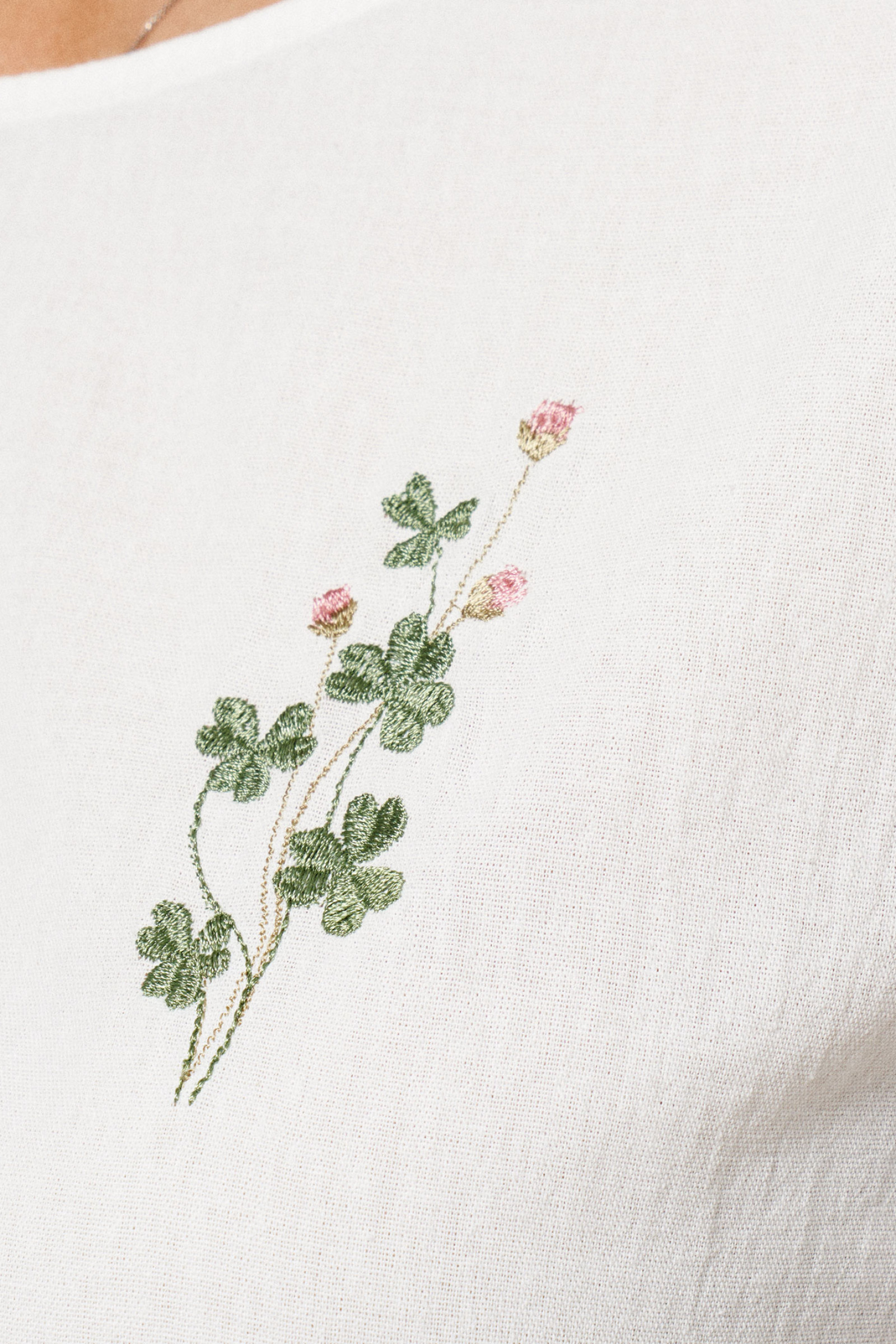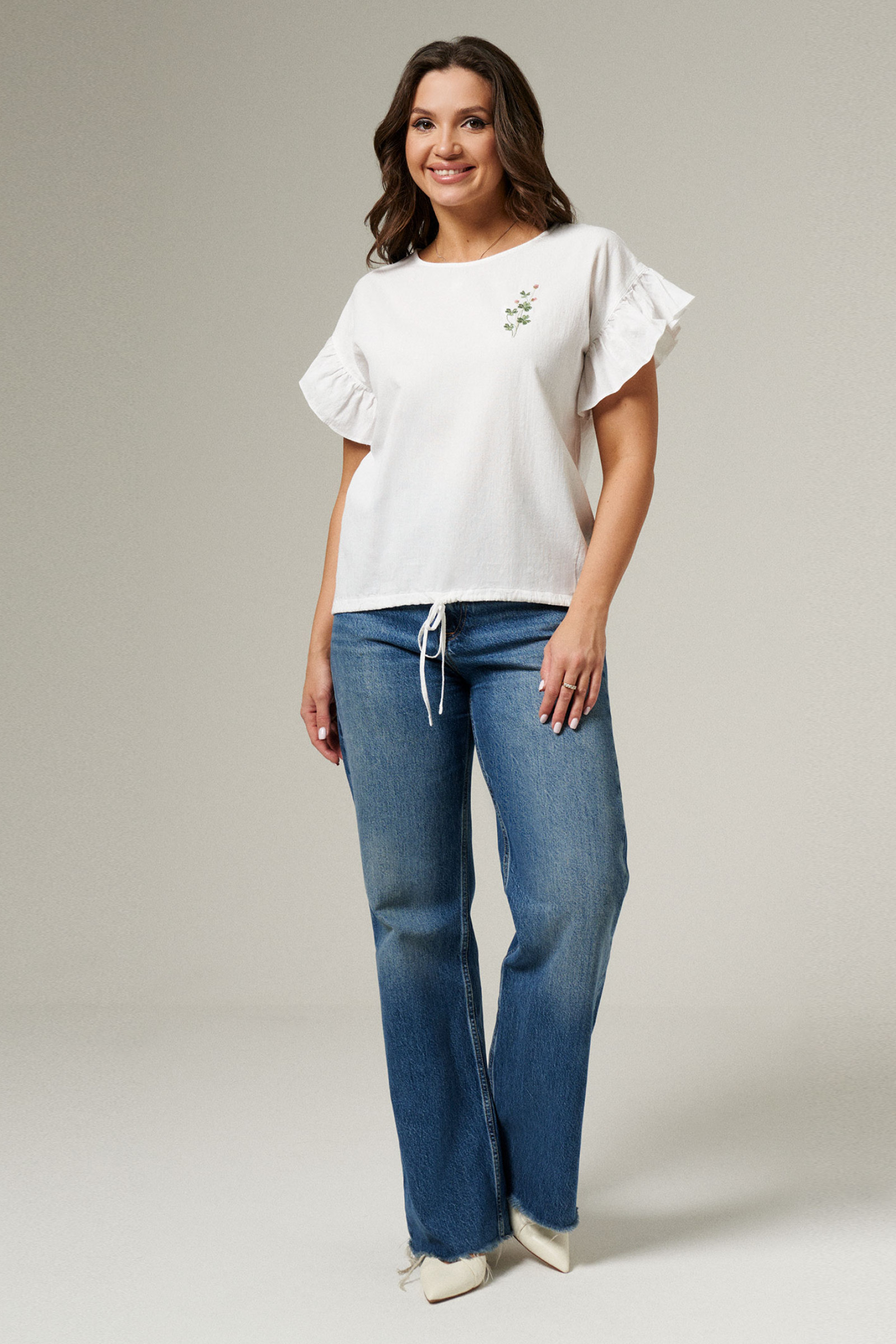 Блуза женская из хлопковой ткани для повседневной носки. Блуза прямая с коротким рукавом оформленым сборкой. Горловиа круглая. По низу изделия кулиса. Перед украшен вышивкой в цветочном мотиве.