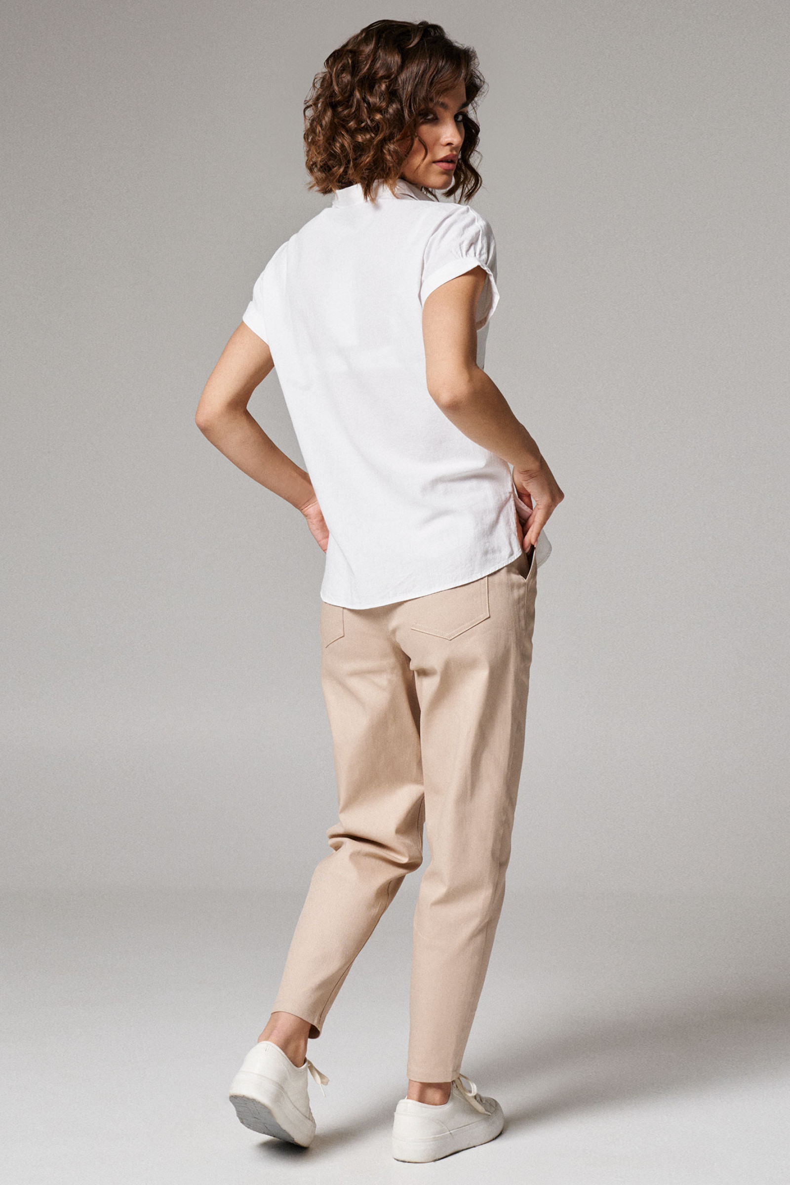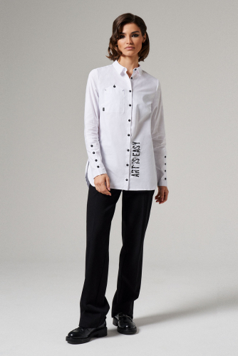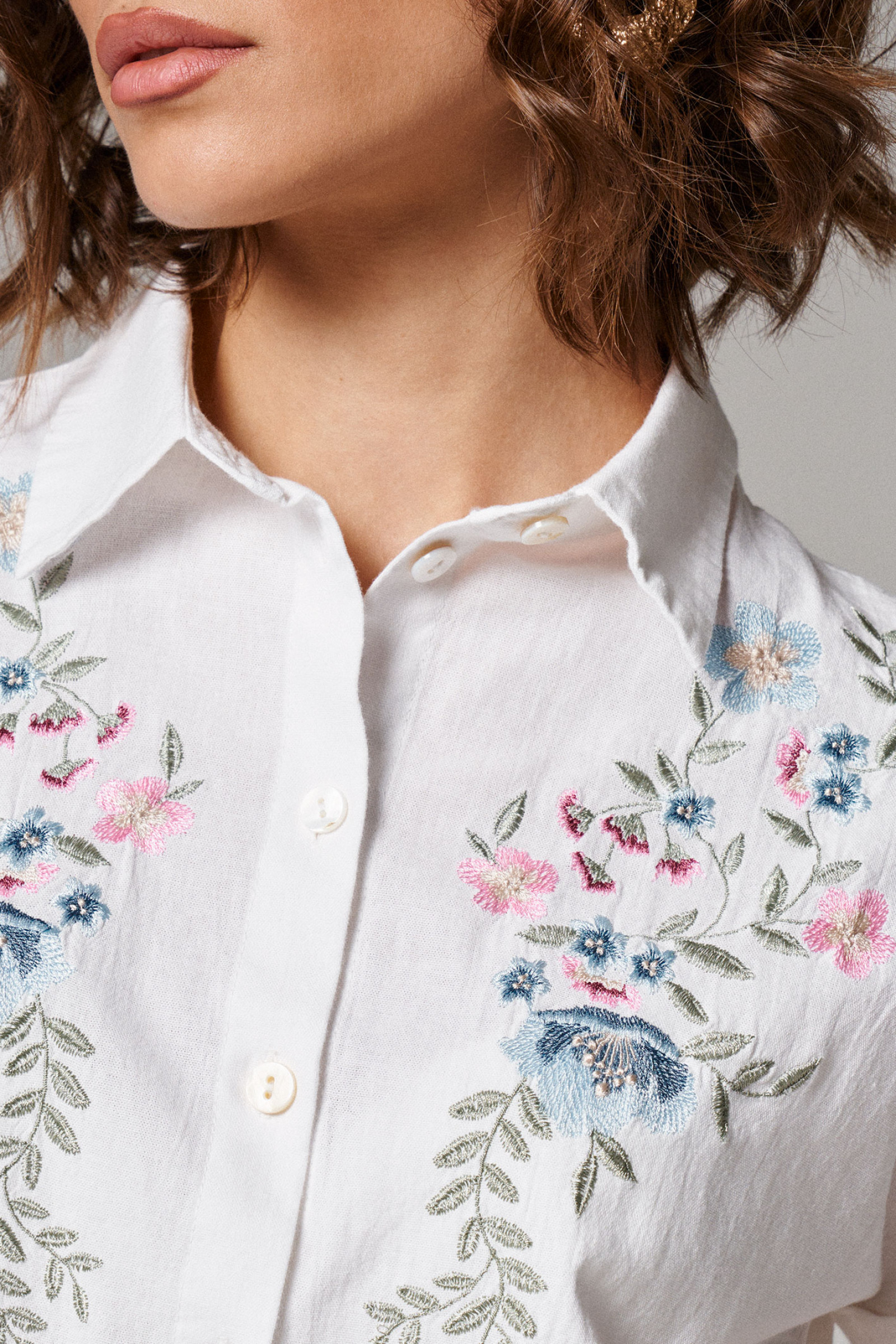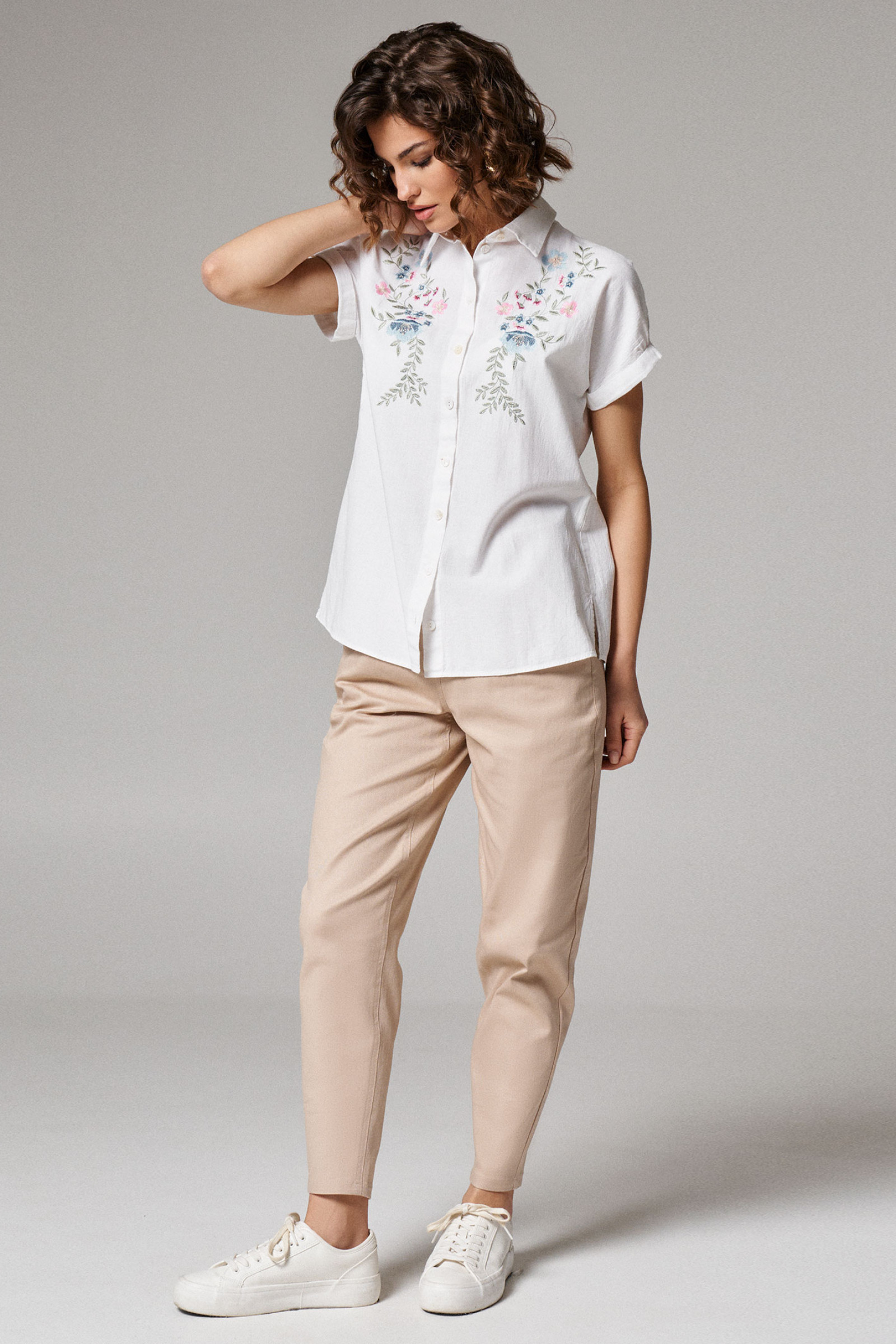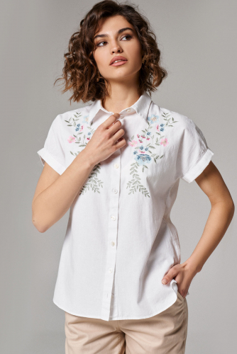 Блуза женская из хлопковой ткани для повседневной носки. Рукав короткий оформлен притачной манжетой. Блуза с воротником стойкой и фронтальной застежкой на пуговицы. На передней части изделия вышивка с цветочным мотивом.