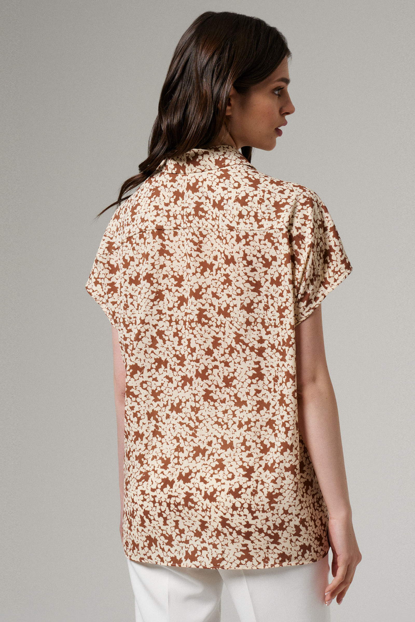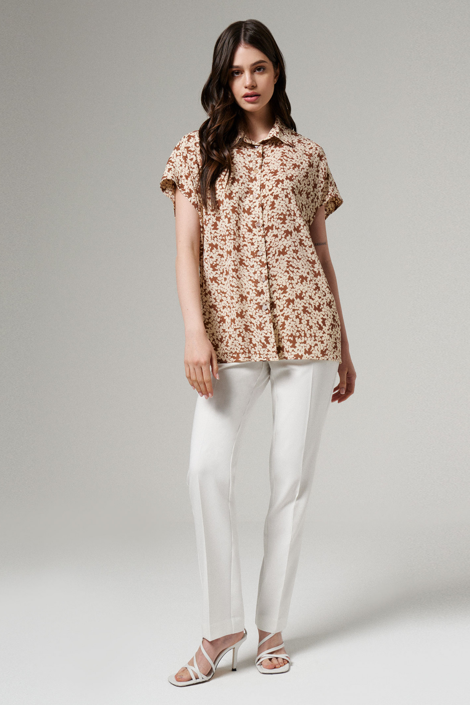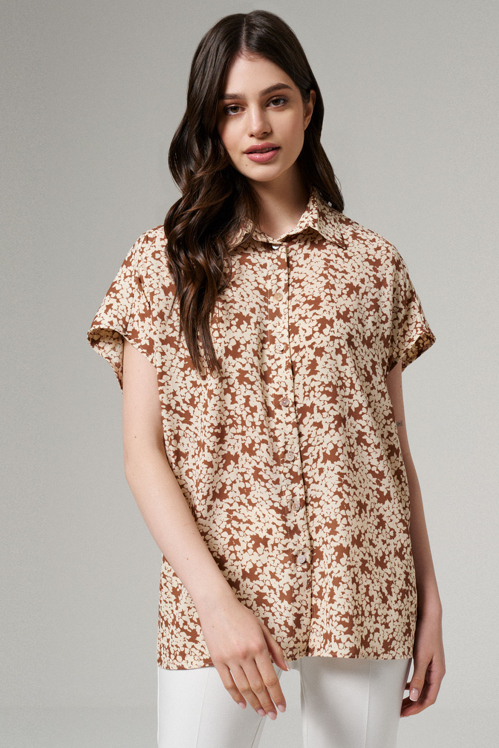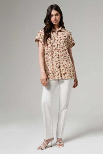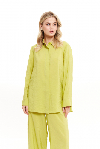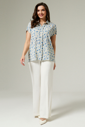 Блуза женская из лёгкой струящейся ткани для повседневной носки. Блуза прямого силуэта. Линия плеча спущена, переходящая в рукав. Центральная застежка на петли-пуговицы. Горловина оформлена воротником- стойкой. Длина до середины бёдер, низ ровный. Эта модель идеально сочетается со светлыми брюками, что делает ее неотъемлемой частью вашего гардероба. Блузка также подойдет и для офиса, а также как нарядный элемент для вечерних мероприятий.
