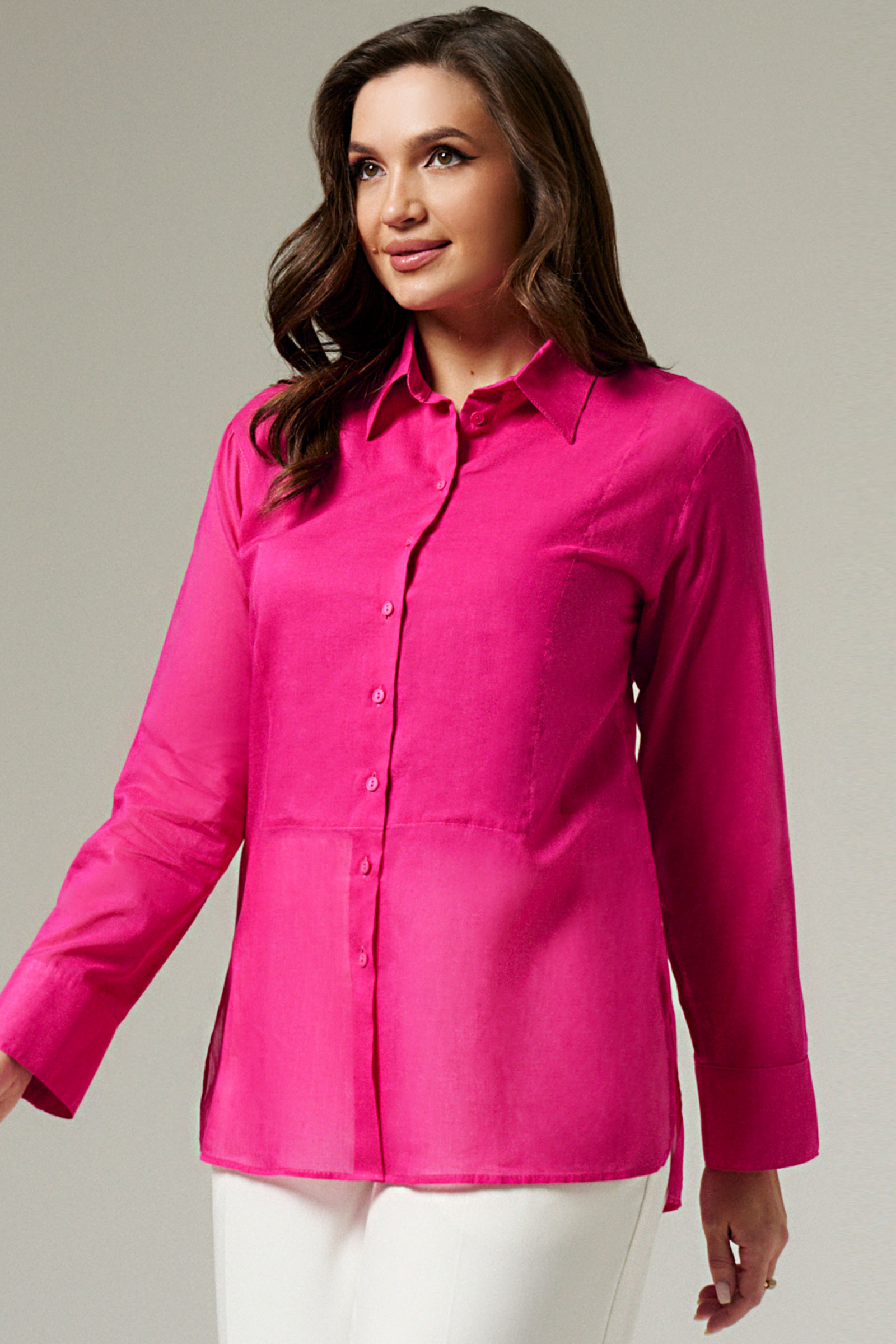 Блуза из хлопковой ткани для повседневной носки. Изделие прямого кроя с фронтальной застежкой по переду, настрочной деталью по груди. Рукав длинный втачной, оформлен притачной манжетой, застегивающейся на пуговицы. Блуза классической длины с разрезами в боковых швах от низа.