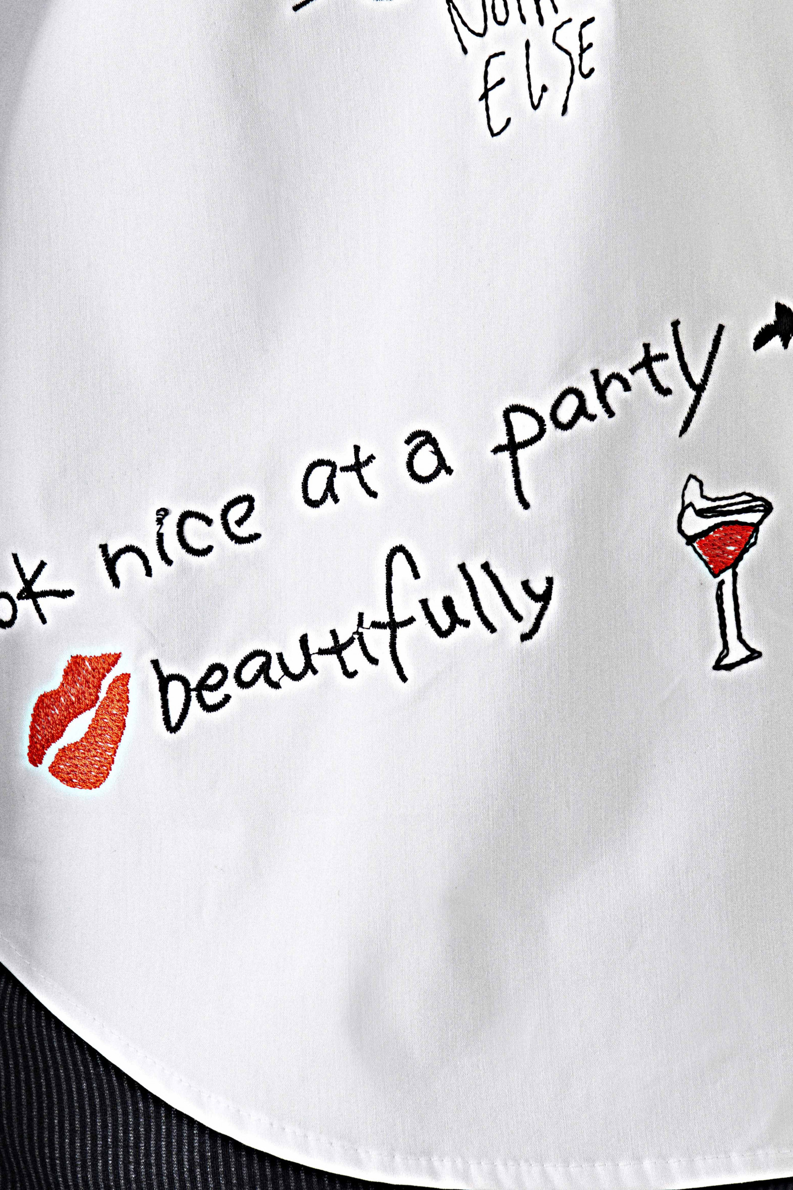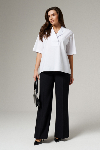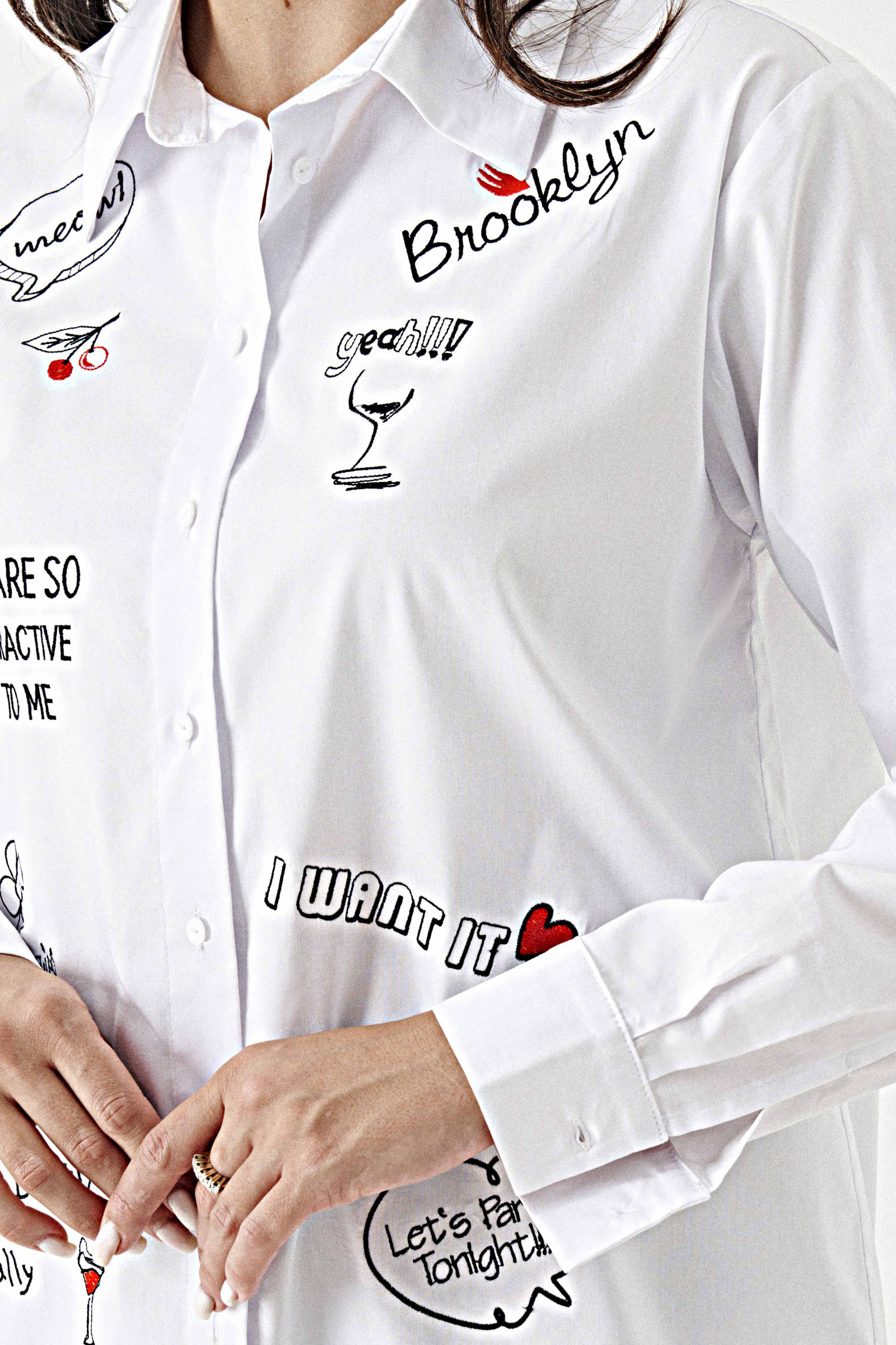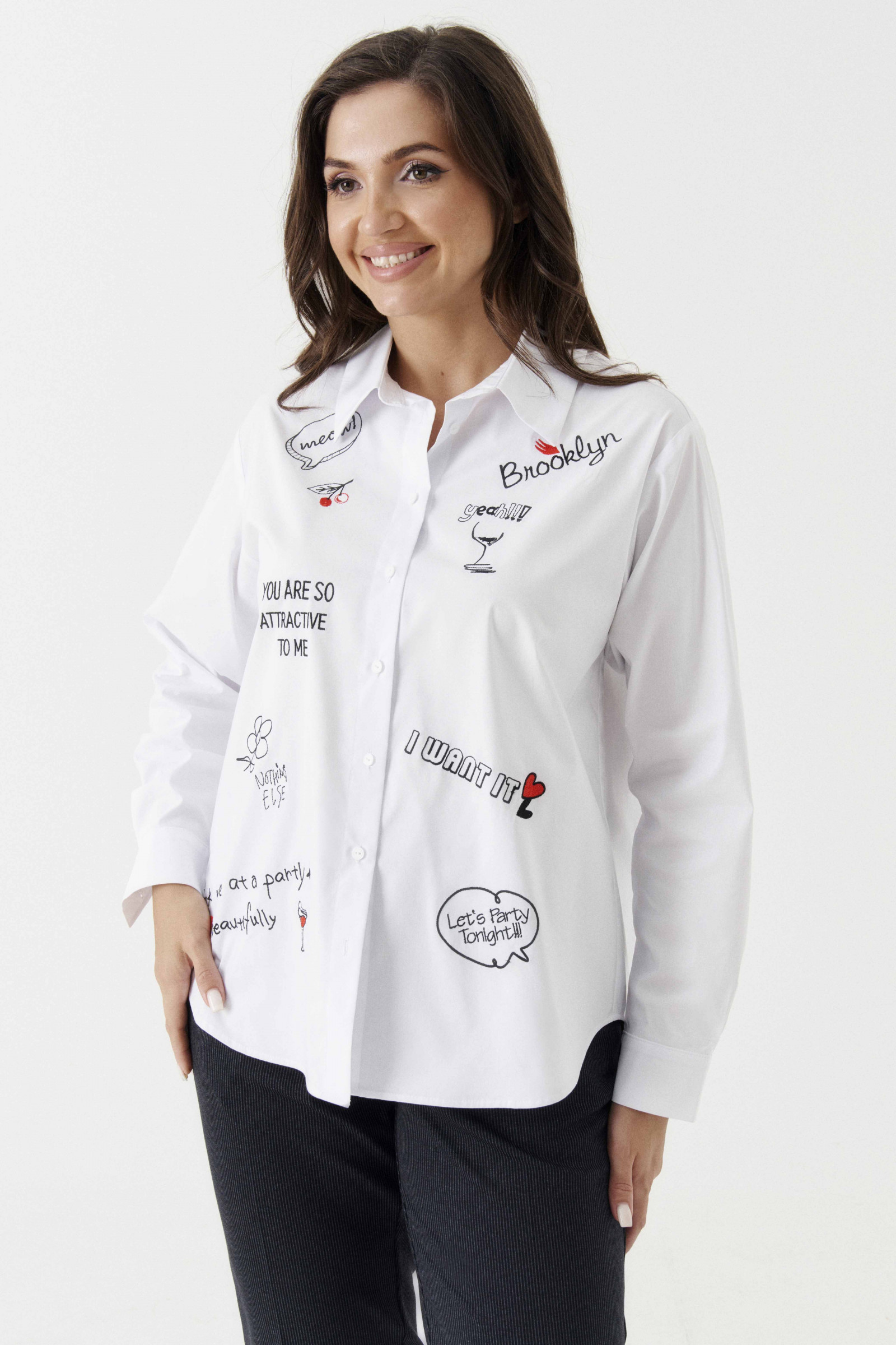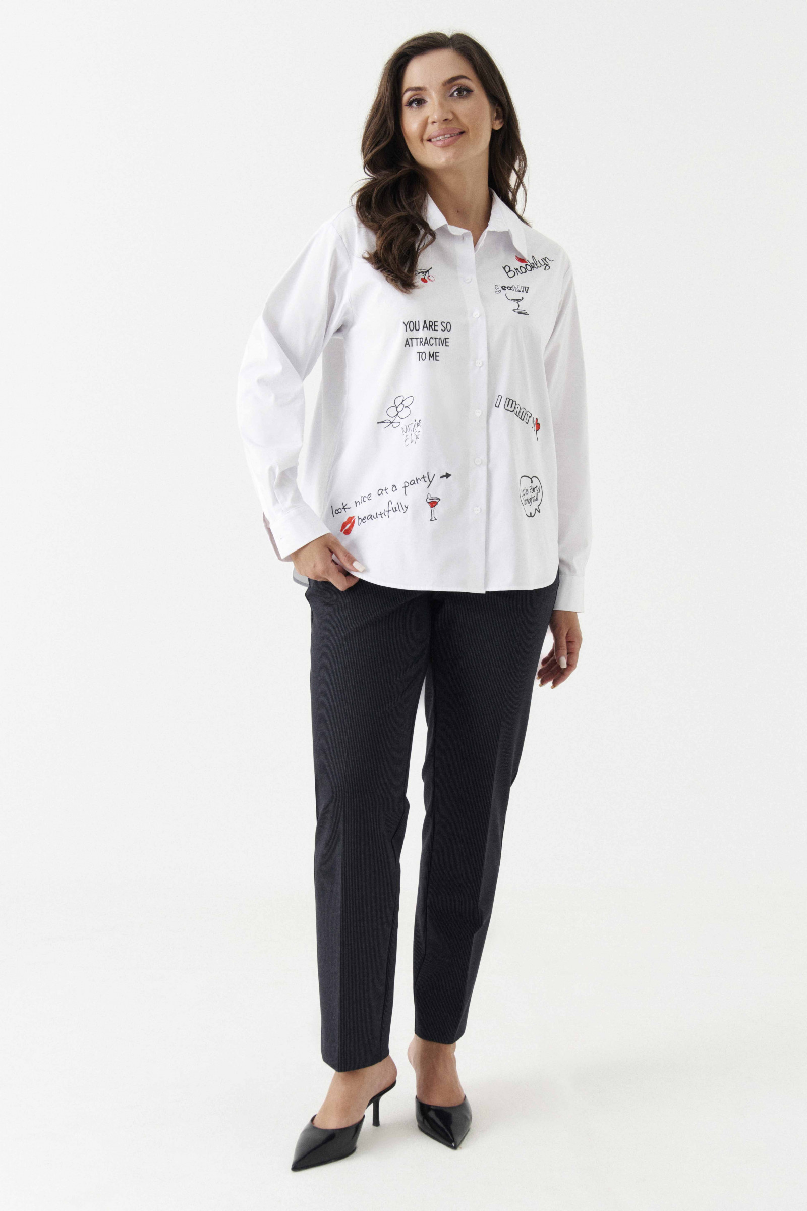 Блузка женская из смесовой ткани для повседневной носки прямого силуэта. Перед имеет вышивку и закругленную линию низа. Застежка на восемь обметанных петель и восемь пуговиц. Спинка имеет кокетку и две складки, а также закругленную линию низа. Горловина обработана рубашечным воротником с отрезной стойкой. Низ рукава обработан притачной манжетой с застежкой на одну обметанную петлю и одну пуговицу. Такой креативный вариант блузки обязательно привлечет к вам внимание. Блузка станет вашей любимой вещью в гардеробе.