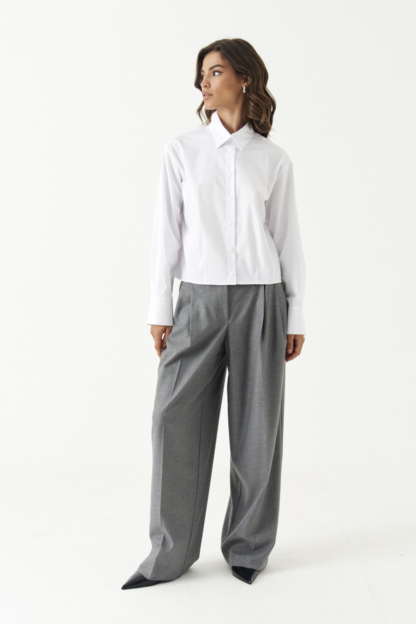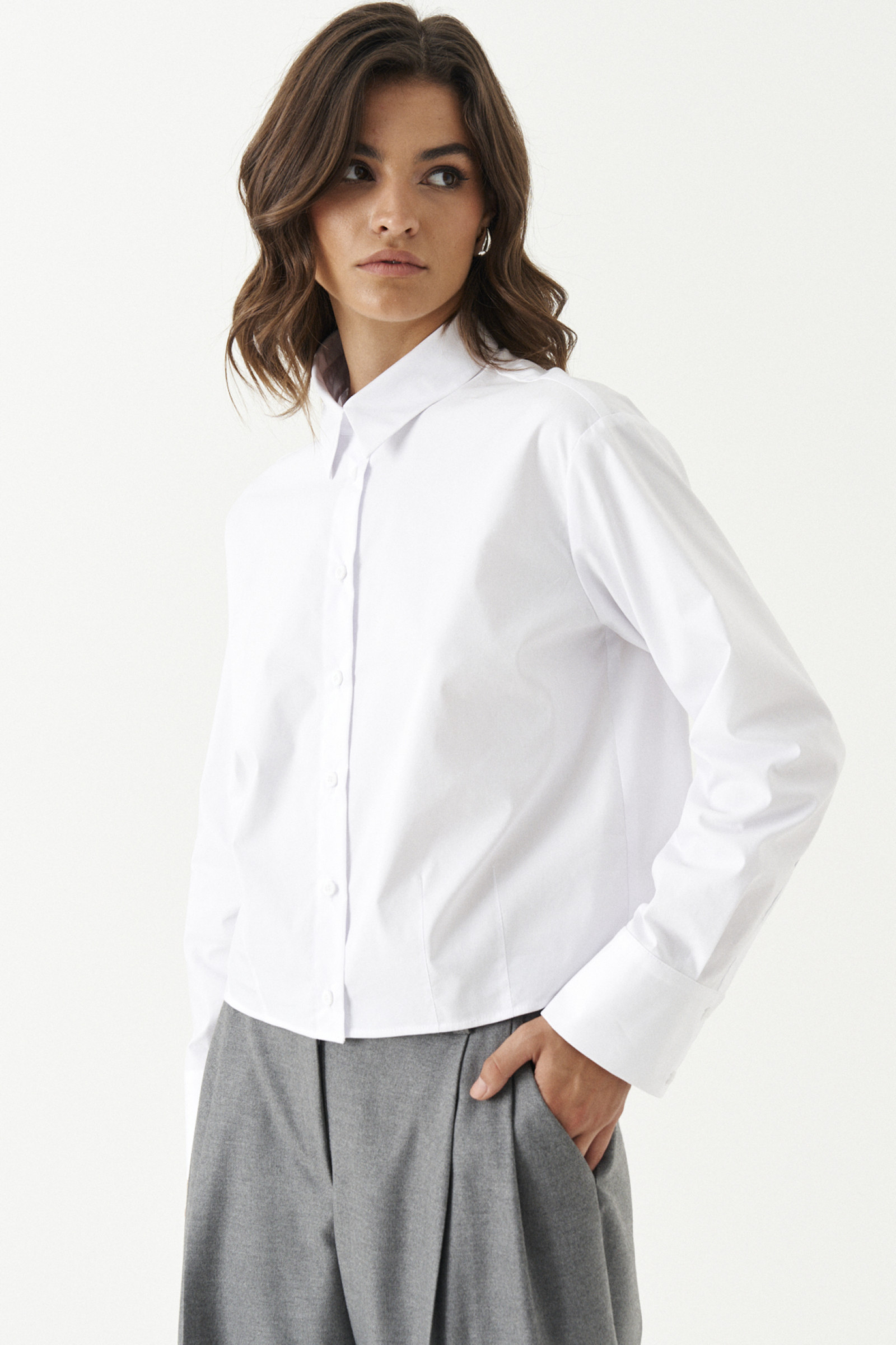 Блузка женская из смесовой ткани для повседневной носки. Блузка полуприлегающего силуэта. По переду располагаются четыре талиевых вытачки, застежка на семь обметанных петель и семь пуговиц. По спинке имеются две талиевые вытачки. Горловина обработана рубашечным воротником с отрезной стойкой. Низ рукава обработана притачной манжетой, застежка на одну обметанную петлю и одну пуговицу. По низу изделия, по краю вытачек и по верхнему шву манжеты проложены отделочные строчки. Блузка станет идеальным вариантом для любой прогулки, а также разнообразит ваш образ стильным фасоном.