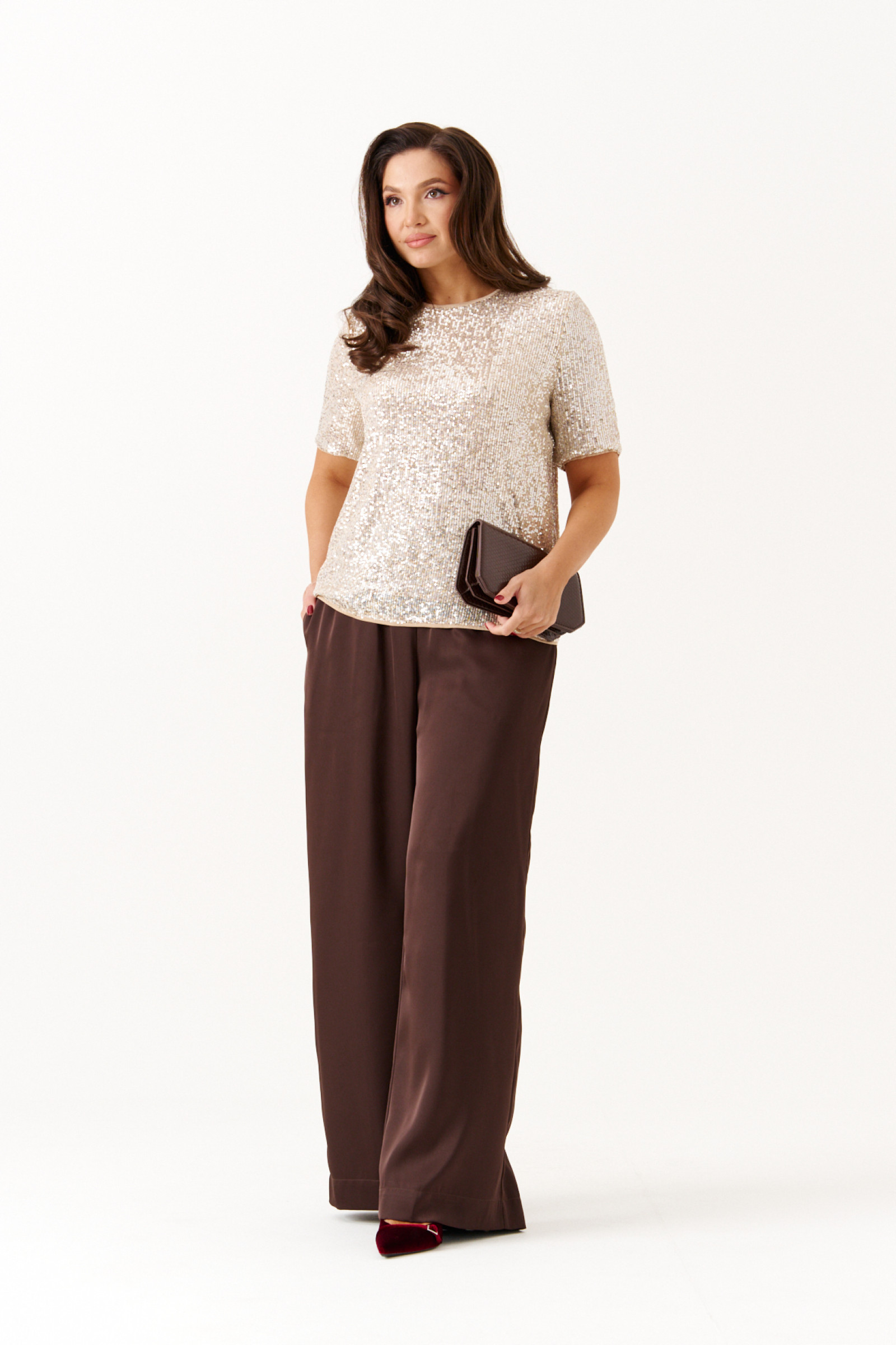 Блузка женская из ткани в пайетки с натуральной вискозной подкладкой. Блузка прямого силуэта для торжественных мероприятий. Низ изделия и горловина блузки обработаны каймой из сетки. Рукав длиной до уровня локтя, низ рукава обработан каймой из сетки. Отличный вариант для тех, то любит носить качественные изделия с натуральной и дышащей подкладкой, а особенно для тек, кто выбирает всегда выглядеть шикарно. Блузка станет замечательным выбором для вечернего образа, который будет очаровывать всех своей изысканностью.