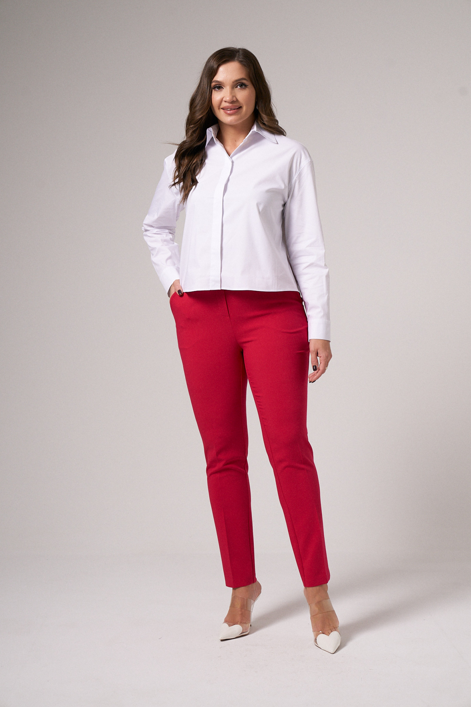 Блузка женская из смесовой ткани для повседневной носки. Блузка прямого силуэта, супатная застежка. По спинке имеется отрезная кокетка. Горловина обработана рубашечным воротником с отрезной стойкой. Низ рукава обработаны притачной манжетой, застежка на одну обметанную петлю и одну пуговицу. По низу изделия, по краю воротника, окату рукава, верхнему шву манжеты проложены отделочные строчки. Стильная и очень удобная блузка станет вашим фаворитом на любой выход.