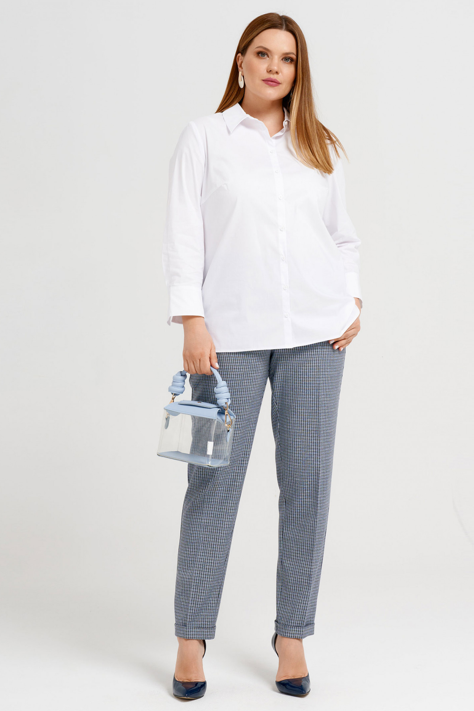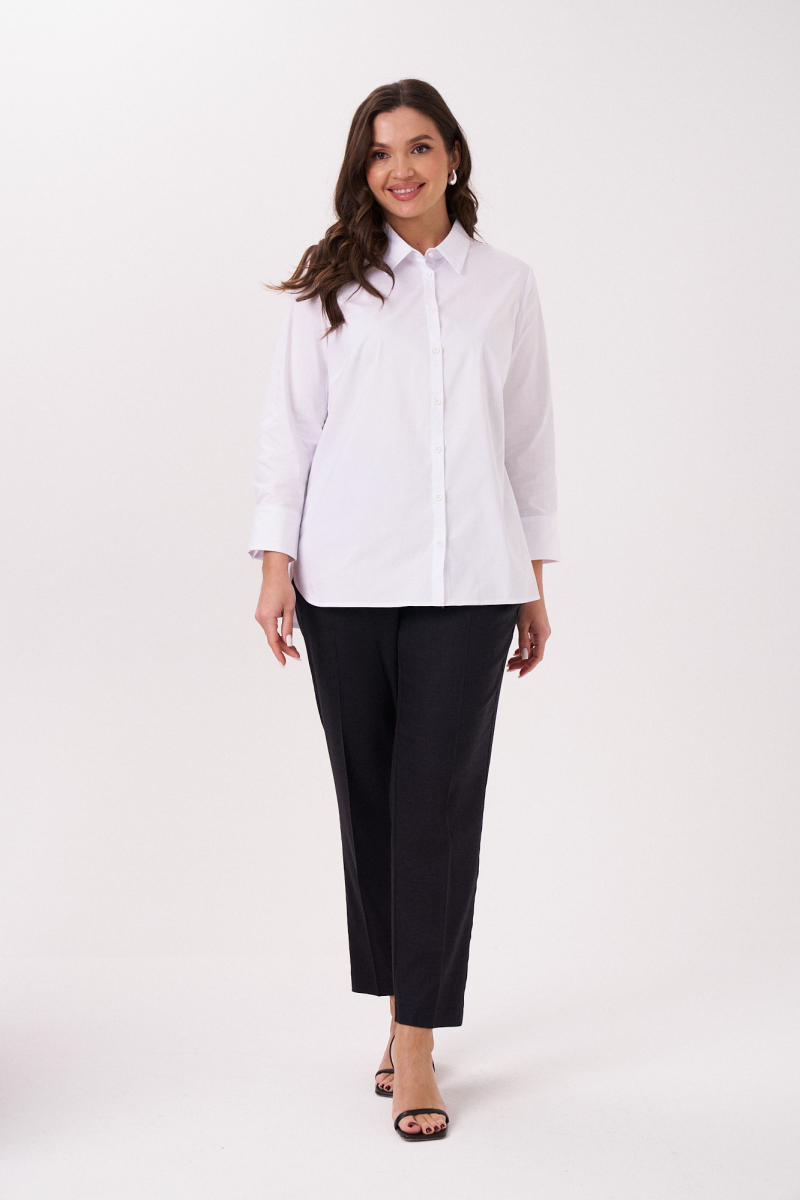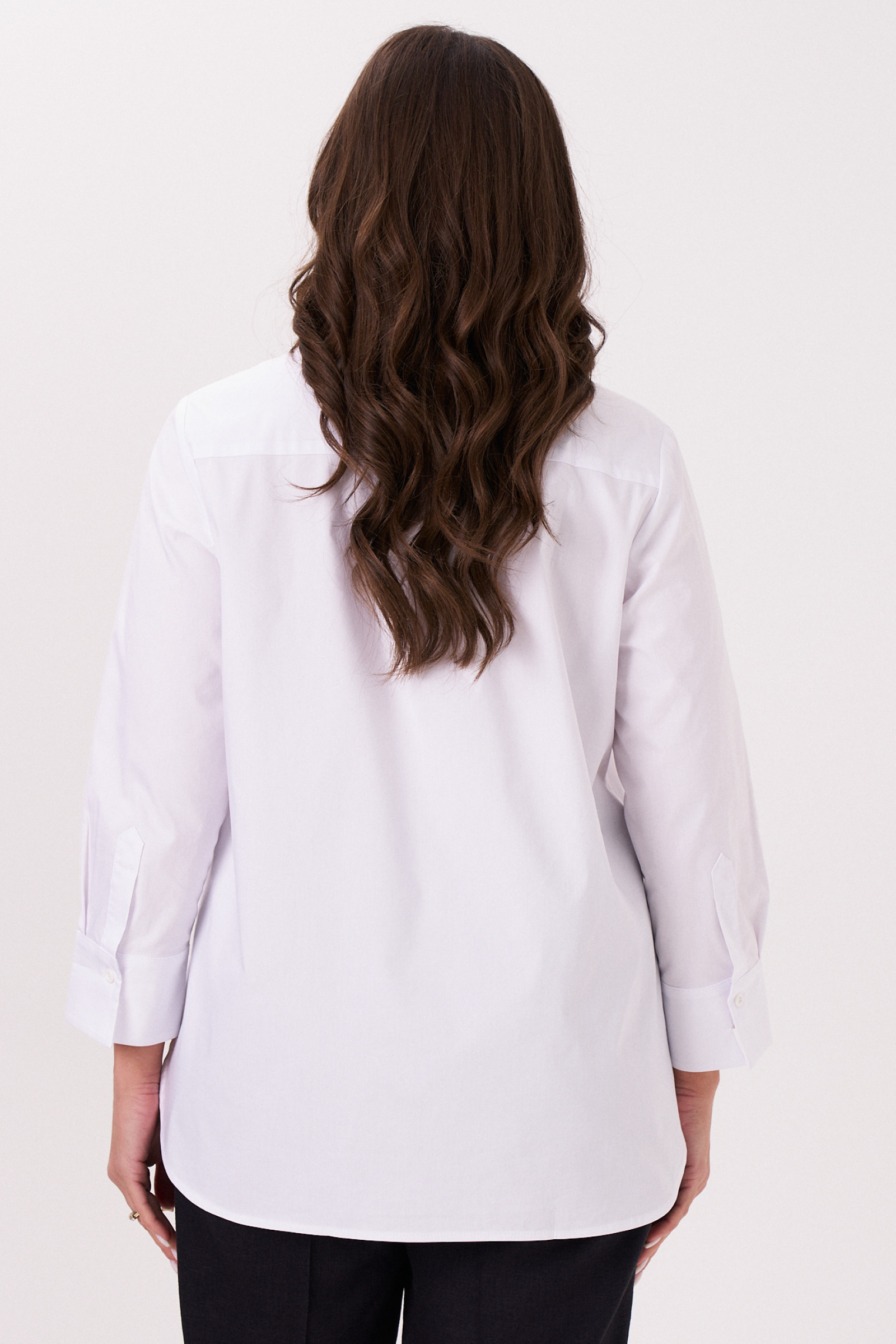 Стильная блузка из хлопковой ткани. В блузке сделан акцент на офисный стиль, классика. Блузка полуприлегающего силуэта, с застежкой на потайную планку, с нагрудными вытачками по переду, на спинке кокетка, рукава удлиненные на манжете.