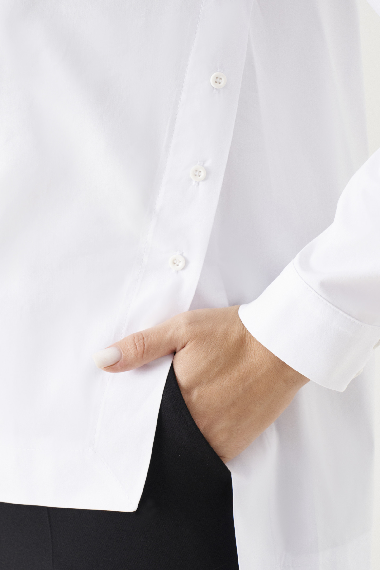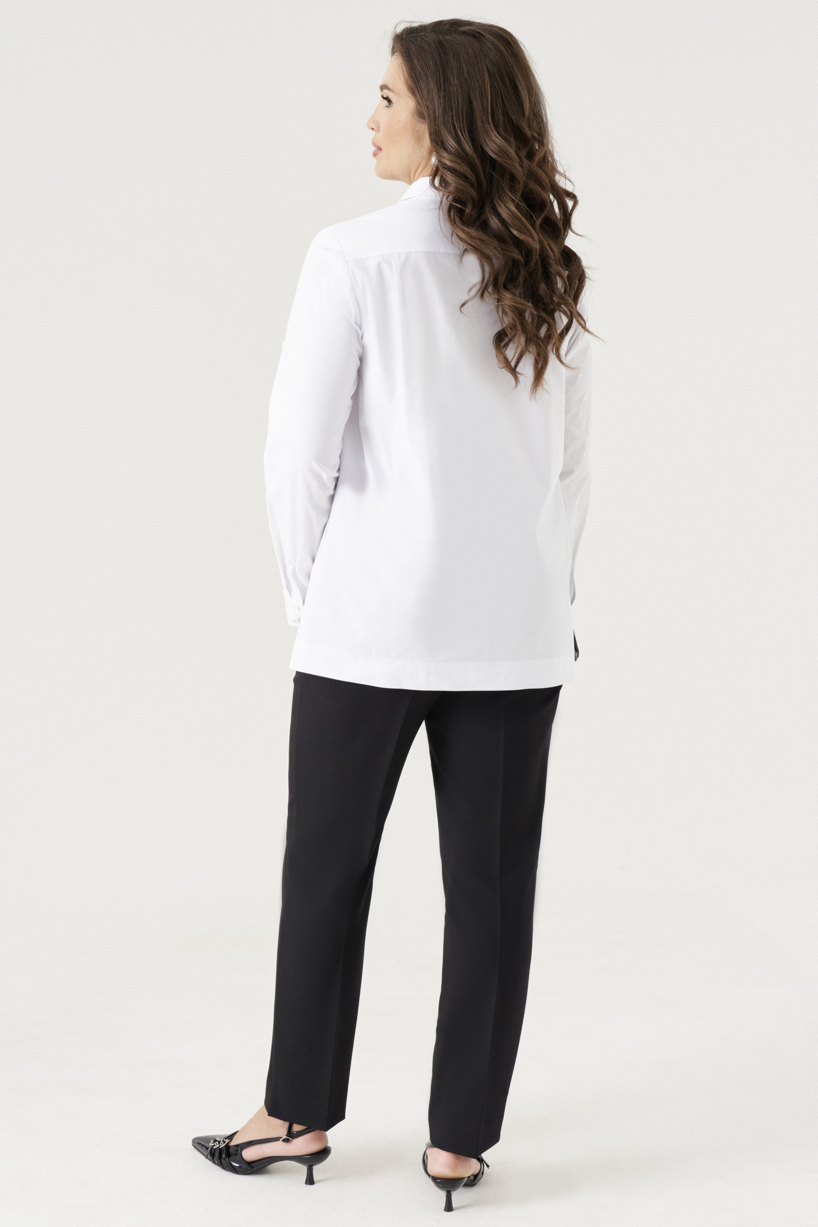 Классический шик, блузка прямого силуэта, с нагрудными вертикально расположенными вытачками, идущими от плечевого шва, с центральной застежкой на петли пуговицы, воротник отложной со стойкой, с боковыми отрезными деталями и пуговицами, спинка дленее переда, рукава длиные. Хороший вариант как для офиса, так и для выхода в свет.
