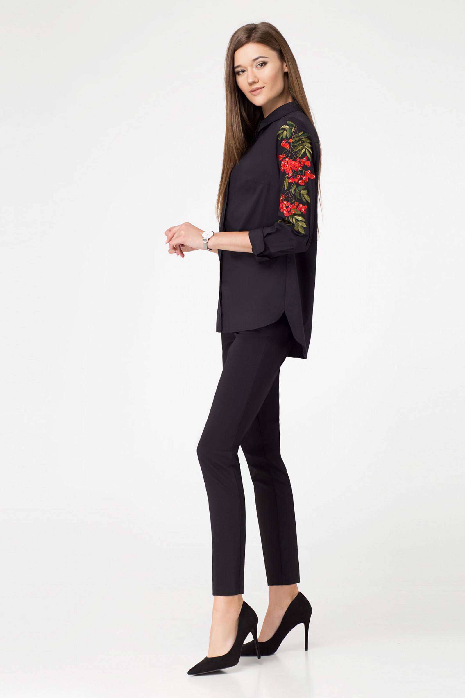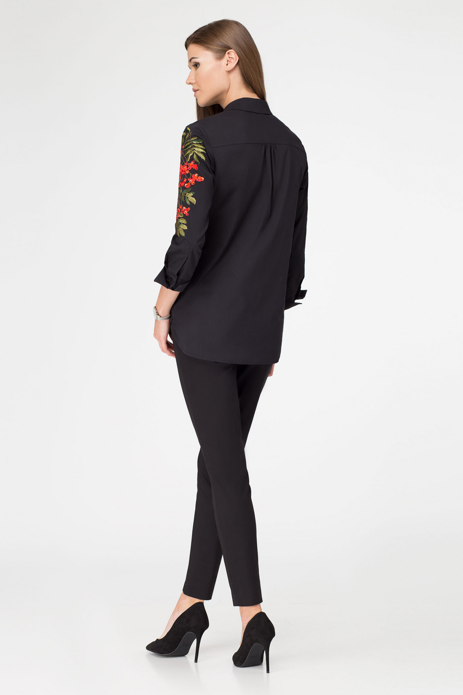 Блузка с вышивкой белая придаст вашему образу женственность и нежность. Даже в каждодневной суете в ней вы будете ощущать себя элегантной и романтичной натурой. Нарядная блузка подойдет даже под деловой образ со строгими классическими брюками или прямой юбкой. Наденьте ее с любимыми джинсами - и получите эффектный повседневный аутфит. Белая блузка полуприлегающего кроя визуально стройнит фигуру.Белая рубашка украшена гроздьями рябины, вышитыми на длинных рукавах с манжетами. Декор не кажется навязчивым, а придает модели утонченность.Низ изделия - асимметричный, скругленный, с разрезами в боковых швах. Застежка скрыта в потайной центральной планке. Рубашечный воротник украшает пуговица красного цвета.Блузка с вышивкой женская изготовлена из хлопковой ткани с мягкой, гладкой поверхностью. Материал не сминается, не парит, за ним легко ухаживать - стирать и гладить.Вы можете купить рубашку с вышивкой женскую для своего базового осенне-весеннего гардероба.