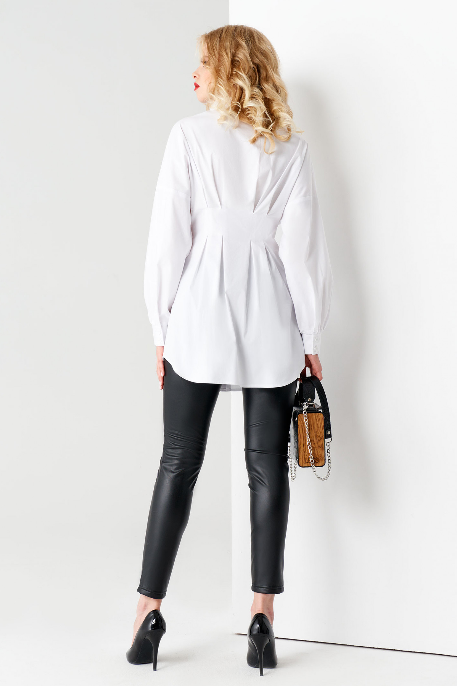 Эффектная блузка из хлопковой ткани, по линии талии приталенная, к низу расширенная и удлиненная , акцент сделан на вытачки по талии, с центральной застежкой на петли пуговицы, линия плеча спущенная. Спинка лаконичная, с талиевыми вытачками, линия низа фигурной формы. Рукава объемные с манжетой, на петли пуговицы. Все эксперименты с блузкой априори будет выглядеть стильно и непревзойденно, благодаря оригинальному крою создаст потрясающий образ для уверенной в себе девушке.
