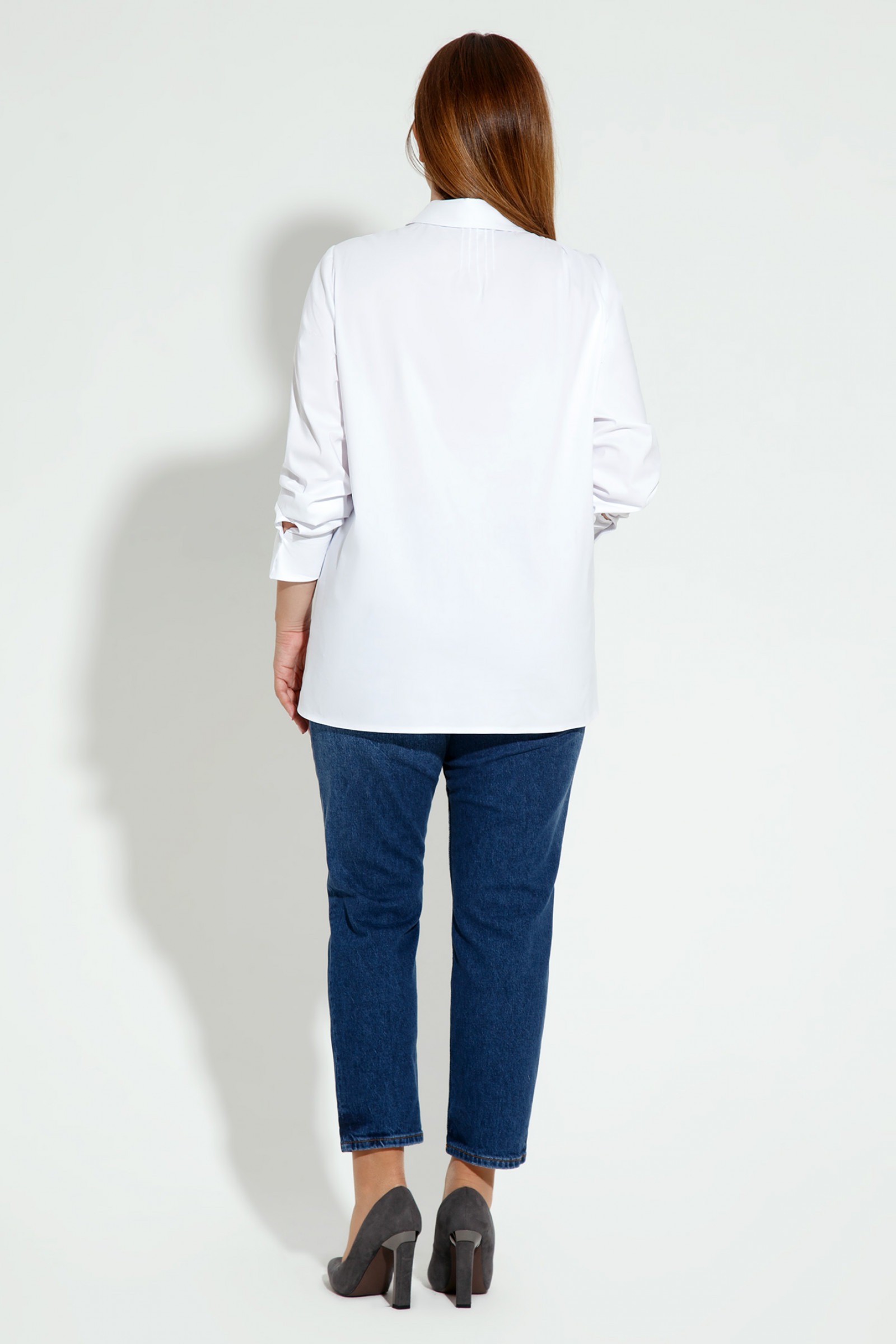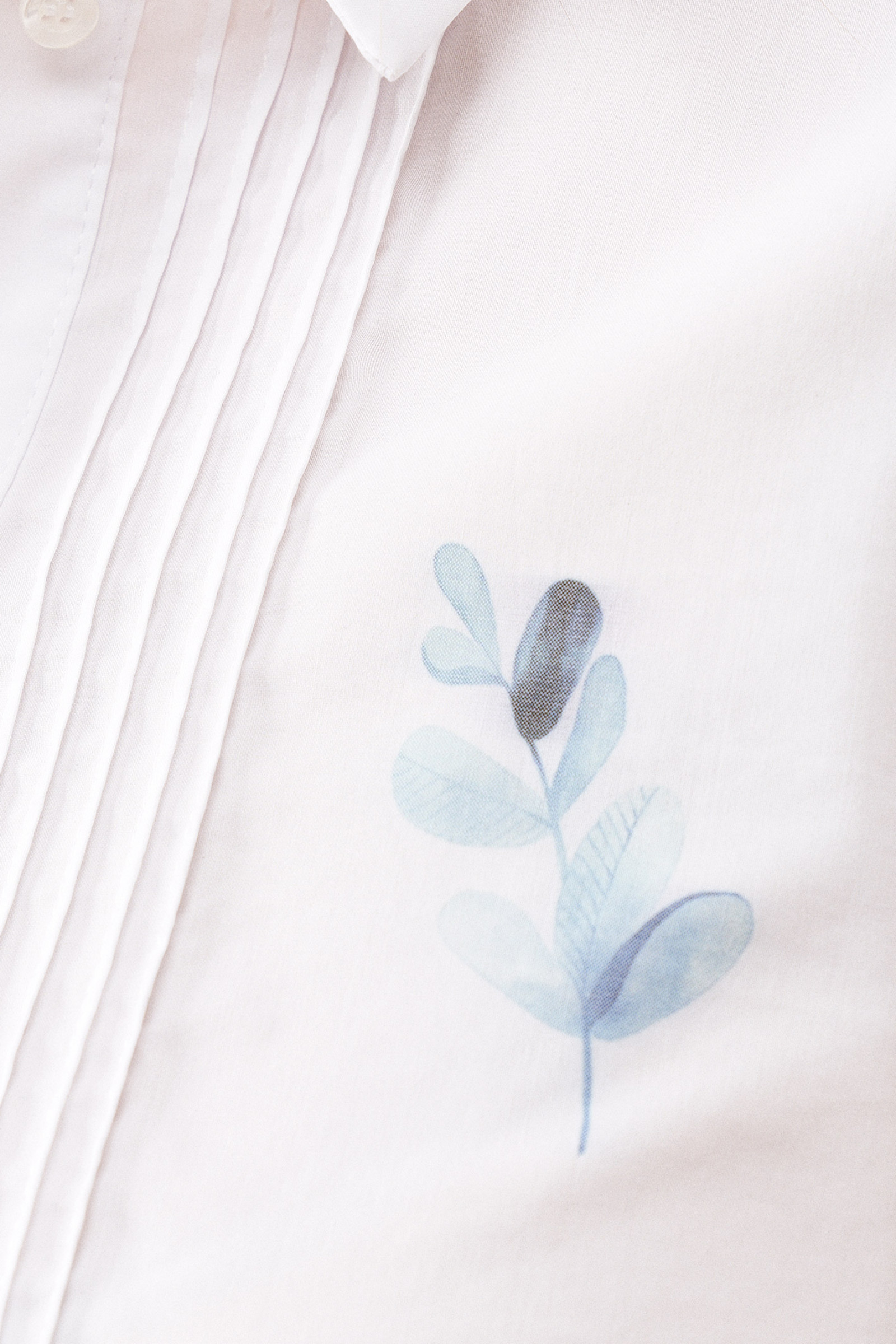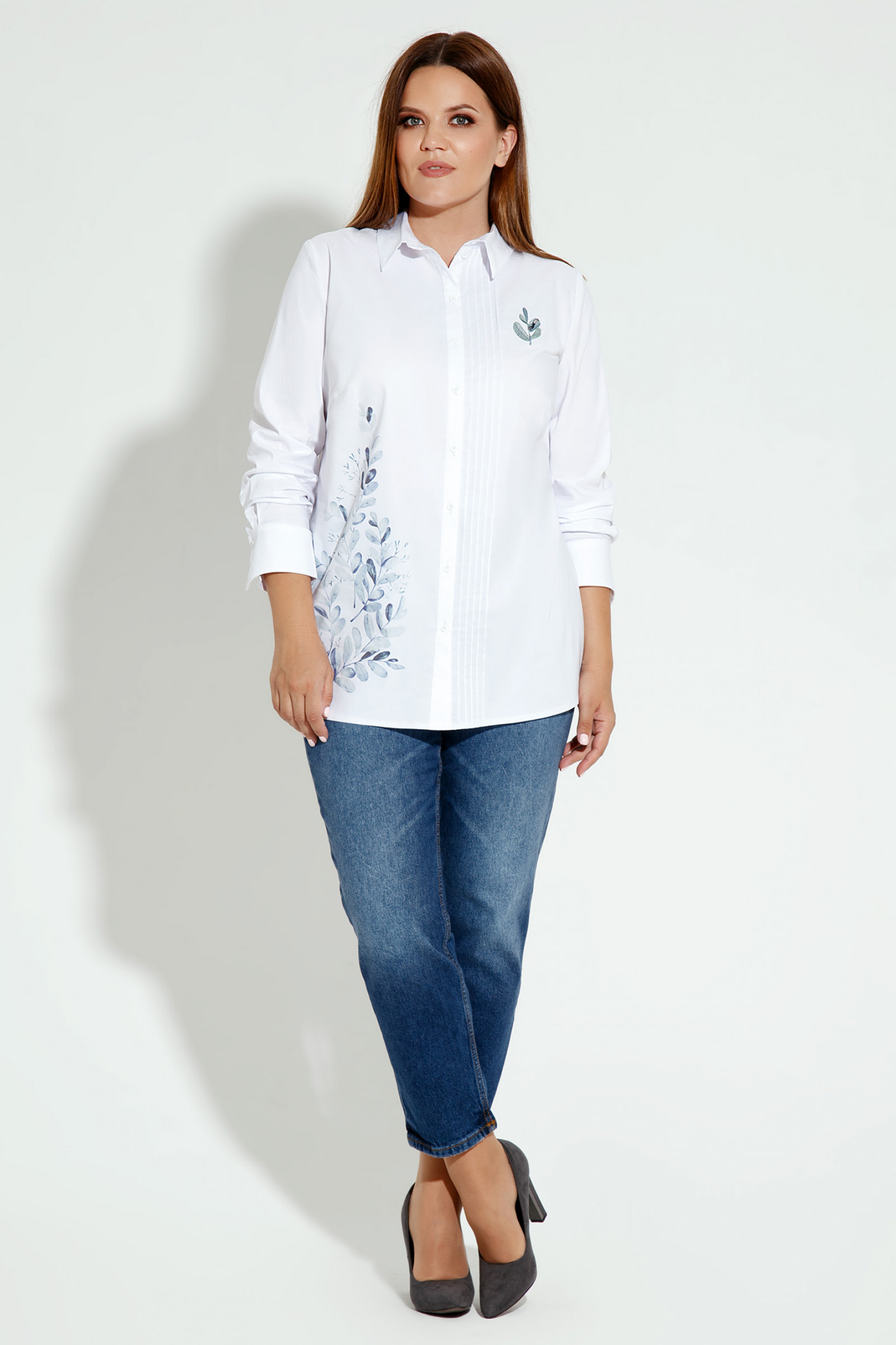 Практичная и элегантная блузка в классическом стиле выполнена из качественной хлопковой ткани с эластаном. Рукав длинный с отложным манжетом с заостренными уголками. Манжет застёгивается на одну петлю-пуговицу. Воротник рубашечный,отложной, на стойке. Застёжка спереди на отрезную планку и петли-пуговицы. По переду блузка декортрована вертикальными защипами и нежным принтом. По спинке также выполнены короткие защипы от среза горловины. Нагрудные вытачки обеспечивают идеальную посадку на фигуру. Прекрасный вариант блузки на каждый день для стильной и энергичной девушки.