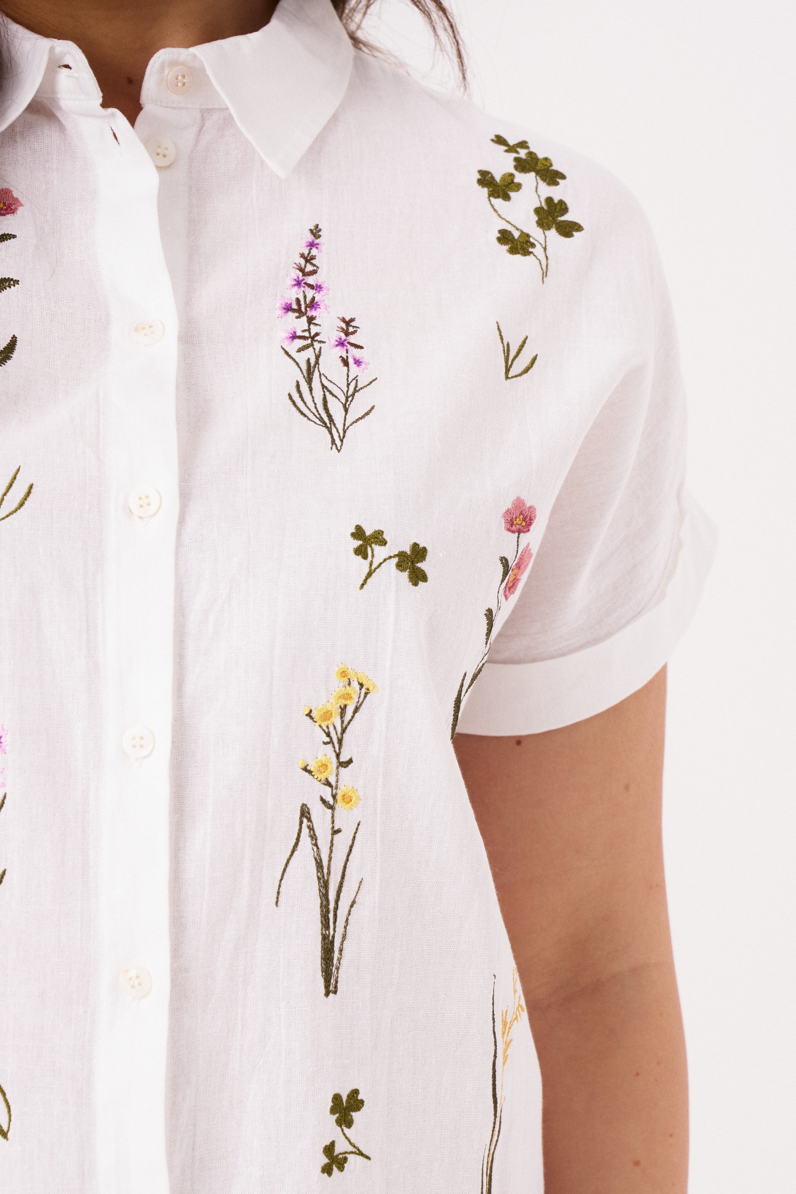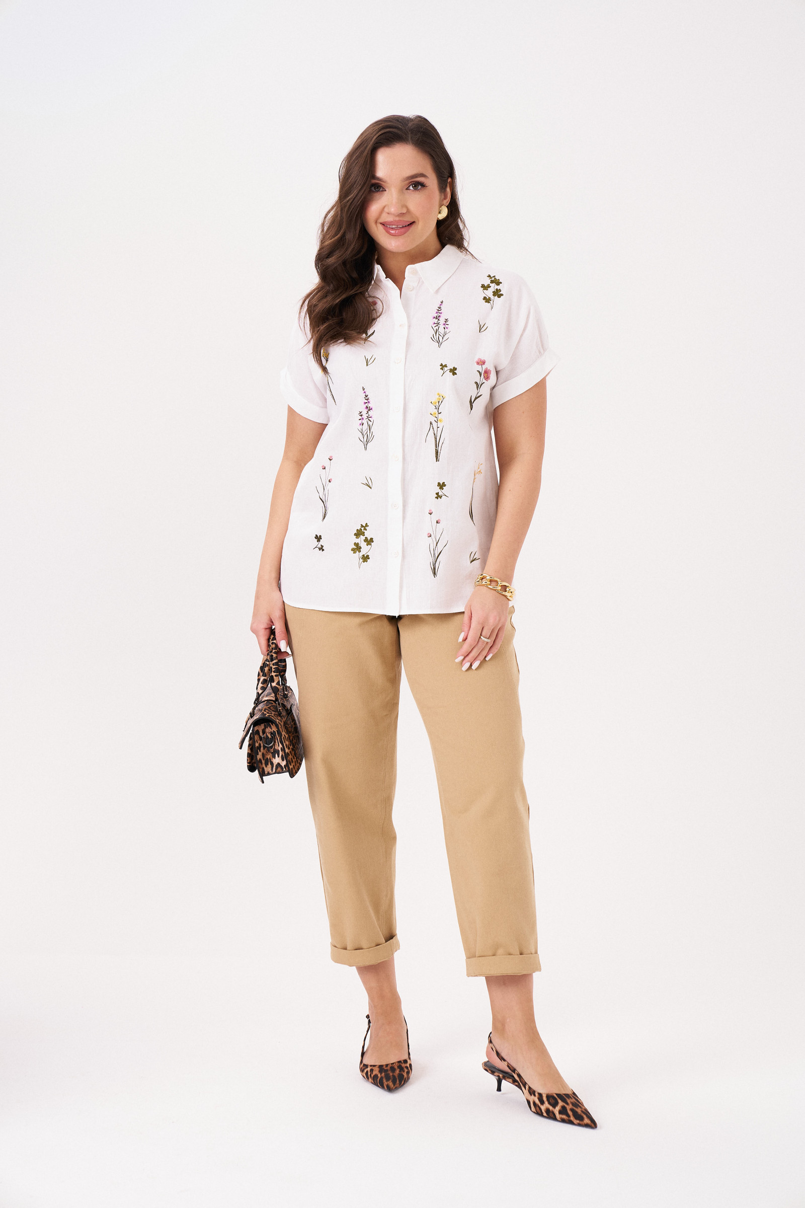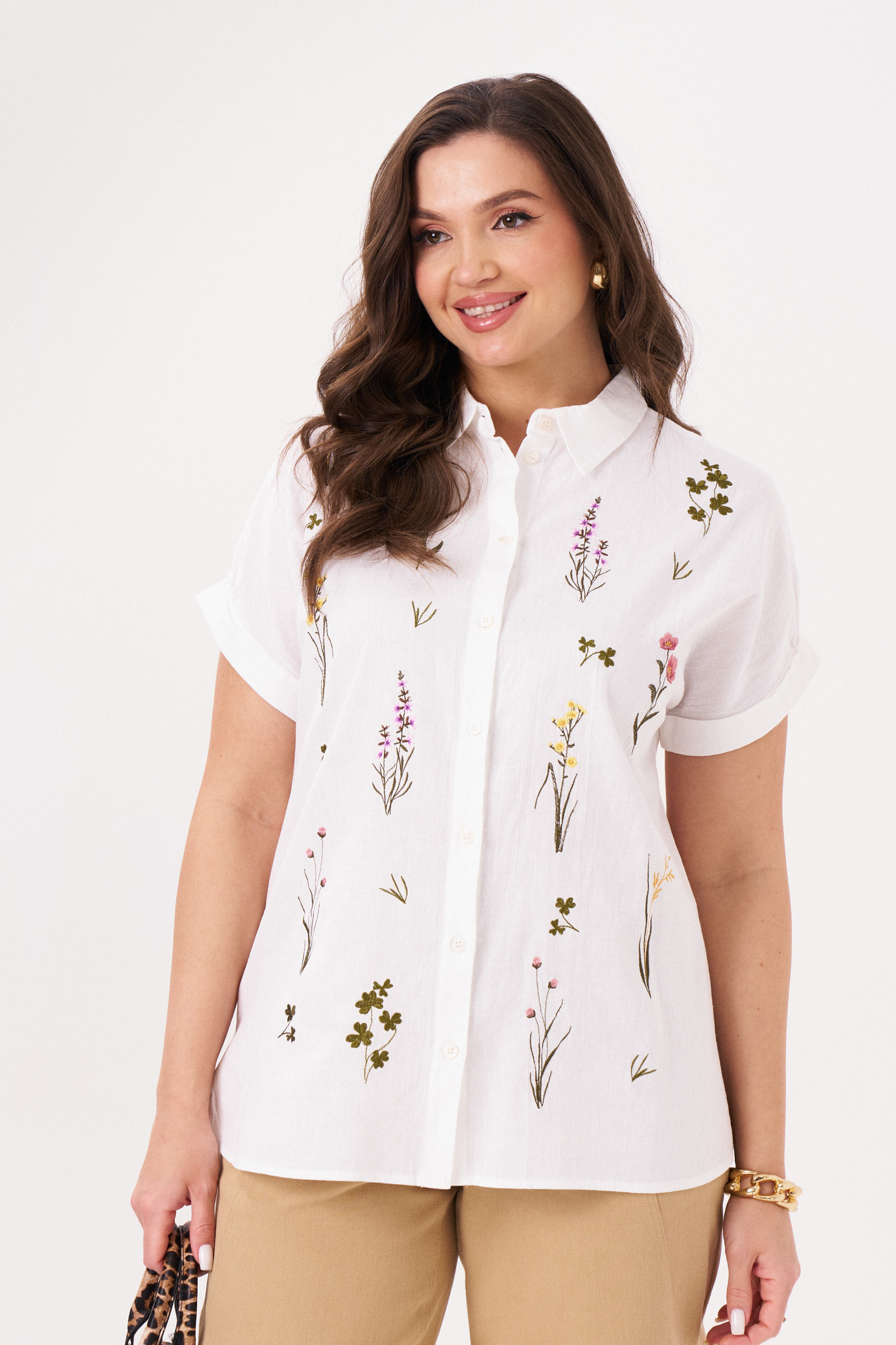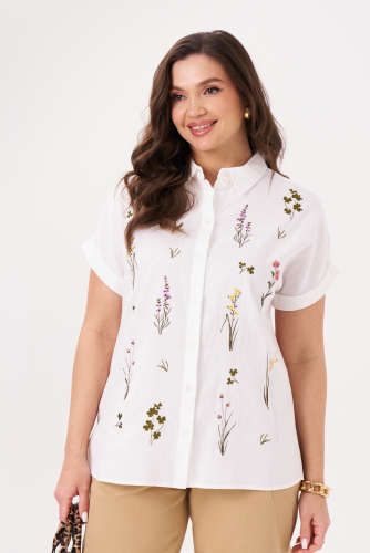 Блузка-рубашка скроена в полуприлегающем фасоне, подчеркивает стройность фигуры. По центральной вертикальной планке – застежка на пуговицы до самого отложного рубашечного воротника. Праздничная блуза дополнена коротким рукавом со спущенной линией плеча. Спереди модель украшена уникальной дизайнерской вышивкой с флористическими мотивами.
