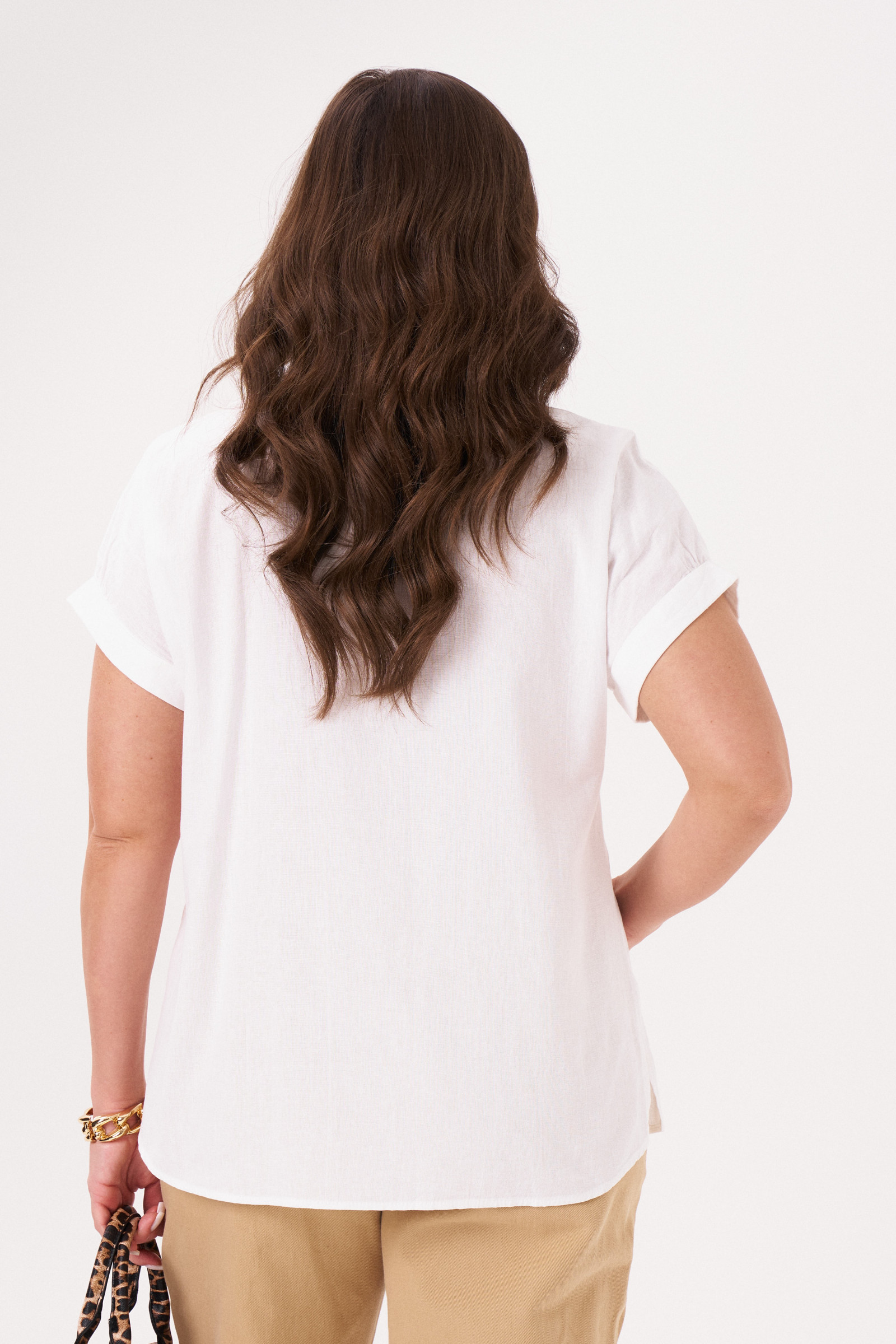 Блуза женская пошита из простого в уходе натурального хлопкового материала. Легкая ткань не раздражает кожу, не парит и хорошо отводит влагу.