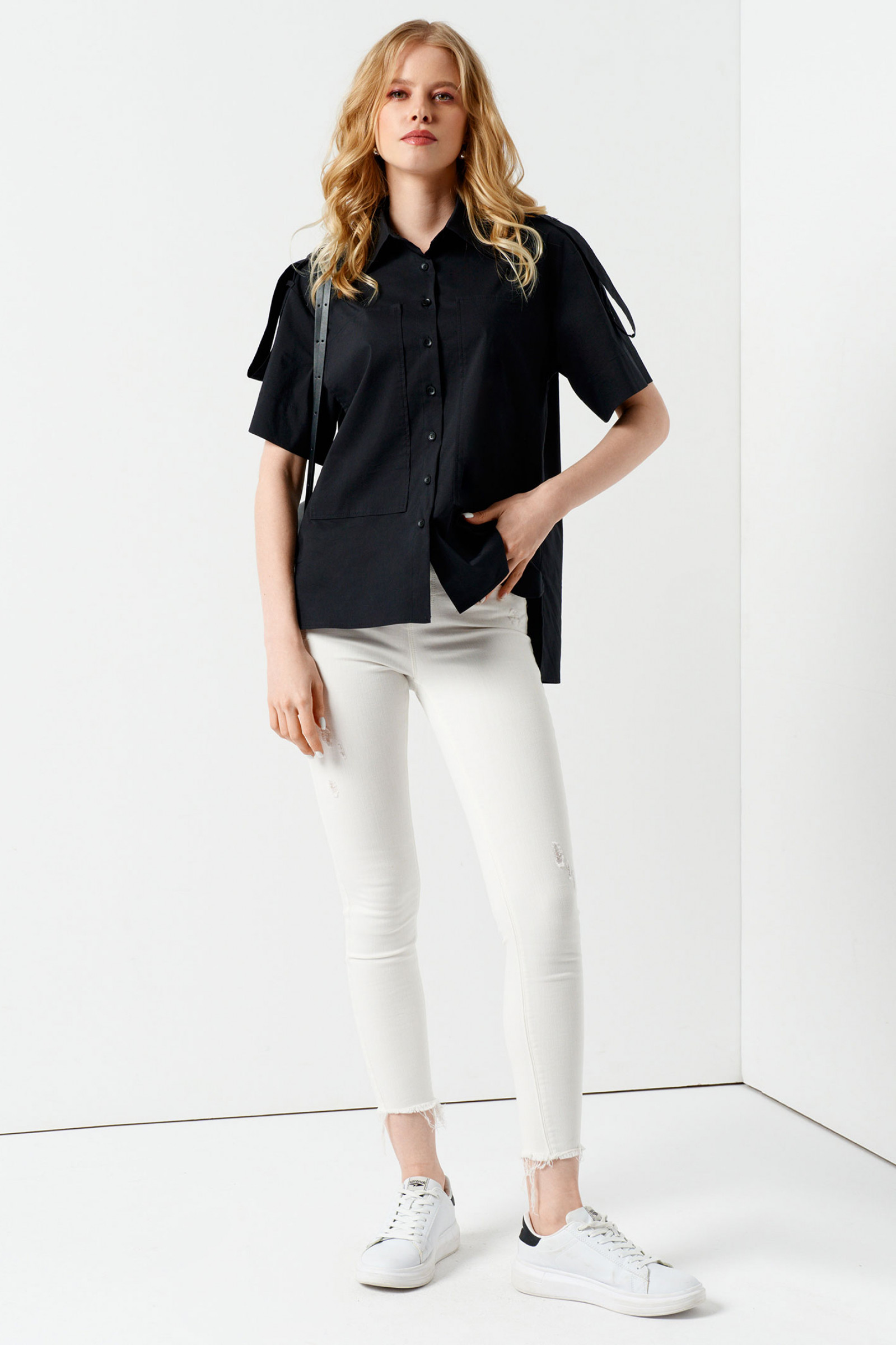 Белая блуза гармонично сочетает в себе элементы классического стиля и casual детали. Благодаря прямому крою и широким рукавам блузка рубашка свободно садится по фигуре и оставляет полную свободу движений. В этой стильной одежде вы будете чувствовать себя максимально комфортно даже в жаркую погоду.