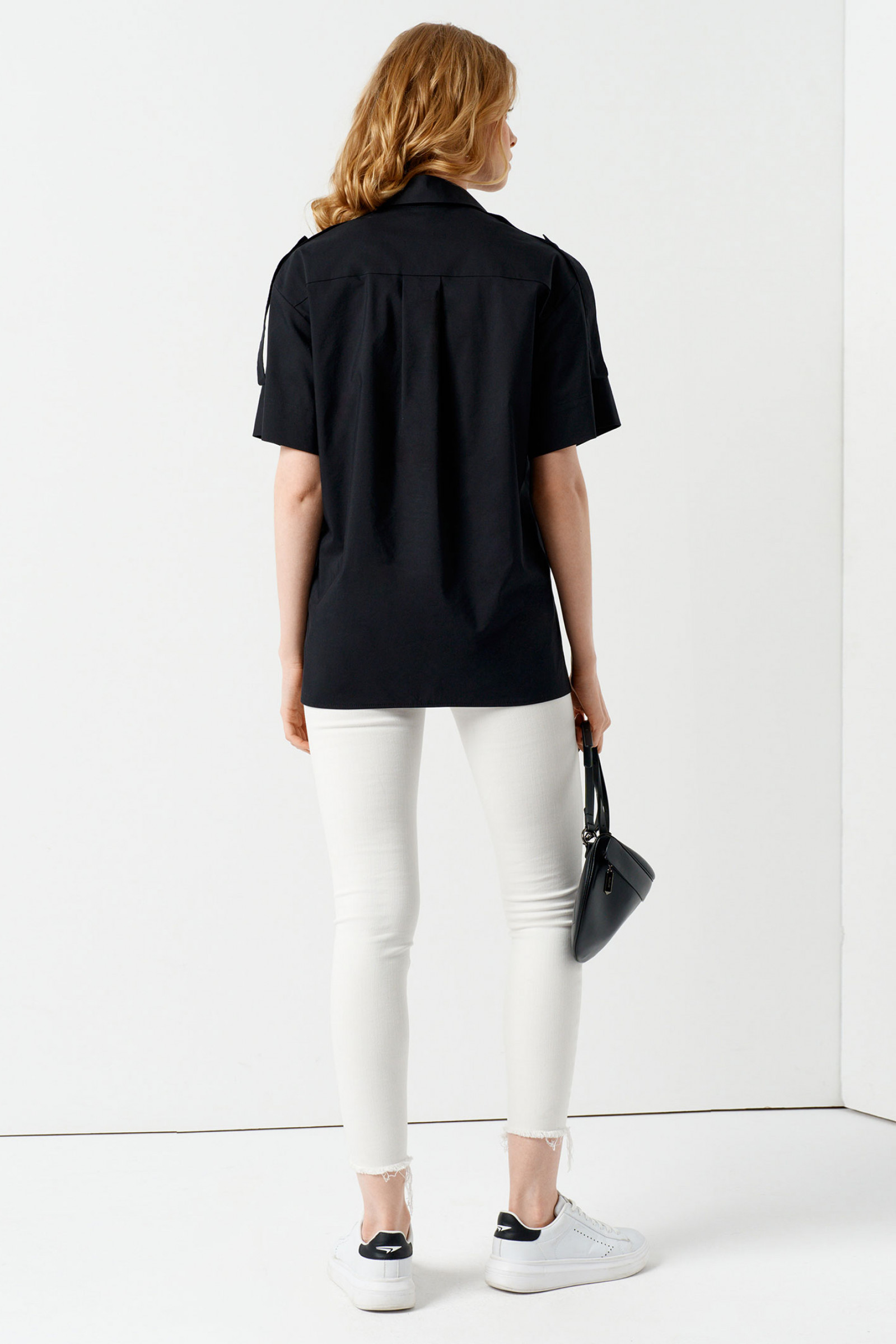 Стильная женская блуза с удлиненными нагрудными карманами станет отличной альтернативой классической рубашке в элегантных образах. Модель прямого кроя будет хорошо смотреться с классическими брюками, с прямыми и зауженными юбками, джинсами и шортами-бермудами.