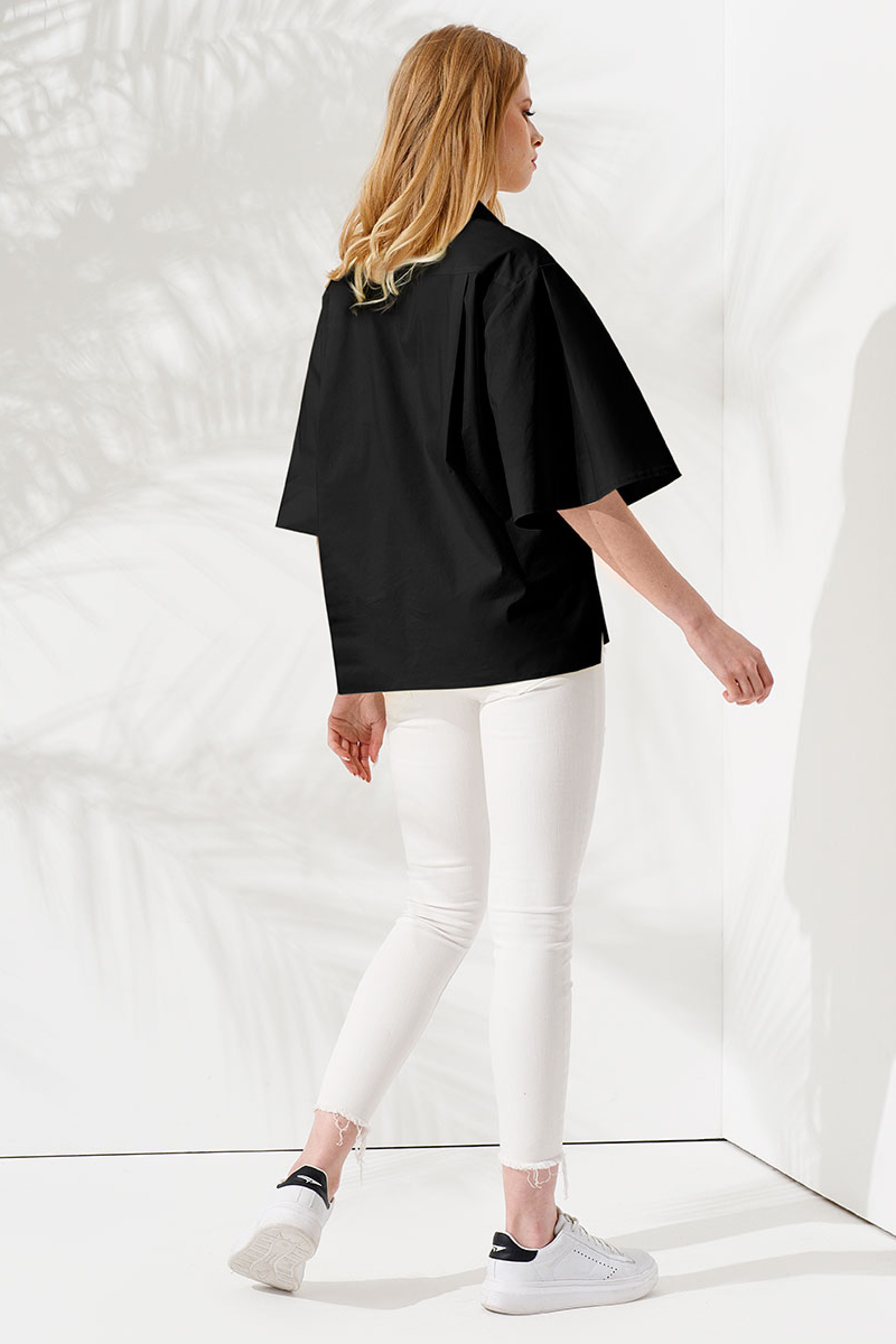 Блузка-рубашка создана в прямом силуэте, который выгодно стройнит фигуру, маскируя ее недостатки в области плеч, груди, живота. Рукав длиной до локтя – объемный, благодаря складкам по окату. Линия плеч – приспущенная. Летняя блуза застегивается на крупные пуговицы контрастного тона по центральной планке. Белая рубашка дополнена отложным воротником и нагрудным накладным карманом на левой полочке.