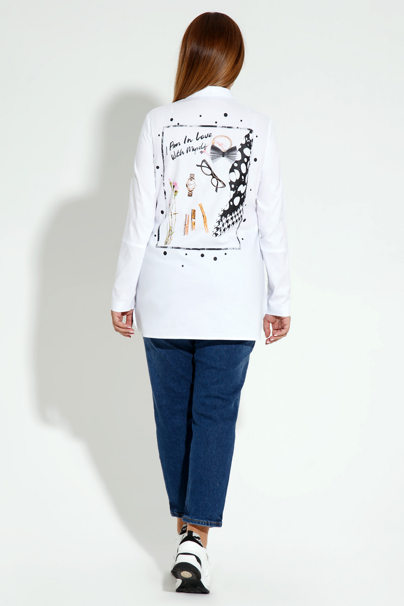 Стильная белая, хлопковая блузка, перестанет быть скучной, благодаря деталям отделки, которые дизайнеры подобрали наилучшим образом. Блузка полуприлегающего силуэта, с застежкой на петли пуговицы контрастного черного цвета, на деталях переда верхний карман, оригинальной формы, с закрепками контрастного черного цвета, на левой детали шрифтовая печать. Спинка прямая, с декоративной оригинальной печатью, придает блузки самодостаточность. В этой блузке, вы будите притягивать взгляды окружающих.