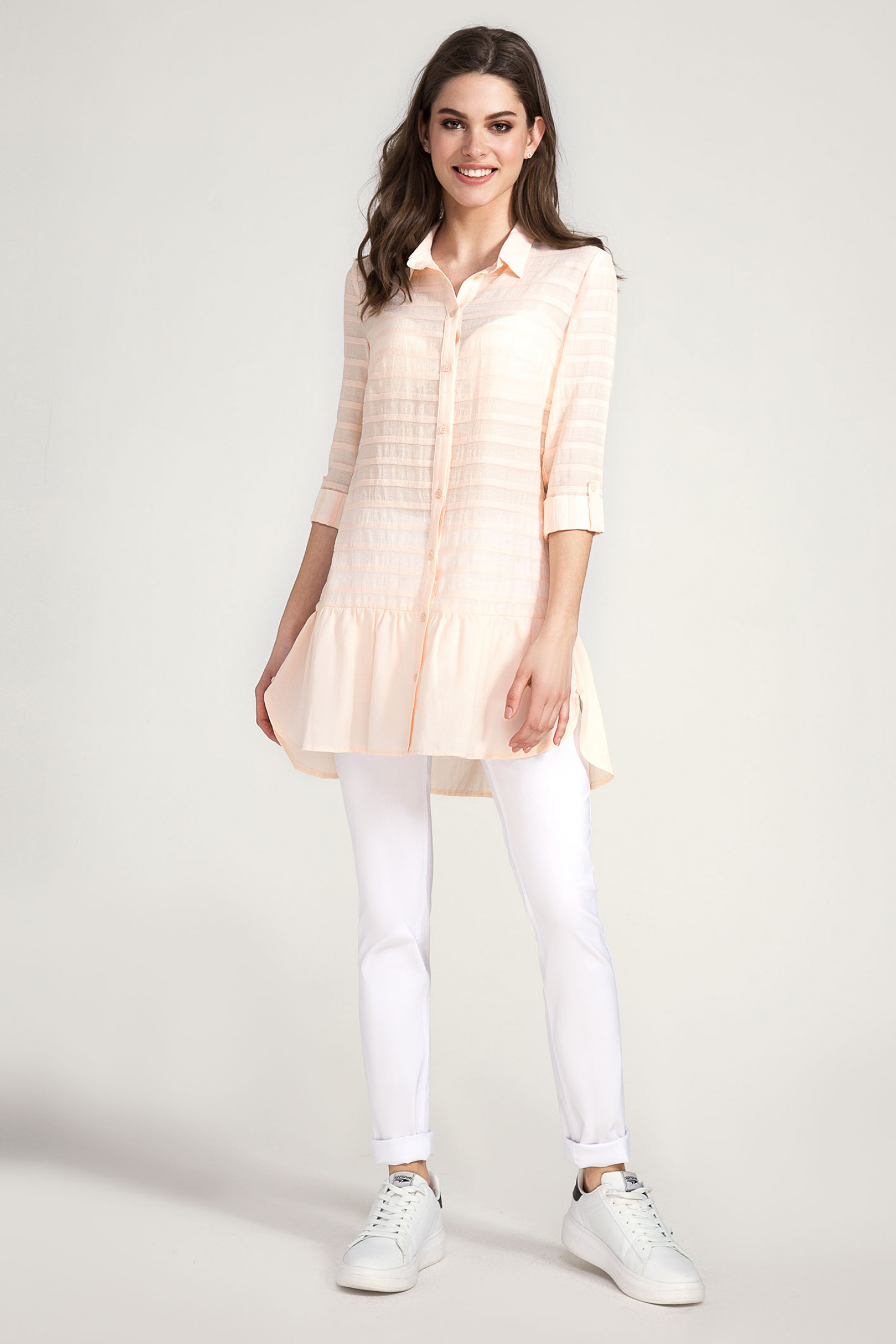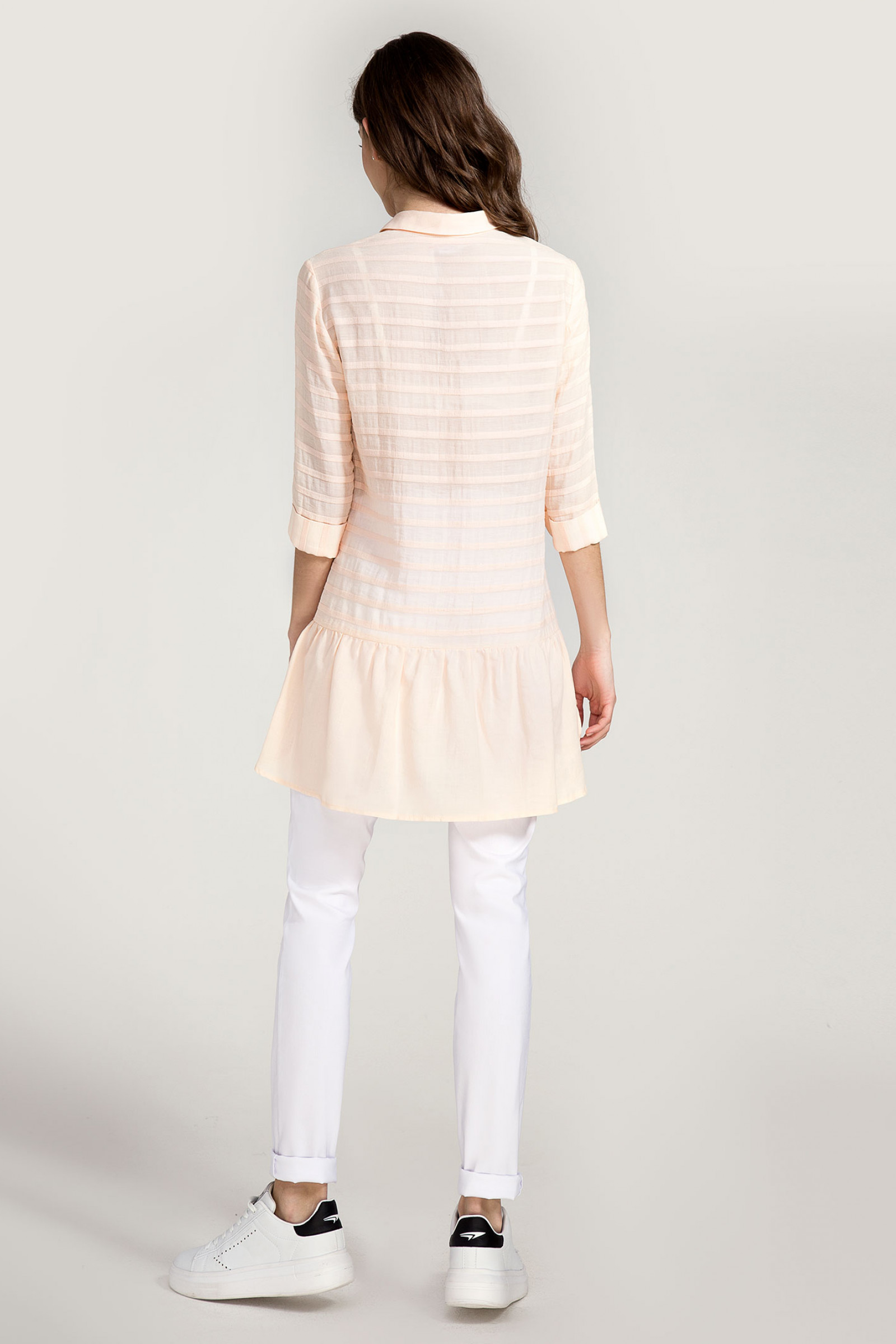 Стильная блузка из хлопковой ткани в сочитании с полоской. Блузка прямого силуэта с притачной баской по низу, с центральной застежкой на петли пуговицы, спинка прямая с баской по линии низа. Рукава втачные с манжетой и патой на пуговицу. Отличный вариант на отдых. Для контраста можно добавить аксессуары, что сделают образ еще более ярким.