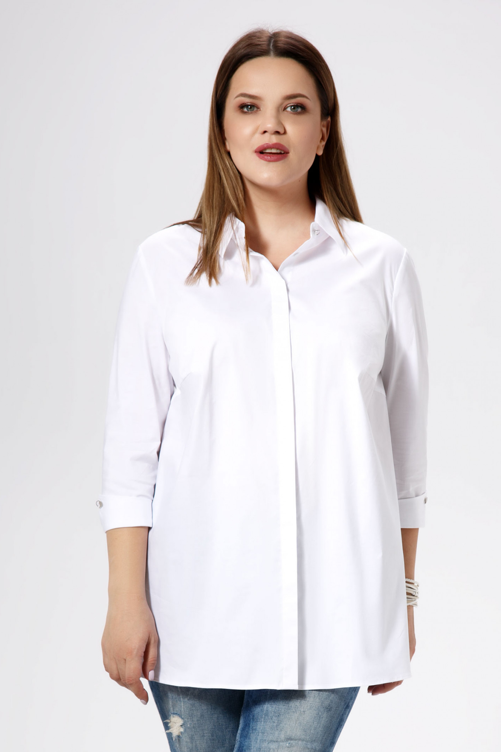 Лаконичная и строгая блузка из хлопковой ткани – отличный вариант для офиса. Блузка полуприлегающего силуэта слегка расширенная к низу, по бокам имеются небольшие разрезы. Блузка с центральной сквозной застежкой на потайные петли и пуговицы и одну декоративную пуговицу на стойке воротника. По переду имеются нагрудные выточки, по спинке имеется кокетка, от кокетки - небольшая сборка, что обеспечивает особый комфорт. Рукава длиной чуть ниже локтя, с отложными манжетами. На манжетах имеются декоративные петли и пуговицы. Такая блузка отлично сочетается с различными брюками, джинсами, сарафанами, создавая стильный современный образ.
