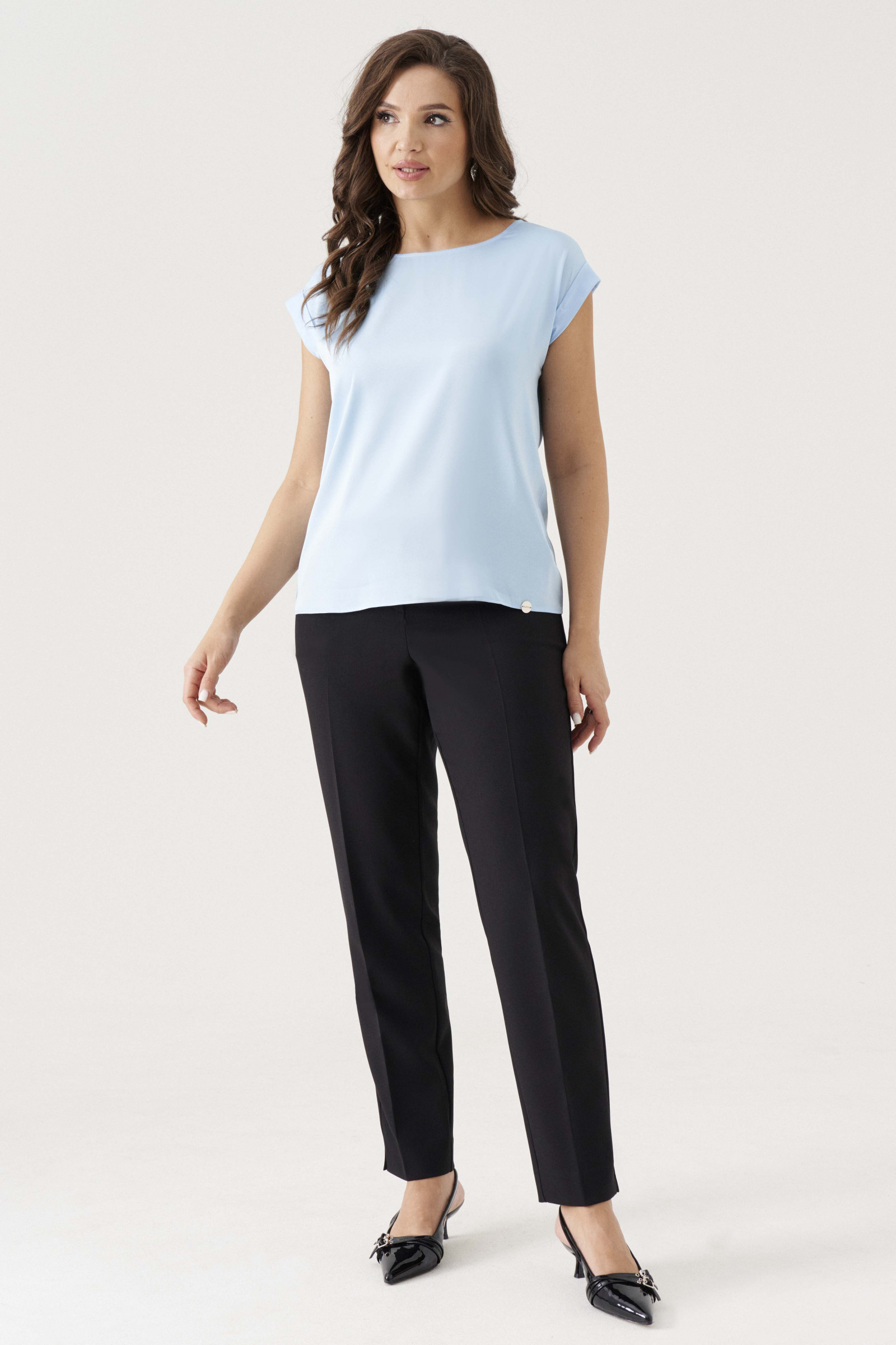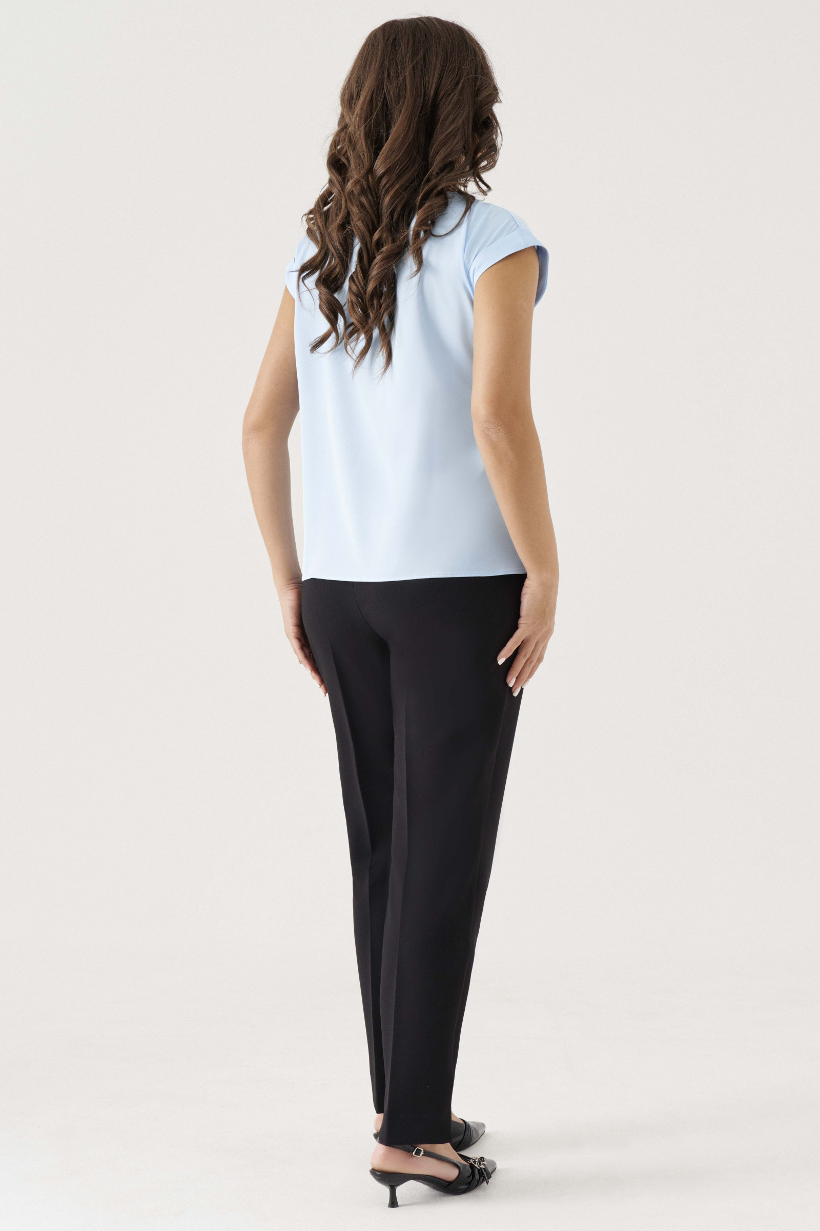Блузка женская в офис имеет неформальный вид, в отличие от традиционной одежды в деловом стиле. Проймы рукавов украшены отложными манжетами. Лаконичный дизайн позволяет носить различные аксессуары, жакеты и пиджаки, тем самым меняя повседневные образы.