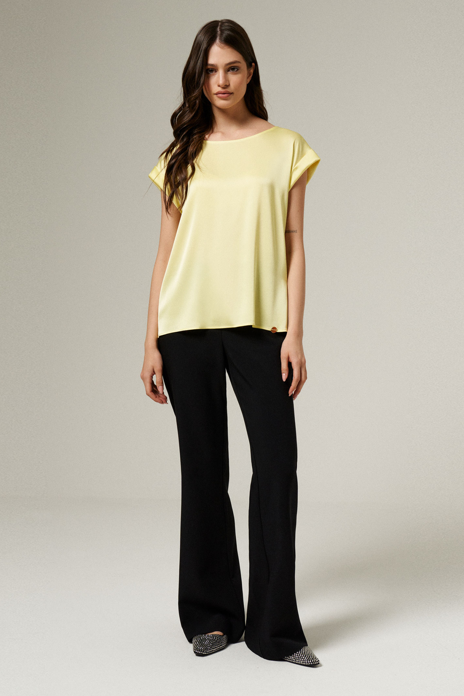 Блузка женская с коротким рукавом выглядит изящно благодаря мягкой ткани с характерным блеском. Она изготовлена из полиэстера и эластана - износоустойчивой и приятной на ощупь ткани, которая легко тянется и хорошо пропускает воздух. Блузка с коротким рукавом, вырезом горловины «лодочка» и аккуратно обработанным низом выполнена в прямом фасоне.