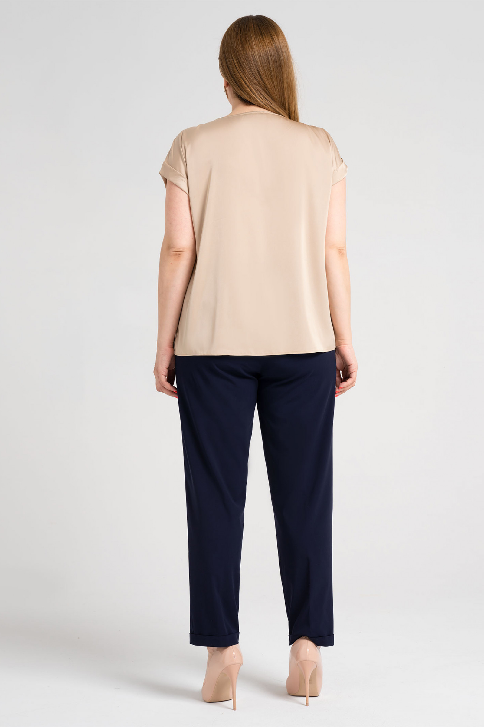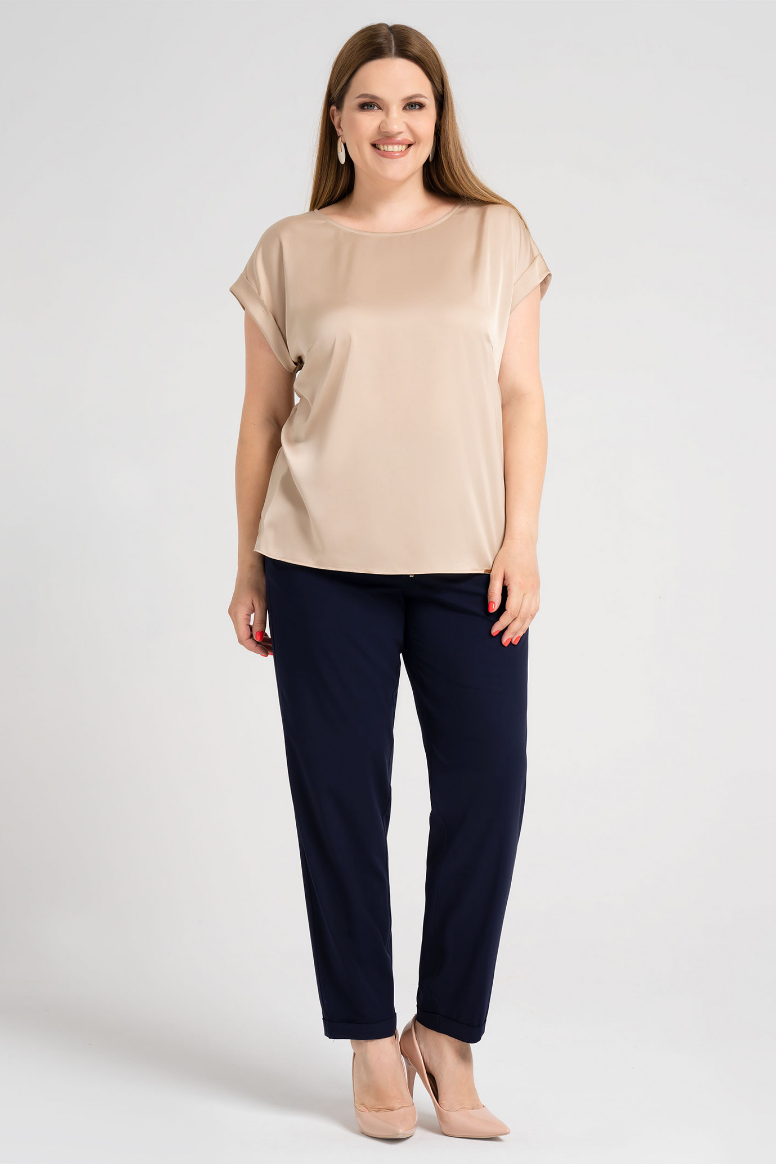 Лаконичная базовая блузка из тонкой струящейся ткани с небольшим блеском. Блузка полуприлегающего силуэта с круглым вырезом горловины, с нагрудными вытачками. Горловина обработана внутренней окантовкой. Проймы блузки обработаны декоративными отложными манжетами. Такая универсальная базовая блузка станет неотъемлемым дополнением вашего гардероба.