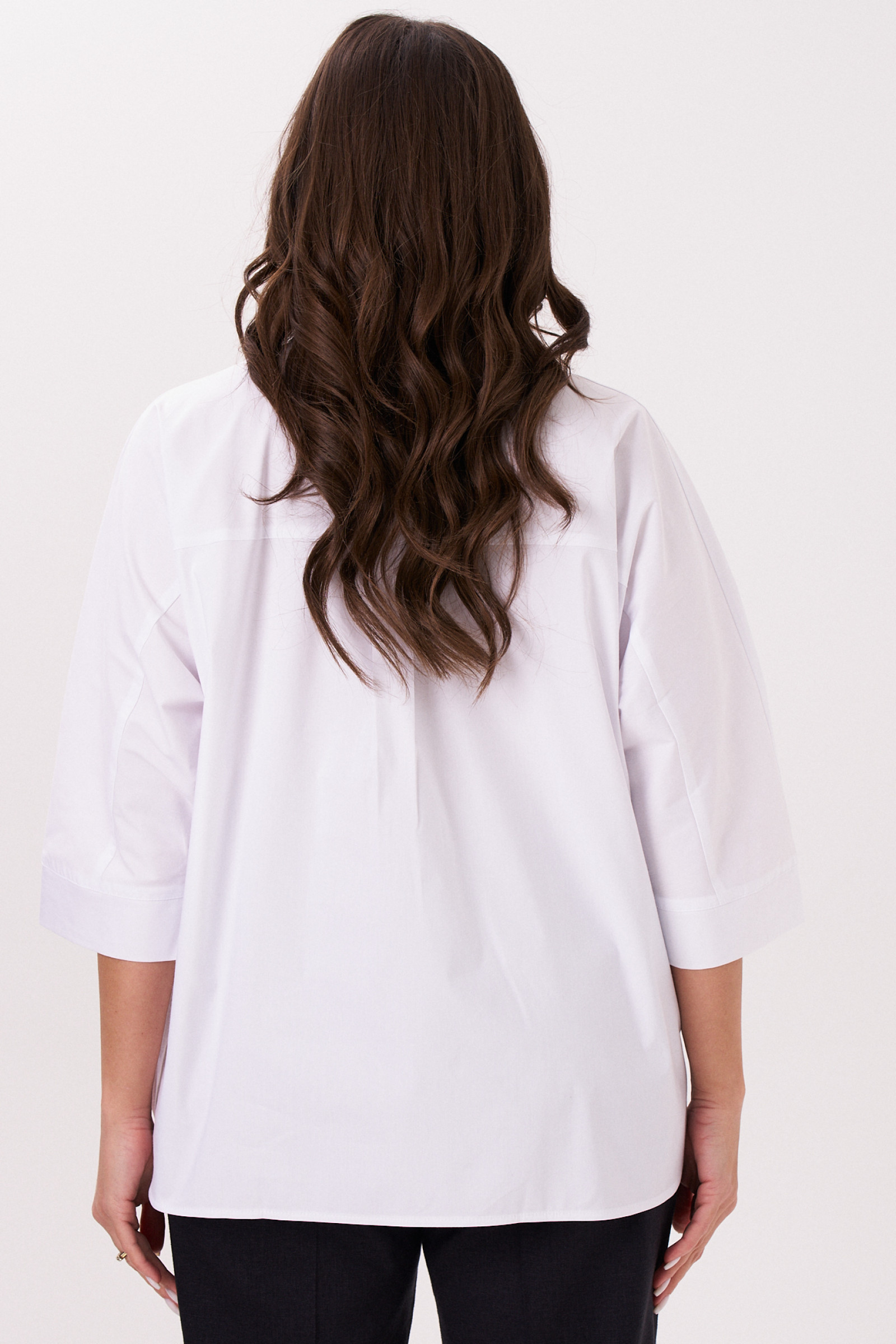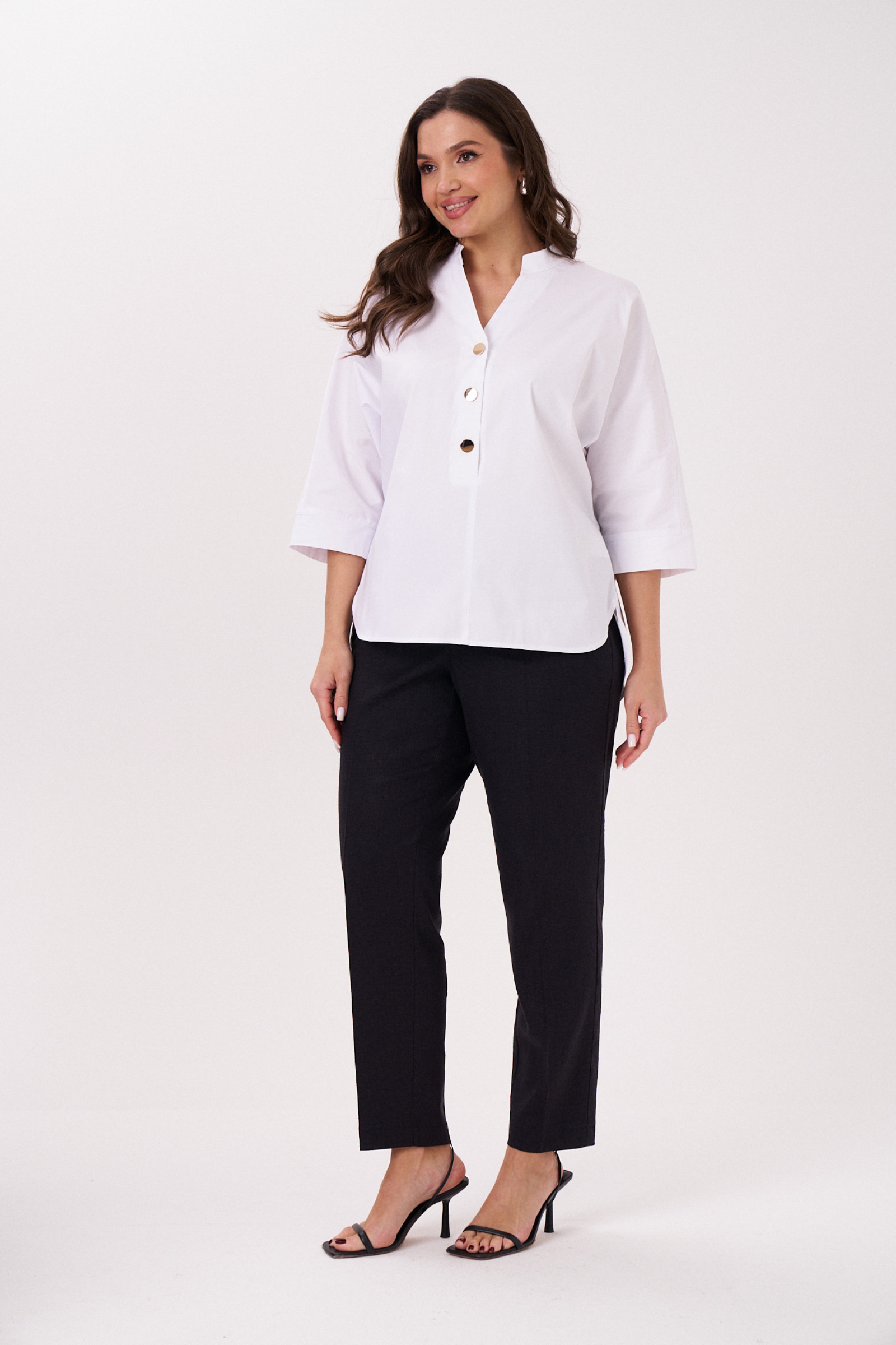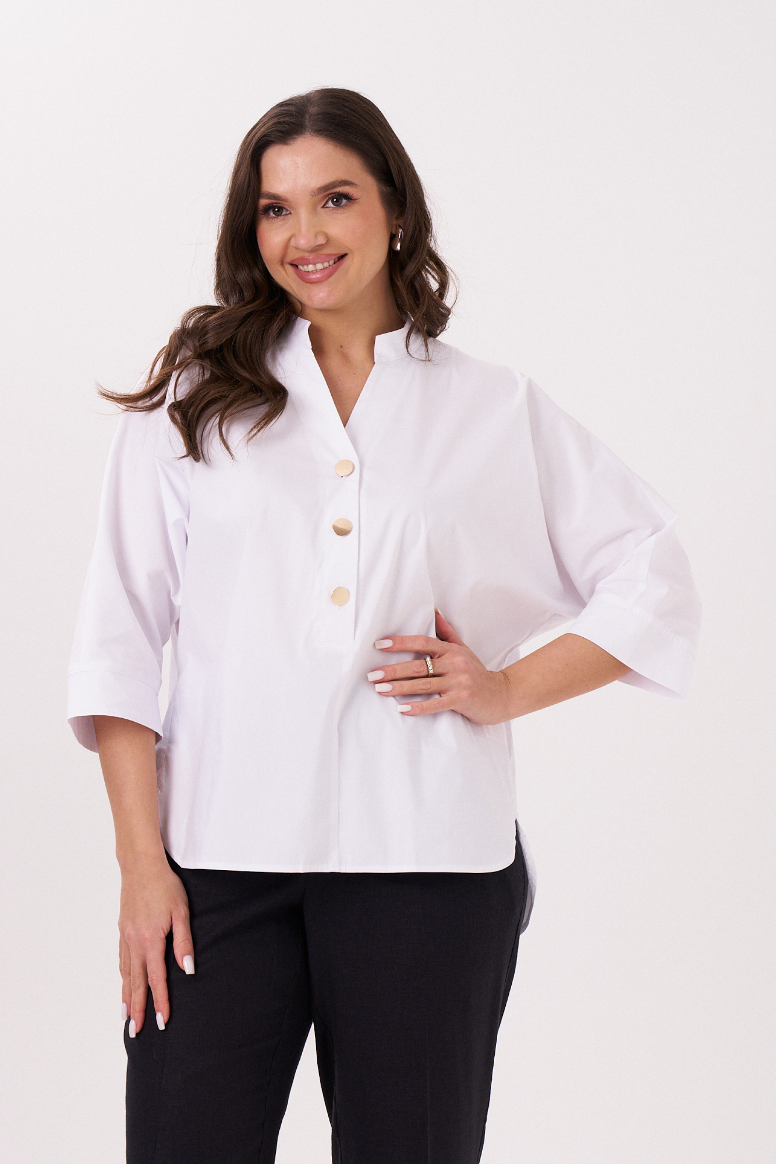 Блузка офисная свободного кроя со спущенной линией плеча. Перед с воротником-стойкой и V-образным вырезом, подчеркнутым блестящими пуговицами на центральной застежке. Блузка летняя женская украшает аккуратный закругленный низ, разрезы в боковом шве и удлиненная спинка с пришивной кокеткой и складкой. Это обеспечивает идеальную посадку на плечах.