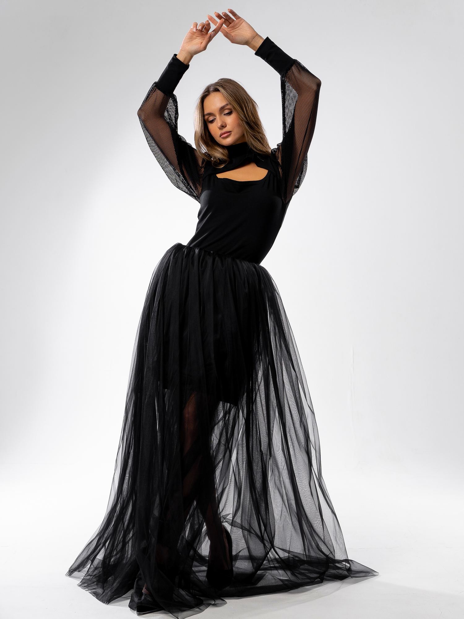 Изящное женское боди облегающего силуэта с эффектом утяжки из кулирки черного цвета c длинными пышными рукавами из сетки. Высокие манжеты из основного полотна. Воротник- стойка, сзади по спинке - застежка- молния. Спереди выше линии груди - оригинальный изящный вырез. Низ оформлен в виде трусиков-слипов с застежкой на крючки и петли. Боди идеально садится по фигуре и создает женственный образ. Отлично подходит для офиса, торжественных случаев и повседневного использования. Изделие выполнено из трикотажа премиального качества - ПЕНЬЕ, с содержанием хлопка более 95%