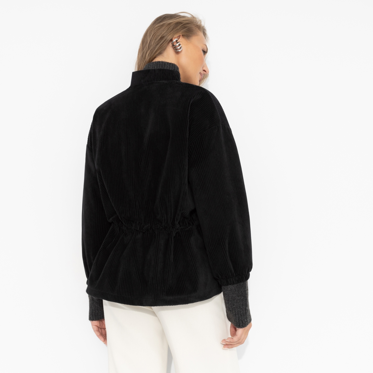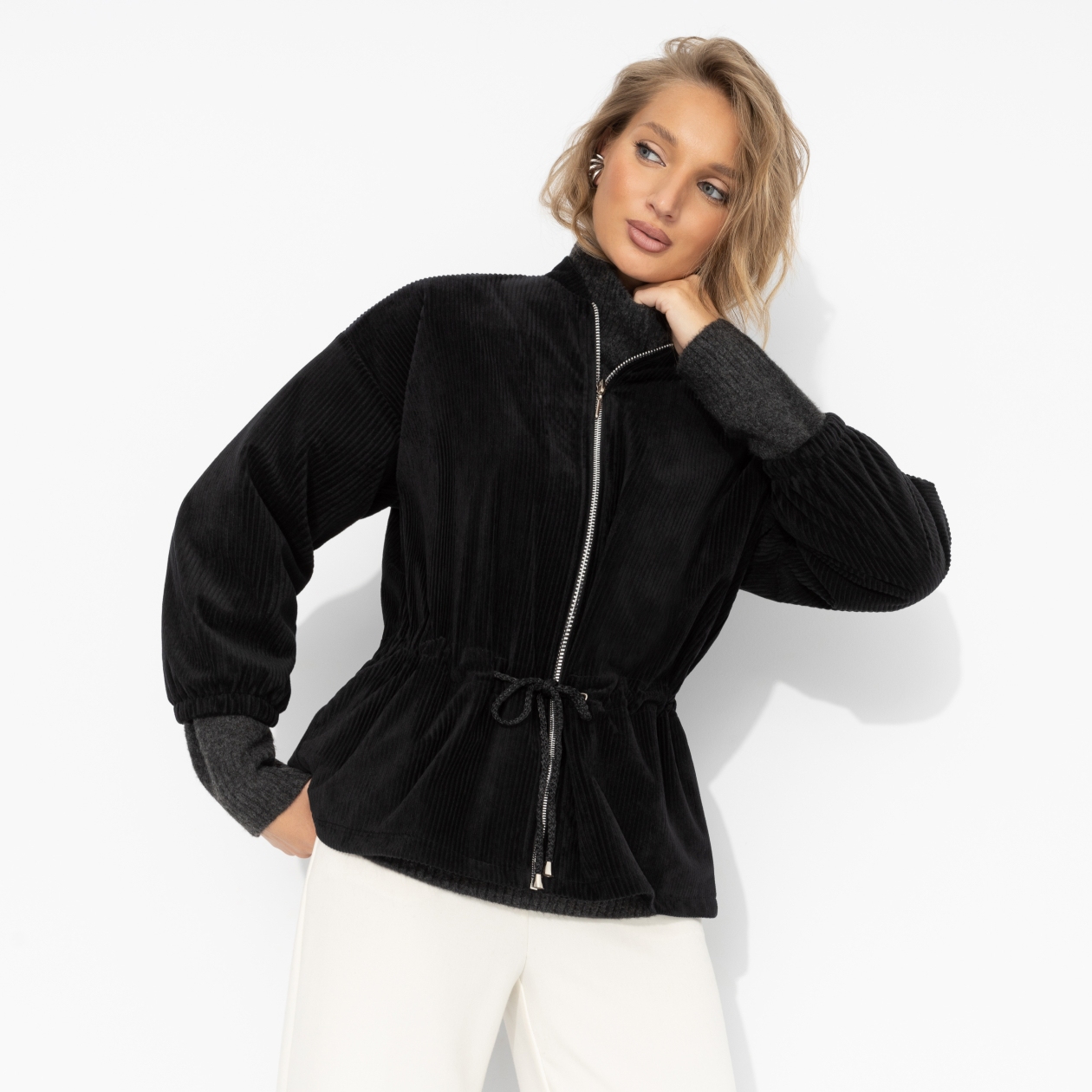 Фактурный бомбер сочетает мягкость и силу. Лаконичный чёрный, акцент на линии талии, блеск молнии – детали делают образ завершённым. Ты выбираешь – а мир подстраивается. Бомбер выполнен из мягкого трикотажа «велюр» с бархатистой поверхностью, которая красиво отражает свет и сохраняет форму. Центральная молния придаёт модели современный ритм, а регулируемая кулиска на талии позволяет варьировать силуэт от свободного до подчеркнуто женственного.