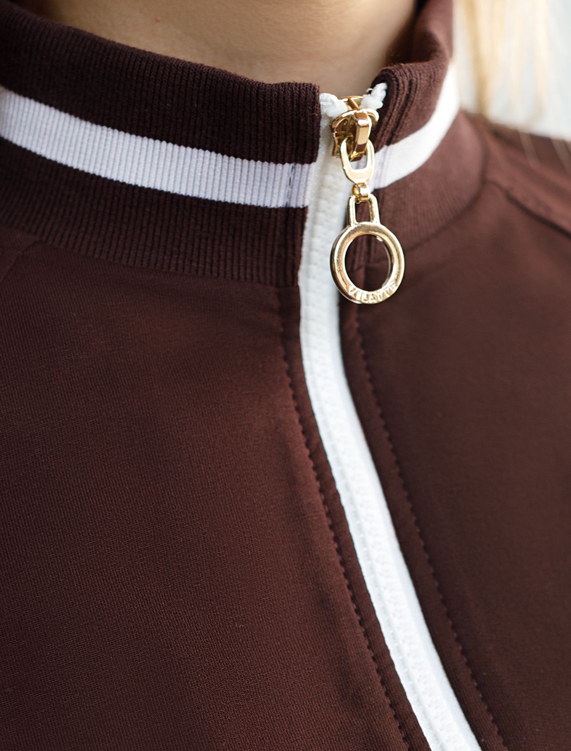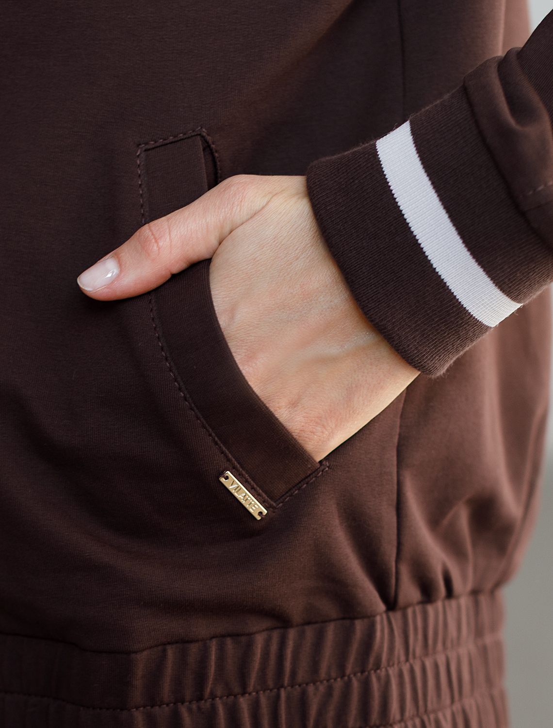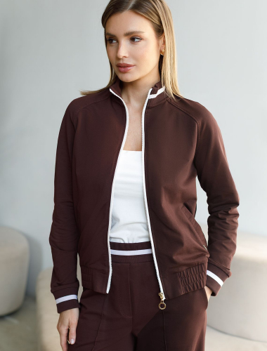 Бомбер коричневого цвета среднего объема с застежкой на молнию выполнен из премиального футера двухнитки плотностью 240 Г/м2. Натуральный состав ткани обеспечивает дышащий эффект, мягкость и приятные тактильные ощущения, Эластичный материал позволяет свободно двигаться без стеснения, а также отлично сохраняет форму даже после длительного ношения. Гладкая лицевая сторона придает бомберу опрятный и дорогой вид. Повседневный бомбер отличается аккуратным силуэтом без лишнего объема и универсальной длиной, которая идеально подходит для повседневного образа. Манжеты на рукавах и широкая резинка по низу обеспечивают надежную посадку, сохраняя тепло в прохладную летнюю погоду. Особенность бомбера - контрастные канты на горловине и манжетах, которые добавляют современный акцент и делают его более выразительным. Представленная размерная линейка позволяет подобрать оптимальный вариант для любой фигуры и размера, на маленький или плюс сайз, обеспечивая свободу движений без компромиссов по стилю. Этот легкий бомбер станет отличным дополнением к базовому или спортивному гардеробу, сочетая практичность и стиль.