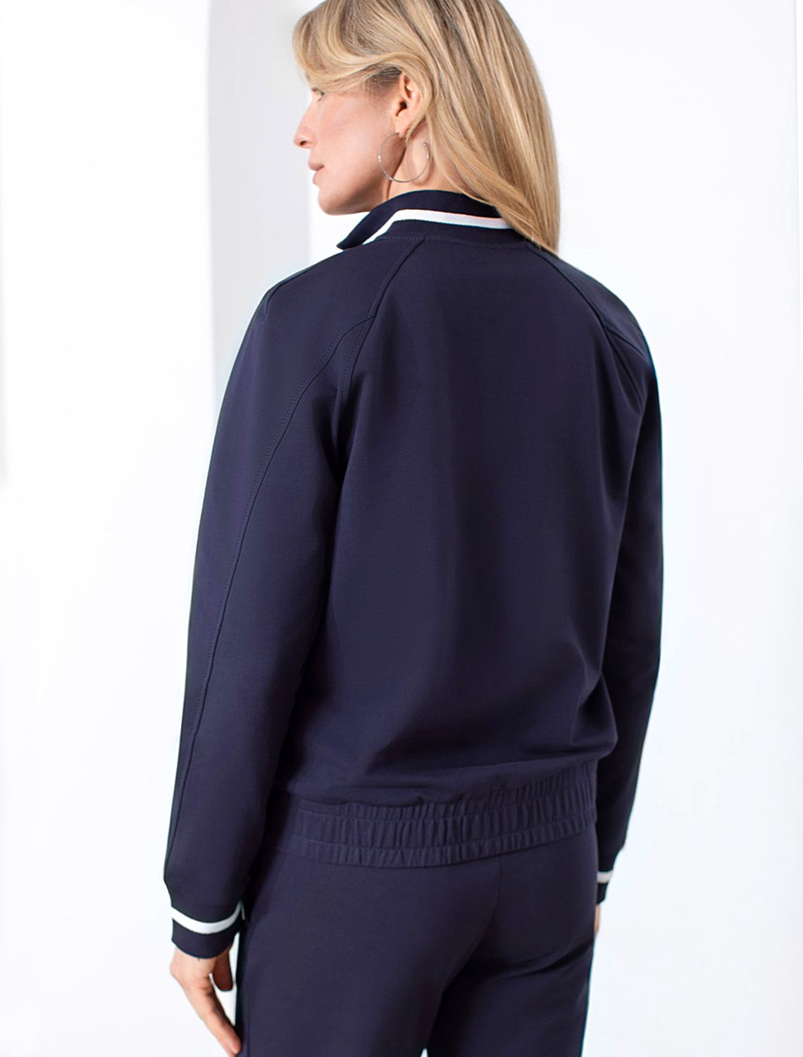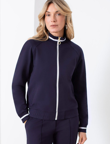 Бомбер темно-синего цвета среднего объема с застежкой на молнию выполнен из премиального футера двухнитки плотностью 240 Г/м2. Натуральный состав ткани обеспечивает дышащий эффект, мягкость и приятные тактильные ощущения, Эластичный материал позволяет свободно двигаться без стеснения, а также отлично сохраняет форму даже после длительного ношения. Гладкая лицевая сторона придает бомберу опрятный и дорогой вид. Повседневный бомбер отличается аккуратным силуэтом без лишнего объема и универсальной длиной, которая идеально подходит для повседневного образа. Манжеты на рукавах и широкая резинка по низу обеспечивают надежную посадку, сохраняя тепло в прохладную летнюю погоду. Особенность бомбера - контрастные канты на горловине и манжетах, которые добавляют современный акцент и делают его более выразительным. Представленная размерная линейка позволяет подобрать оптимальный вариант для любой фигуры и размера, на маленький или плюс сайз, обеспечивая свободу движений без компромиссов по стилю. Этот легкий бомбер станет отличным дополнением к базовому или спортивному гардеробу, сочетая практичность и стиль.